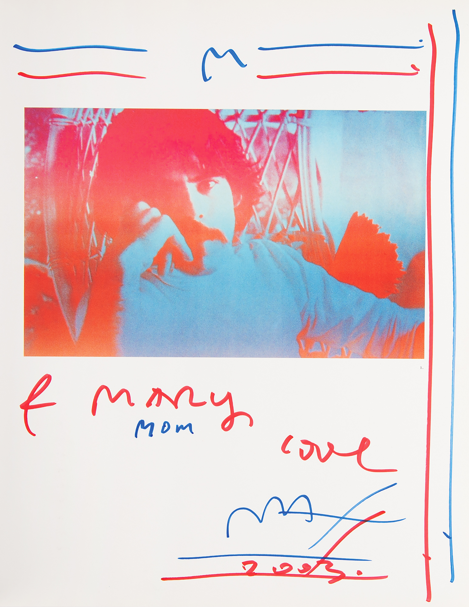 Signed book: The Art of Peter Max. First edition, first printing. NY: Harry N. Abrams, 2002. Hardcover with dust jacket, 10.5 x 12.25, 240 pages. Signed and inscribed on the title page in blue and red felt tip, "Mary, Mom, Love, Max, 2003." He sketches lines in the margins surrounding his portrait, and adds a large "M" to the facing page. In fine condition.
