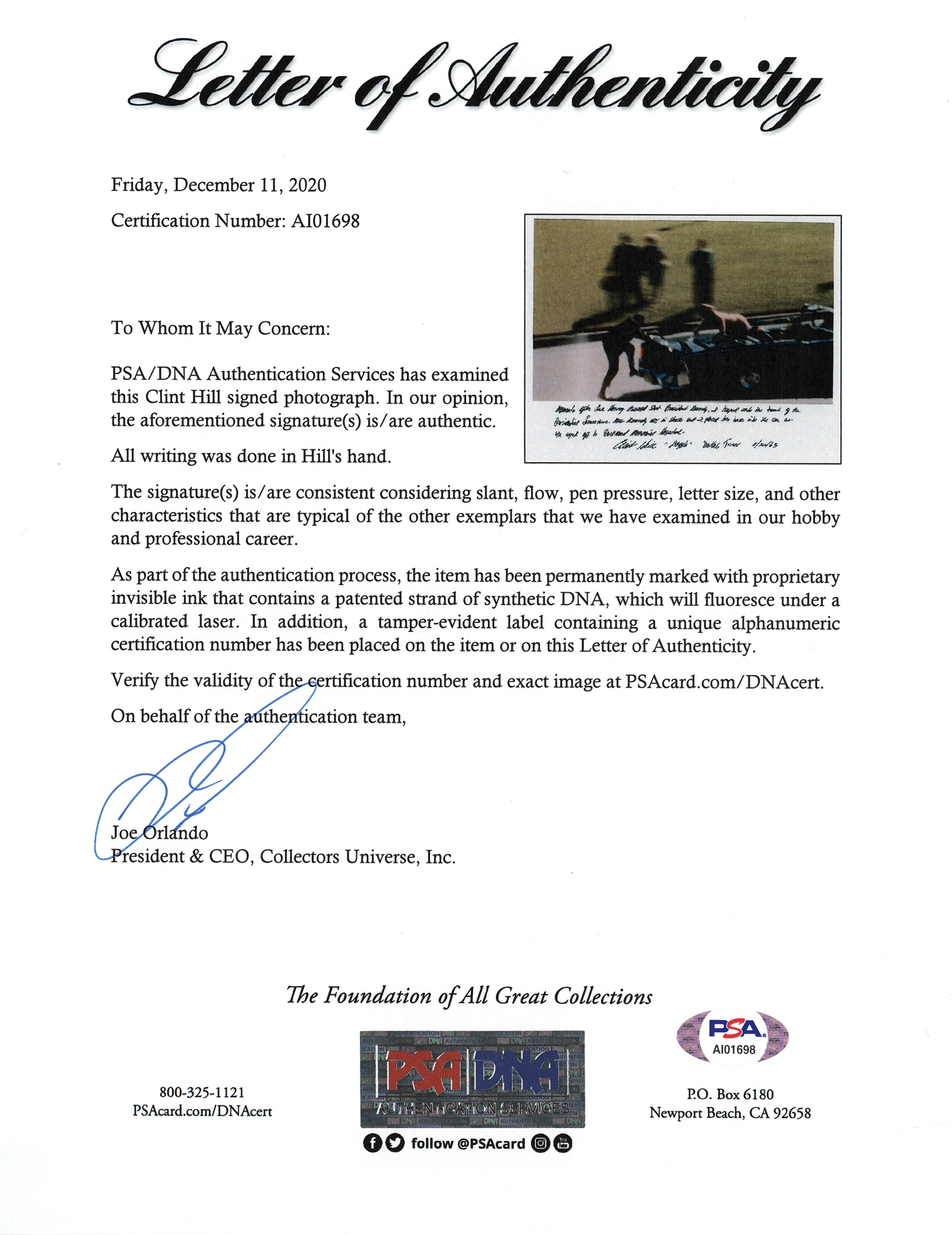 Color semi-glossy 14 x 11 photo of Hill climbing the back of the presidential limousine after President Kennedy was shot by an assassin's bullet, signed in the lower border in black ink, "Moments after Lee Harvey Oswald shot President Kennedy, I leaped onto the trunk of the Presidential Limousine. Mrs. Kennedy was in shock and I placed her back into the car as we sped off to Parkland Memorial Hospital. Clint Hill, 'Dazzle,' Dallas, Texas, 11/22/63." In very fine condition. Accompanied by a full letter of authenticity from PSA/DNA.