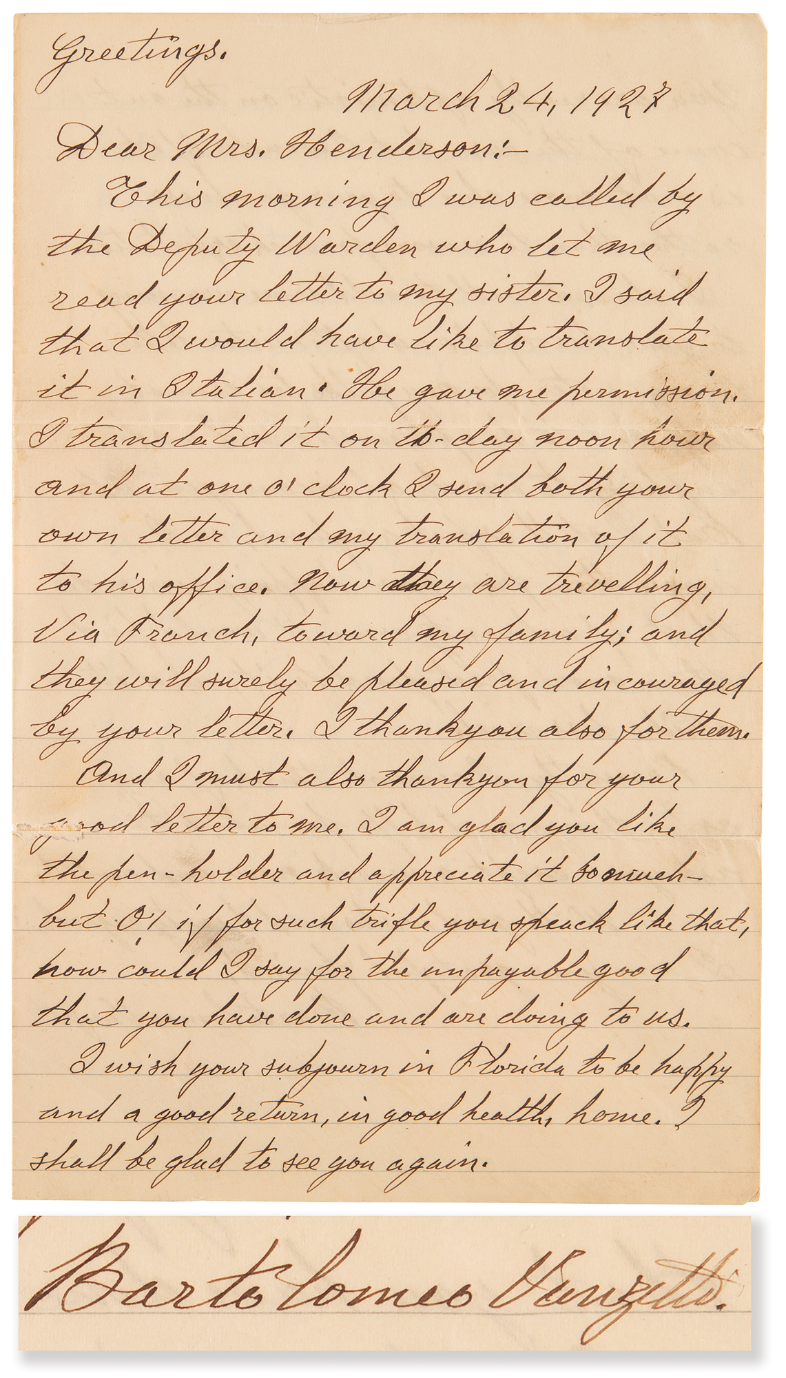 ALS, one page both sides, 6 x 9.5, March 24, 1927. Handwritten letter from Bartolomeo Vanzetti while imprisoned in Dedham Jail, sent to supporter Jessica L. Henderson of Wayland, Massachusetts, in full (grammar and spelling retained): “This morning I was called by the Deputy Warden who let me read your letter to my sister. I said that I would have like to translate it in Italian. He gave me permission. I translated it on to-day noon hour and at one o’clock I send both your own letter and my translation of it to his office. Now they are travelling, Via Franch, toward my family; and they will surely be pleased and incouraged by your letter. I thank you also for them.