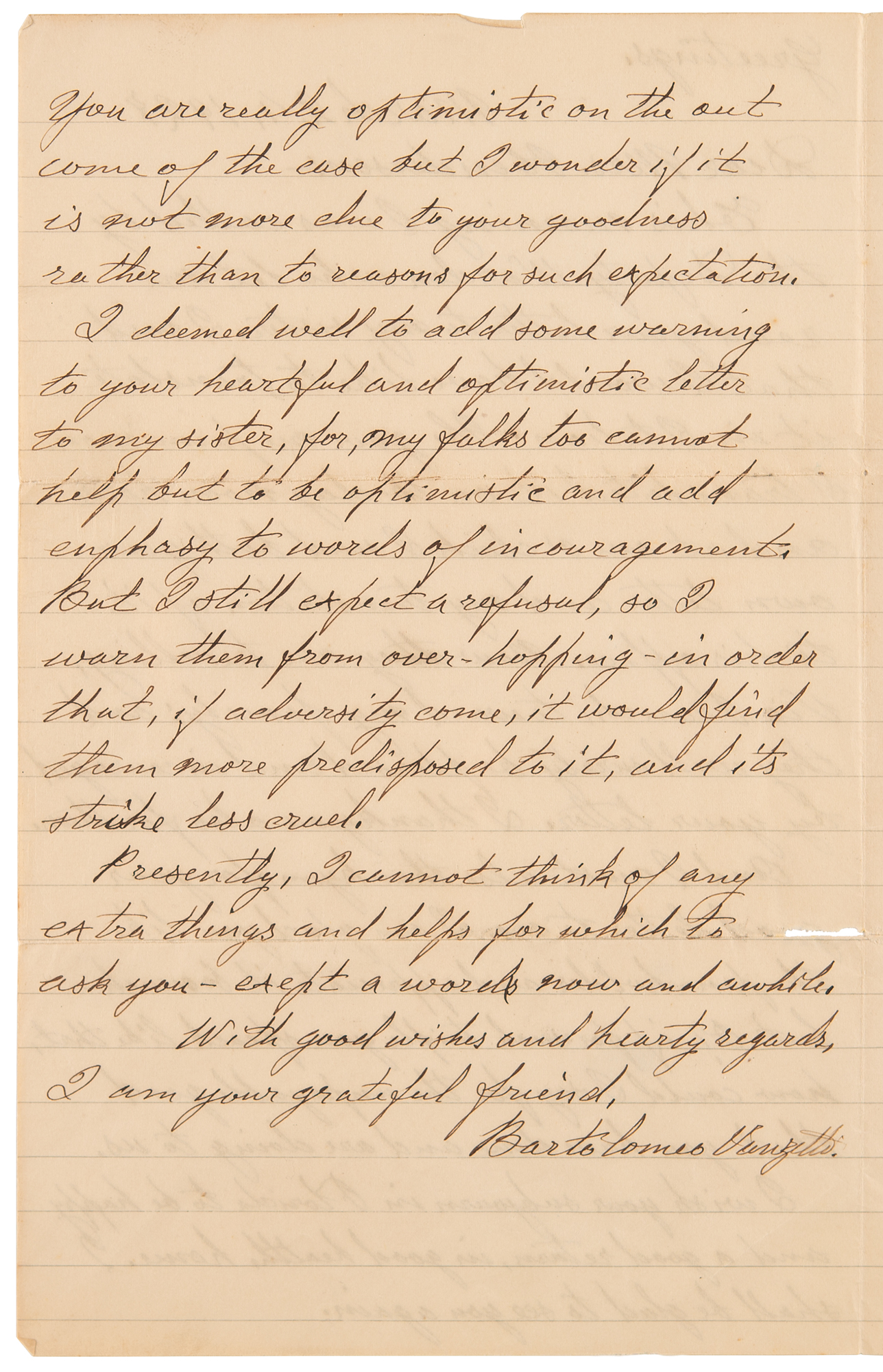 You are really optimistic on the outcome of the case but I wonder if it is not more due to your goodness rather than to reasons for expectation. I deemed well to add some warning to your heartful and optimistic letter to my sister, for, my folks too cannot help but to be optimistic and add enphasy to words of incouragement. But I still expect a refusal, so I warn them from over-hopping – in order that, if adversity come, it would find them more predisposed to it, and its strike less cruel. Presently, I cannot think of any extra things and helps for which to ask you – exept a word now and awhile. With good wishes and hearty regards, I am your grateful friend.” The adjacent integral page appears to contain handwritten pencil notations by a graphologist. In fine condition, with an inconsequential short edge tear.