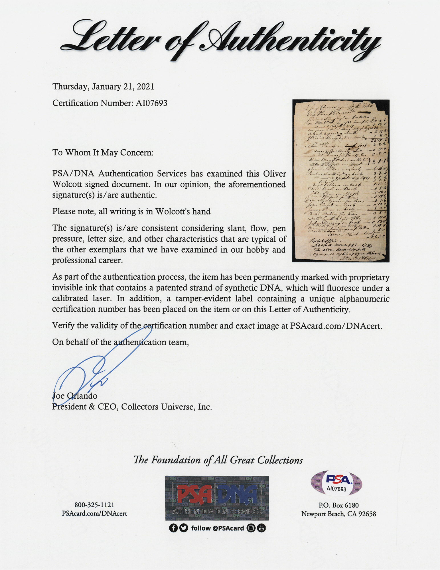 Signer of the Declaration of Independence from Connecticut (1726–1797) who commanded troops in the defense of New York during the American Revolution. ADS, signed “O. Wolcott,” one page, 7.25 x 12.75, March 19, 1789. Handwritten "List of Claims against the Estate [of] Ezra Plumb Deceased," recording amounts owed totaling £65.1.11 due to claimants including Jedidiah Strong, Ebenezer Plumb, Amos Galpin, Mary Stoddard, Samuel Sheldon, David Buel, Col. Timothy Skinner, James Stone, Richard Wallace, Nathaniel Smith, and others. Signed at the conclusion in ink at the Probate Office, Litchfield, "The above account of debts against the estate of Ezra Plumb, Allowed, O. Wolcott." In good to very good condition, with tape repairs to fold splits, paper loss to edges (repaired at lower left corner), and chipping to the edges impinging on the signature. Accompanied by a full letter of authenticity from PSA/DNA.