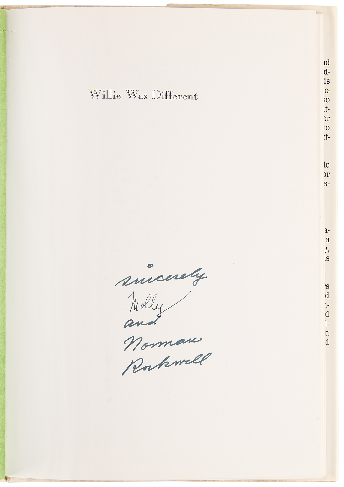 Signed book: Willie Was Different. Later printing. NY: Funk & Wagnalls, 1969. Hardcover with dust jacket, 7.25 x 10.25, 42 pages. Signed on the half-title page in black ink by Norman Rockwell and his wife, Molly. In fine condition, with an ownership notation to the inside front cover.