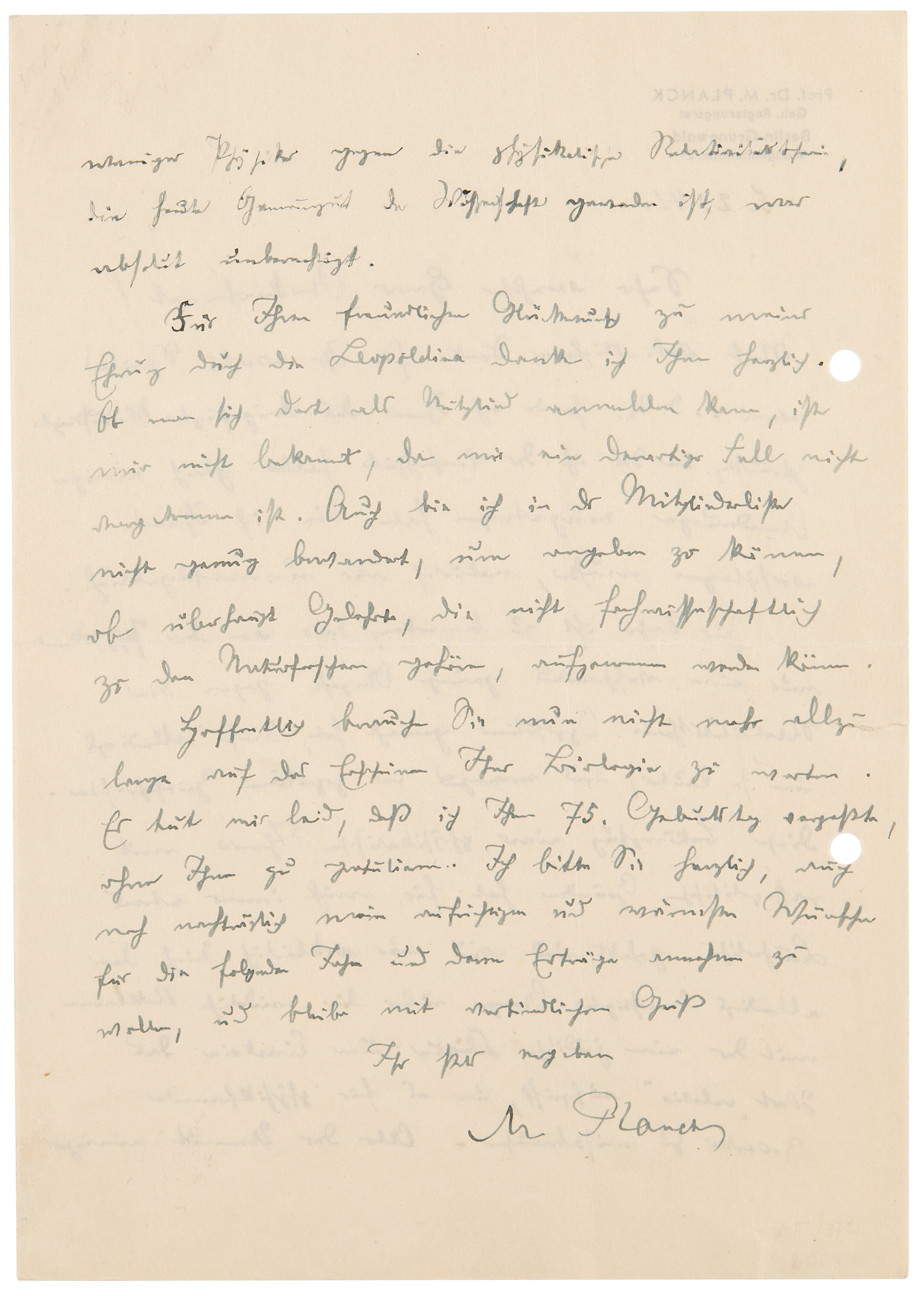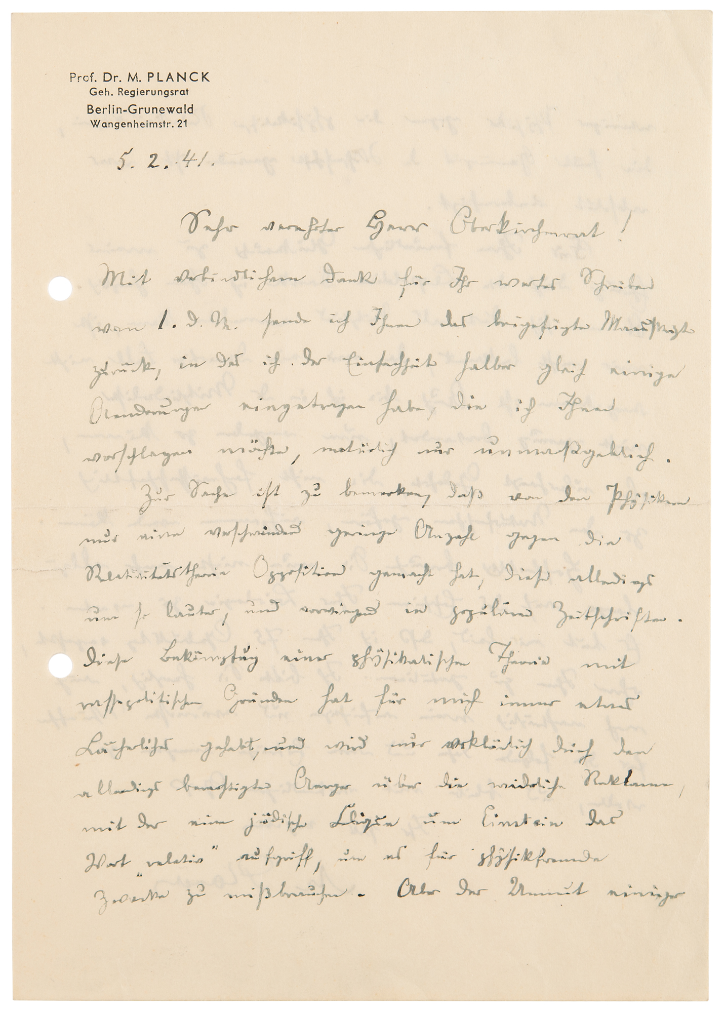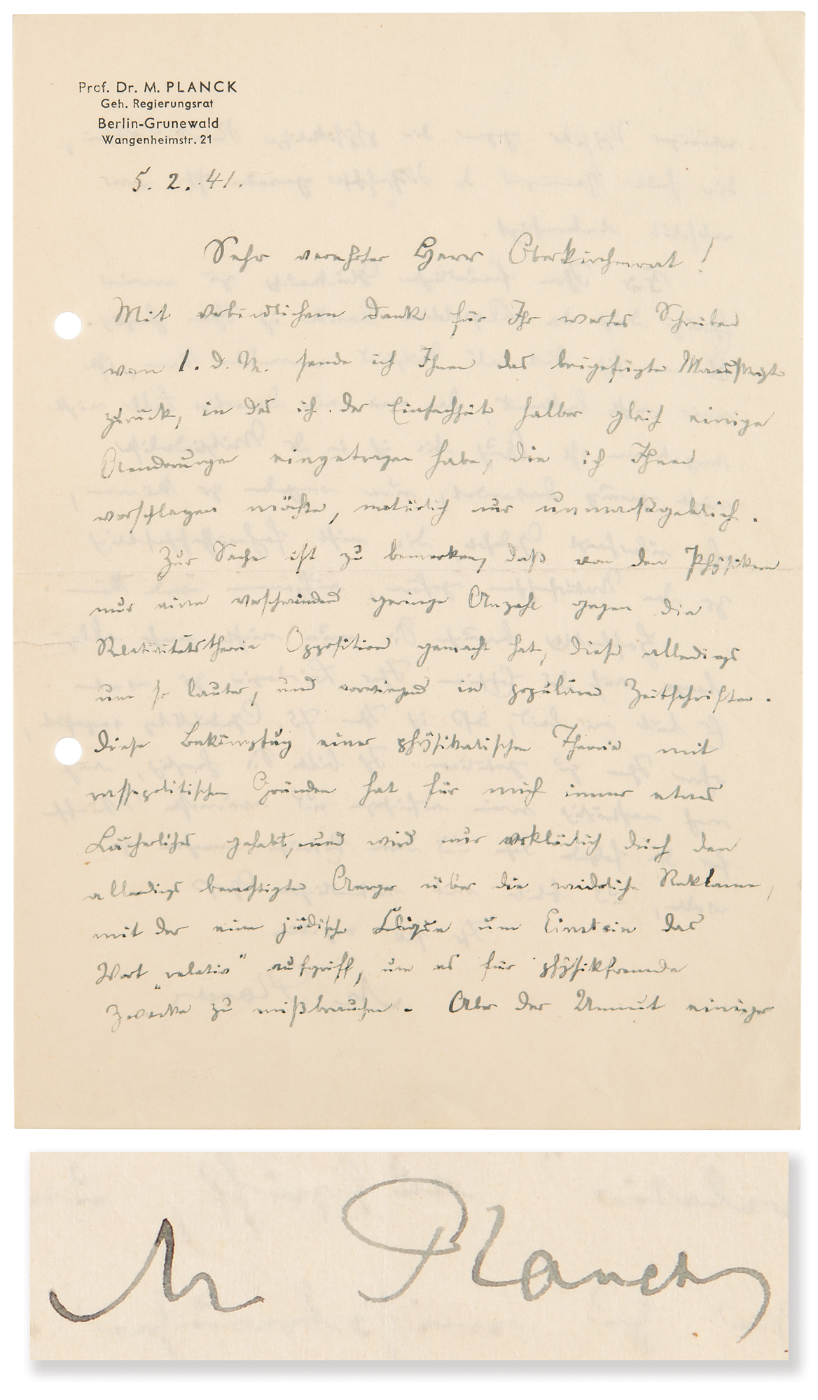 World War II-dated ALS in German, signed “M. Planck,” one page both sides, 5.75 x 8.25, personal 'Berlin-Grunewald' letterhead, February 5, 1941. Handwritten letter to an unidentified church official, which finds the German physicist belittling Nazi efforts to discredit Einstein's theory of relativity, in part (translated): “Regarding this question, it should be noted that only a tiny number of physicists have opposed the theory of relativity, although this has been all the louder, and mainly in popular newspapers. This attack on a scientific theory for popular political reasons has always had something ridiculous for me.” Planck’s thoughts then veer towards antisemitism when he notes that the attacks are “only explicable by justifiable anger at the disgustingly public way in which a Jewish clique around Einstein took up the word 'relative' and misused it for purposes unrelated to physics. But the attack by a few physicists on the scientific theory of relativity, which has become fundamental to science today, was absolutely unjustified.” In fine condition, with two file holes to the left edge. A daring statement made during a period of extreme political repression, Planck both criticizes attacks borne of antisemitism, while engaging in the act himself.