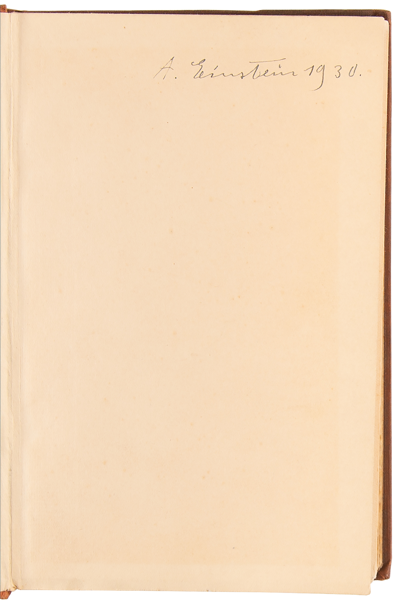 Signed book: The Meaning of Relativity: Four Lectures Delivered at Princeton University, May 1921, by Albert Einstein, translated by Edwin Plimpton Adams. First edition. London: Methuen & Co., 1922. Hardcover, 5.25 x 7.75, 123 pages. Signed on the first free end page in fountain pen, "A. Einstein, 1930." Autographic condition: fine, with a faint block of toning to the signed page. Book condition: VG/None, with uneven sunning to boards and spine, a bit of rubbing and soiling, and slightly bumped corners; the binding remains tight and square.