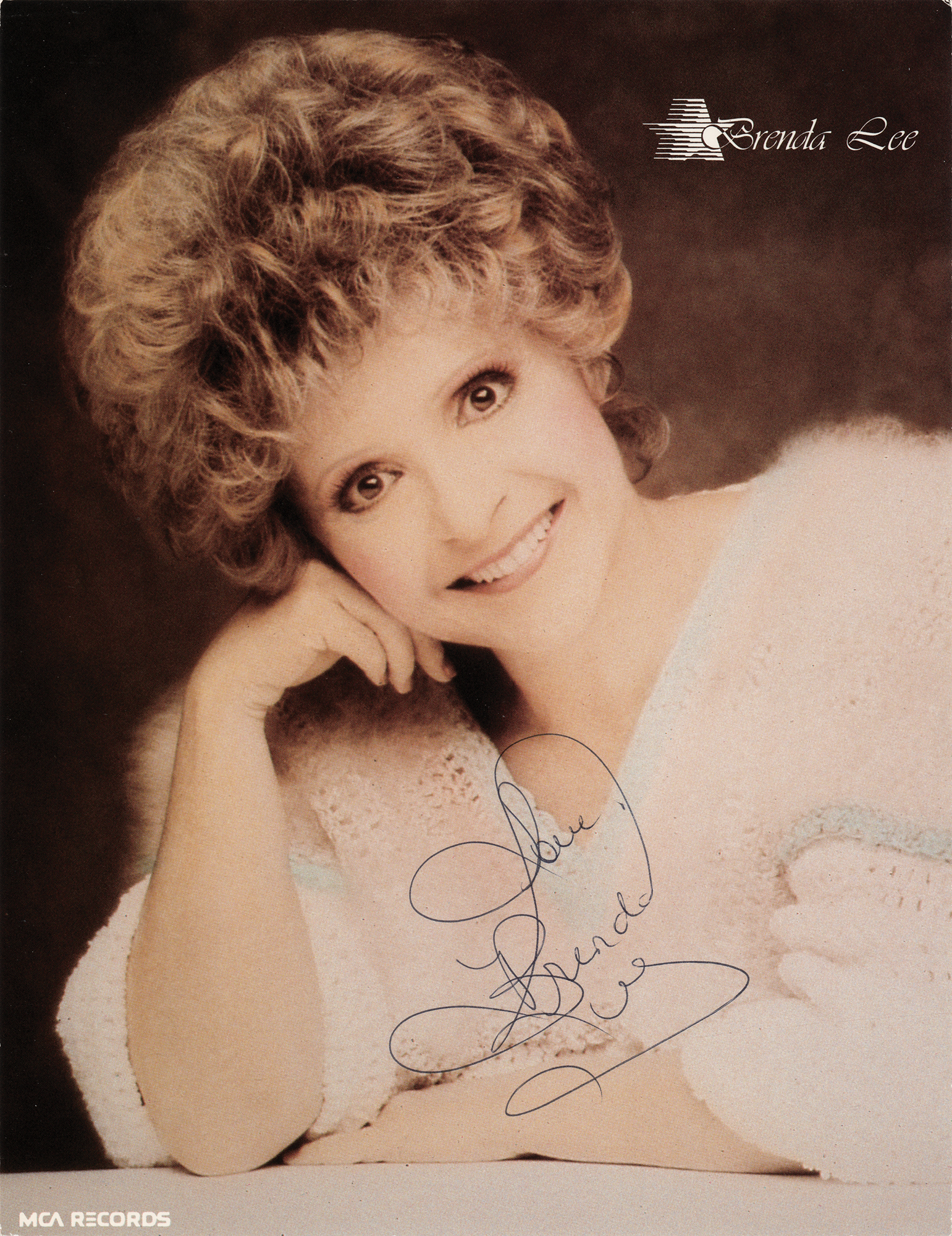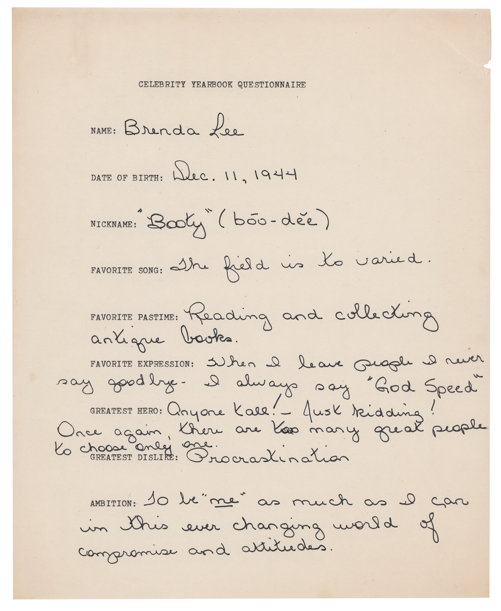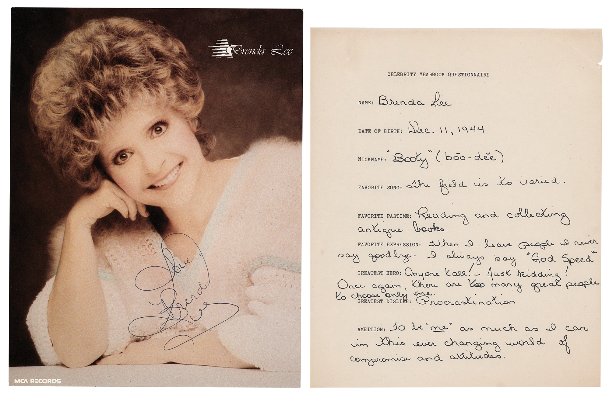 Two items signed by Lee: a cardstock 8.5 x 11 MCA Records promo photo of the popular singer, signed in black ballpoint, "Love, Brenda Lee"; and a questionnaire filled out and signed by Lee, "Brenda Lee," one page, 8.5 x 11, no date but circa late 1970s, responding to inquiries related to an unpublished 'Celebrity Yearbook.' The singer fills out her date of birth ("Dec. 11, 1944"), nickname ("'Booty' (boo-dee)"), favorite pastime ("Reading and collecting antique books"), favorite expression ("When I leave people I never say good bye—I always say 'God Speed'"), greatest dislike ("Procrastination"), and ambition ("To be 'me' as much as I can in this ever changing world of compromise and attitudes"). In overall fine condition
