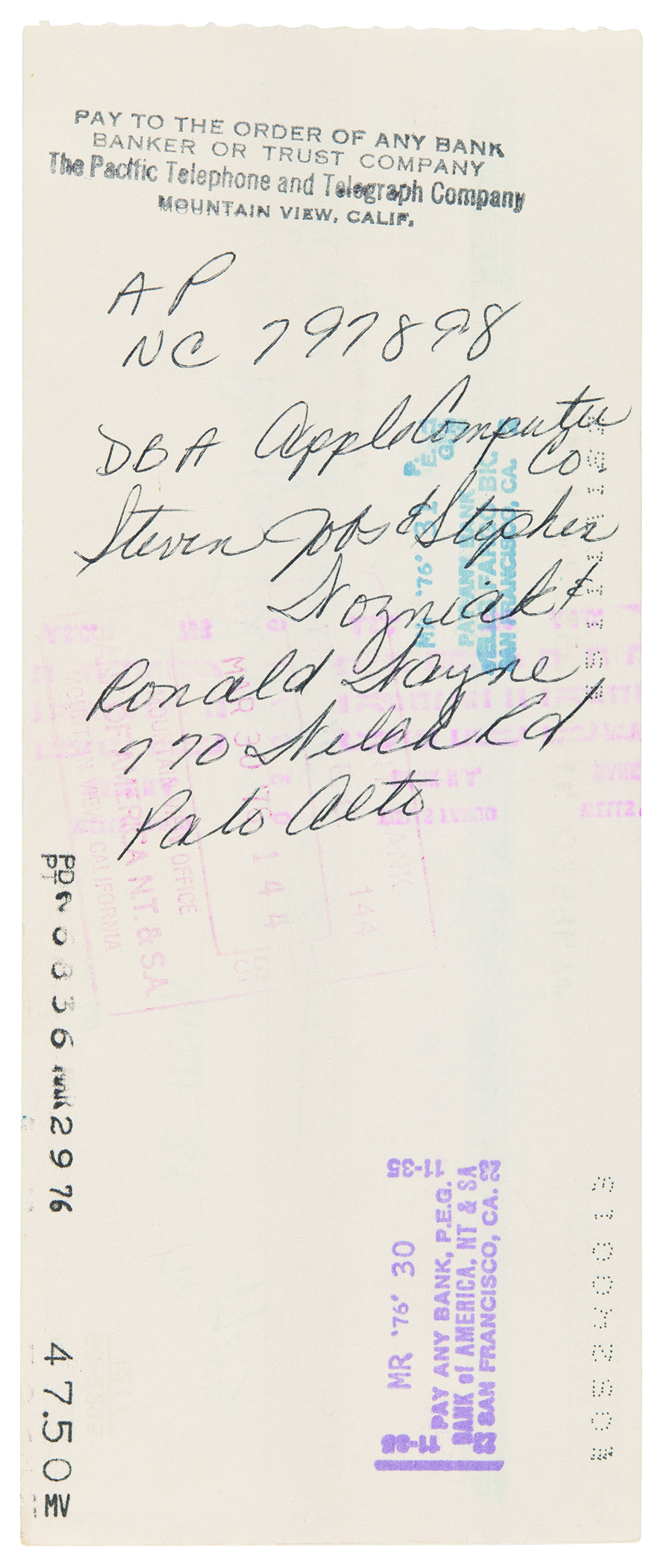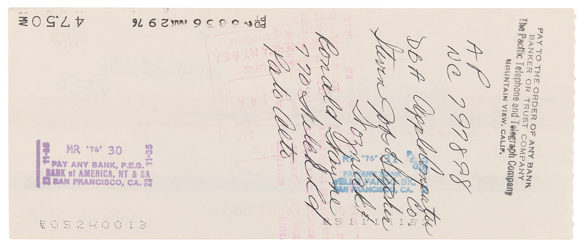 Wells Fargo bank check, 7.5 x 3, filled out and signed by Steve Jobs, "steven jobs," payable to Pacific Telephone for $47.50, March 28, 1976. This temporary check, issued upon opening Apple's first bank account, bears the same routing and account numbers as other early Apple Computer Company checks we have offered – most of those, however, date to July 1976 and are imprinted with Apple's first official address at '770 Welch Rd., Ste. 154, Palo Alto' – the location of an answering service and mail drop that they used while still operating out of the famous Jobs family garage. That very address has been annotated on the check’s reverse in the hand of a bank teller, who also writes the name of the company’s three founders: “DBA Apple Computer Co., Steven Jobs & Stephen Wozniak & Ronald Wayne, 770 Welch Rd., Palo Alto.” In fine condition.