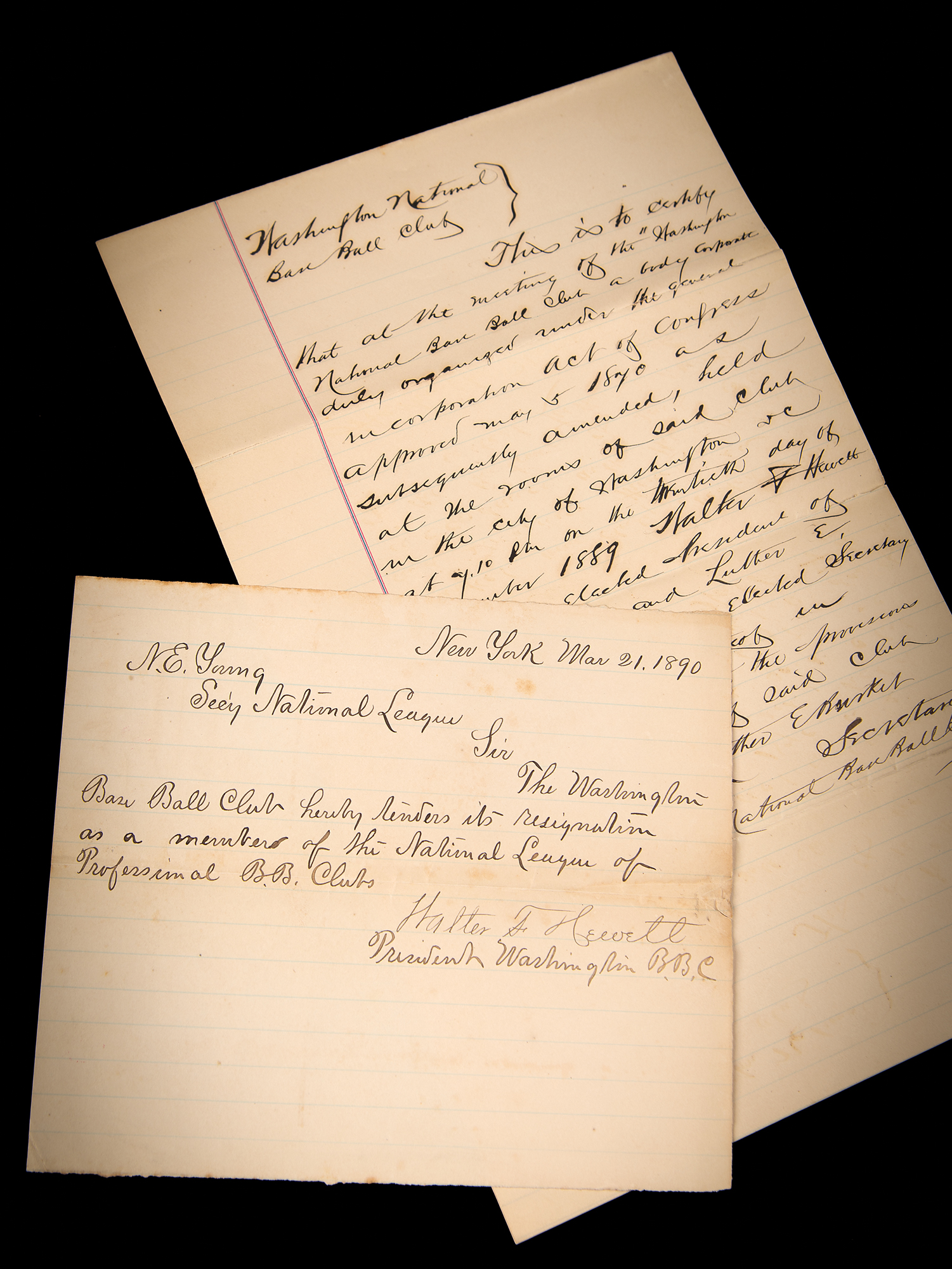 Rare, early professional baseball documents from D.C.'s defunct first franchise: "The Washington Base Ball Club hereby tenders its resignation as a member of the National League of Professional B. B. Clubs"