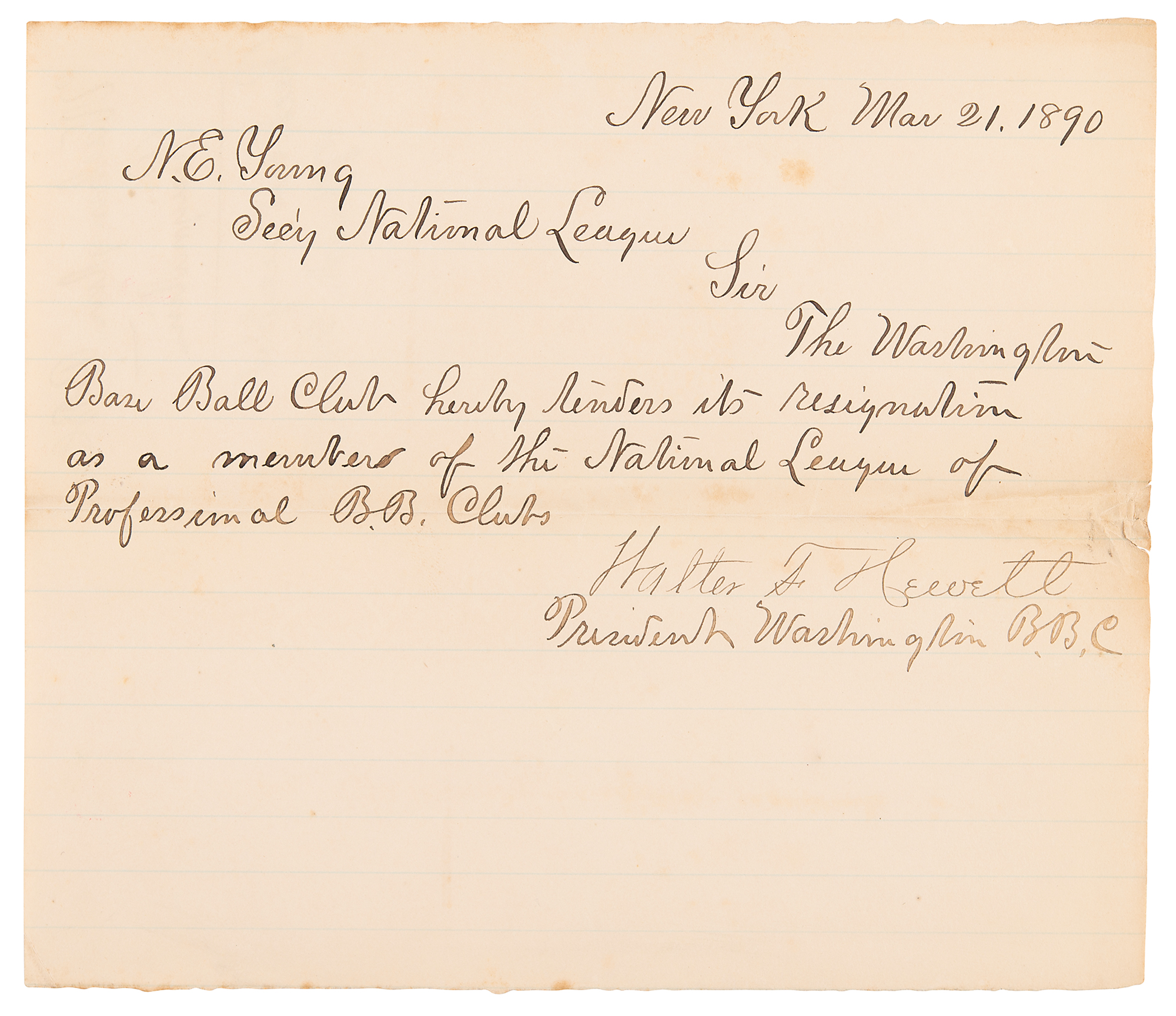 LS signed "Walter F. Hewett," one page, 7.5 x 6.5, March 21, 1890. Penned in the hand of pioneering baseball executive Nicholas Ephraim Young, and addressed to him as "N. E. Young, Sec'y National League," a letter withdrawing the Washington National Baseball Club from the league. In full: "The Washington Base Ball Club hereby tenders its resignation as a member of the National League of Professional B. B. Clubs." Hewett was also manager of the club for part of the 1888 season, leading them to a 10-29 record over 40 games (with one tie).