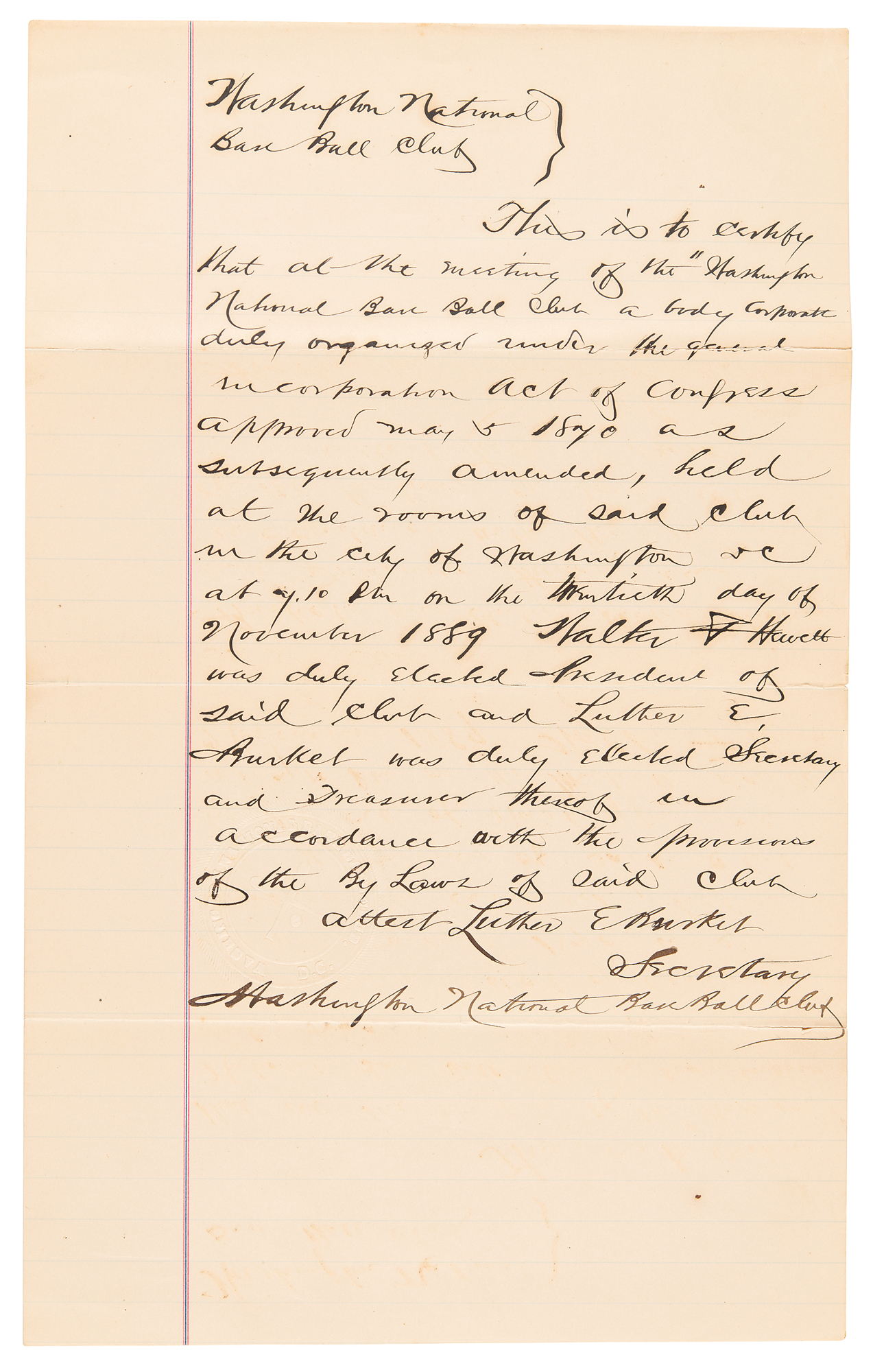 ADS signed "Luther E. Burket, Secretary, Washington National Base Ball Club," one page, 7.75 x 12.5, November 20, 1889. In part: "This is to certify that at the meeting of the 'Washington National Base Ball Club'…held at the rooms of said club in the city of Washington, D.C….on the twentieth day of November 1889 Walter F. Hewett was duly elected President of said club and Luther E. Burket was duly elected Secretary and Treasurer." Embossed at the lower left with the seal of the "Washington National Base Ball Club," featuring crossed bats at the center.