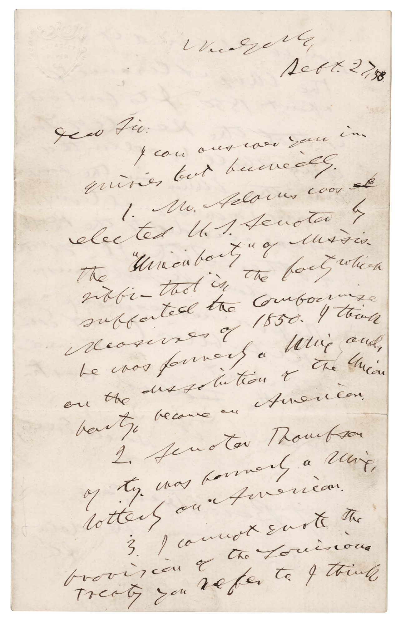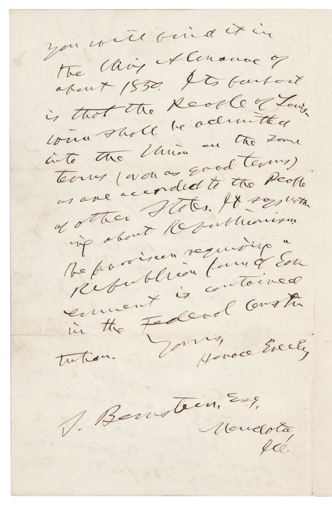 Founder and editor of the New York Tribune (1811-1872) who used the power of his newspaper to advocate for a variety of liberal causes, most importantly the call for emancipation of slaves during the Civil War. ALS, one page both sides, 5 x 8, September 27, 1858. Addressed from New York, a handwritten letter to a gentleman by the name of “Bernstein,” answering a set of questions, in part: “1. Mr. Adams was elected U.S. Senator by the ‘Union Party’ of Mississippi – that is, the party which supported the Compromise Measures of 1850. I think he was formerly a Wig and, on the dissolution of the Union Party, became an American. 2. Senator Thompson of Ky. was formerly a Wig… 3. I cannot quote the provision of the Louisiana Treaty you refer to. I think you will find it in the Wig Almanac of about 1850. Its purport is that the people of Louisiana shall be admitted into the Union on the same terms…as are accorded to the people or other states. It says nothing about Republicanism. The provision requiring a Republican form of government is contained in the Federal Constitution.” In fine condition.