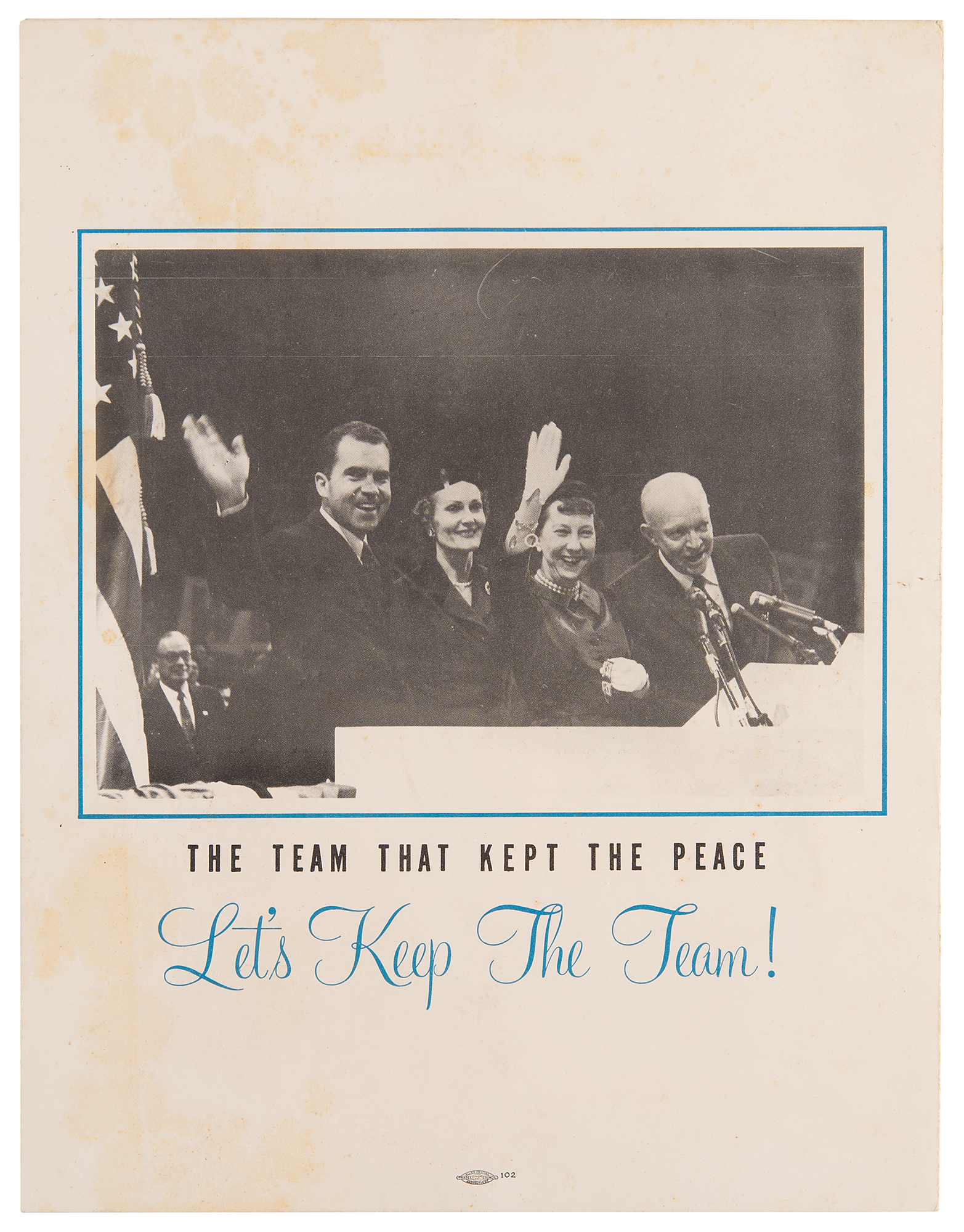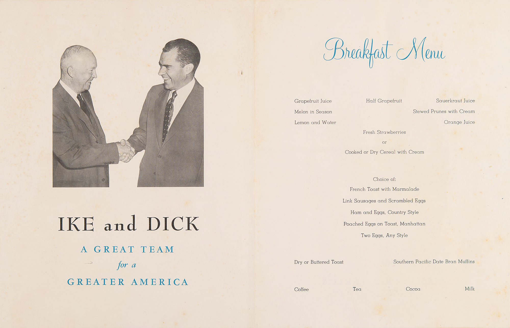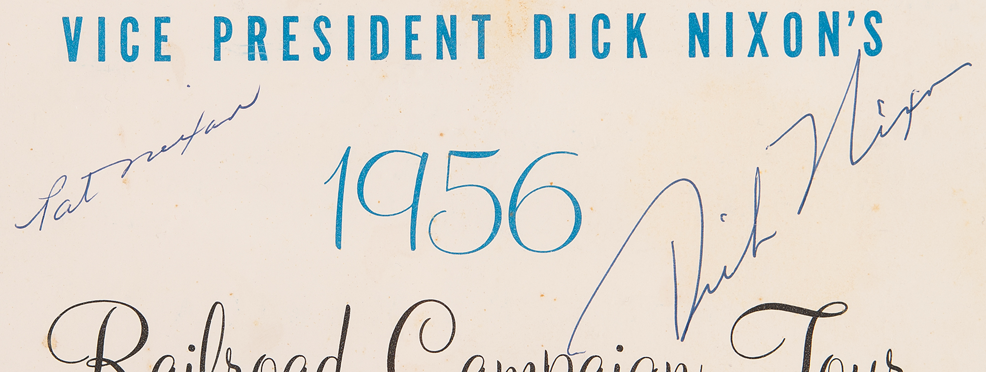 Original bi-fold ‘campaign souvenir’ menu for “Vice President Dick Nixon’s 1956 Railroad Campaign Tour,” 8.5 x 11, featuring a front cover image of Richard and Pat Nixon with their daughters, Tricia and Julie, signed on the cover in ballpoint, “Dick Nixon” and “Pat Nixon.” In very good to fine condition, with light staining and general handling wear.