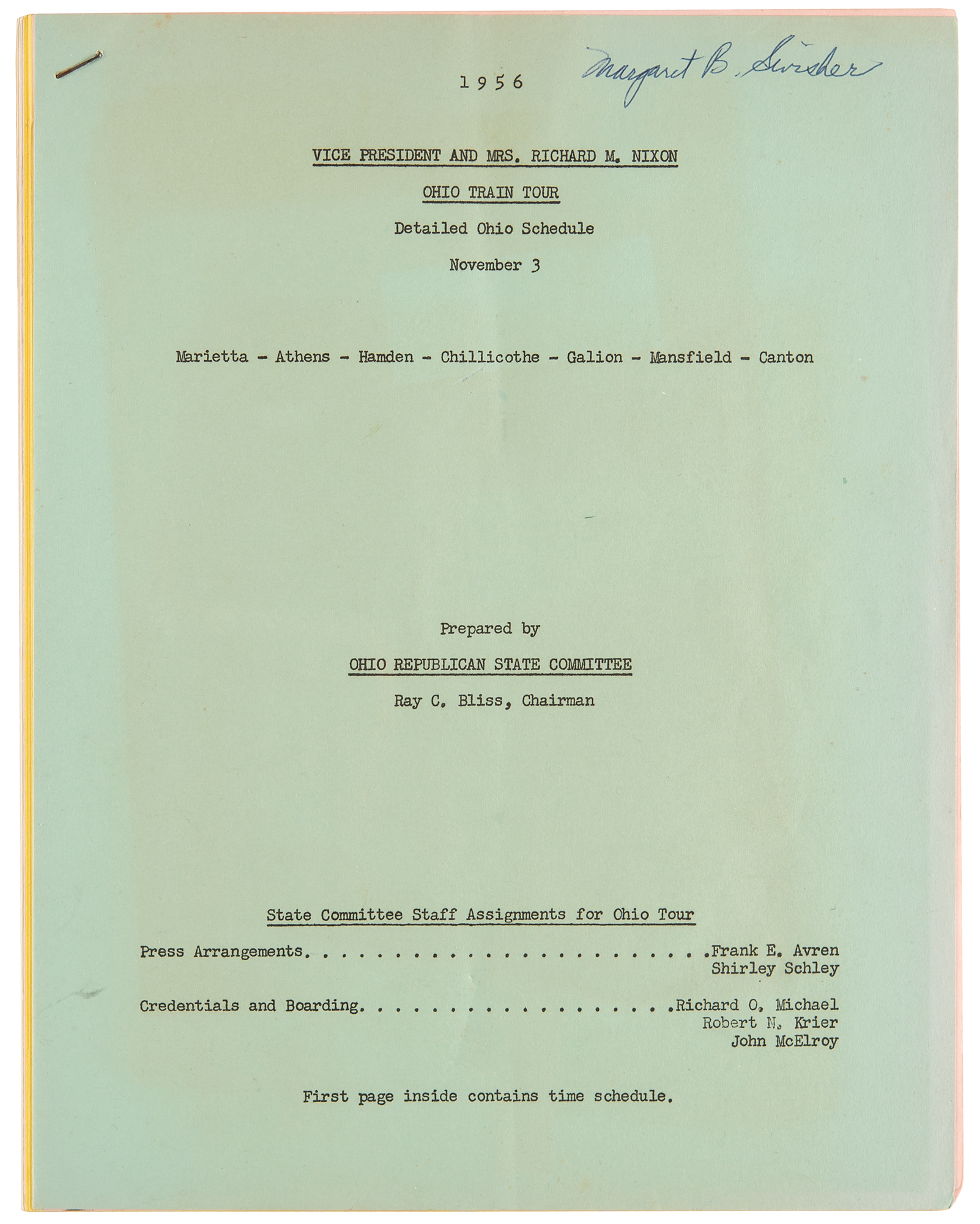 Accompanied by an original stapled itinerary for Nixon’s Ohio Train Tour on November 3, 1956, detailing Nixon’s scheduled nine stops, and an original mailing envelope from the Office of the Chairman Republican State Central and Executive Committee; both the itinerary and envelope are marked as belonging to Margaret B. Swisher, who writes in pencil on the envelope: “I was on train tour from Chillicothe to Cols. Pat Nixon gave me pencil.”