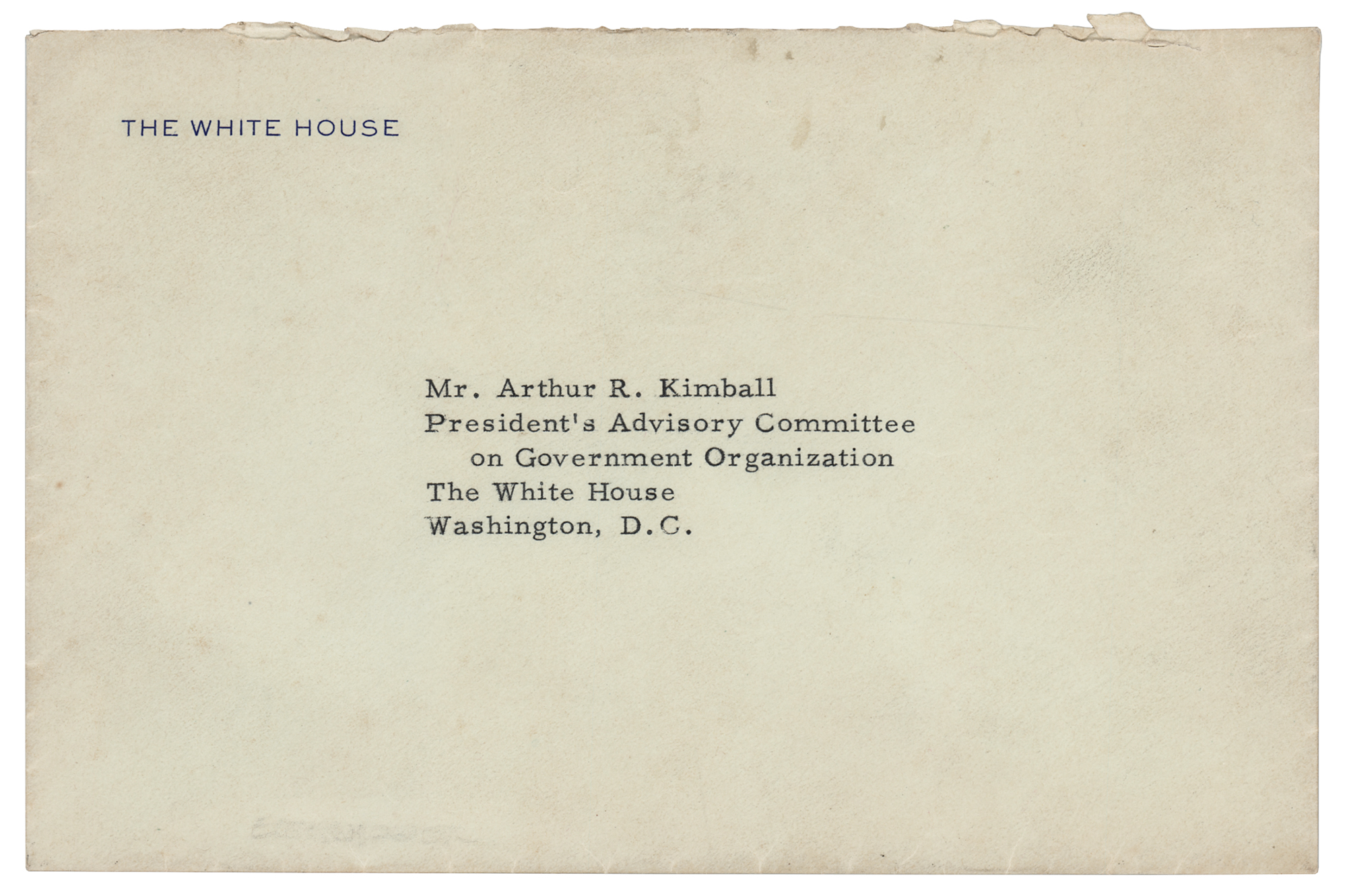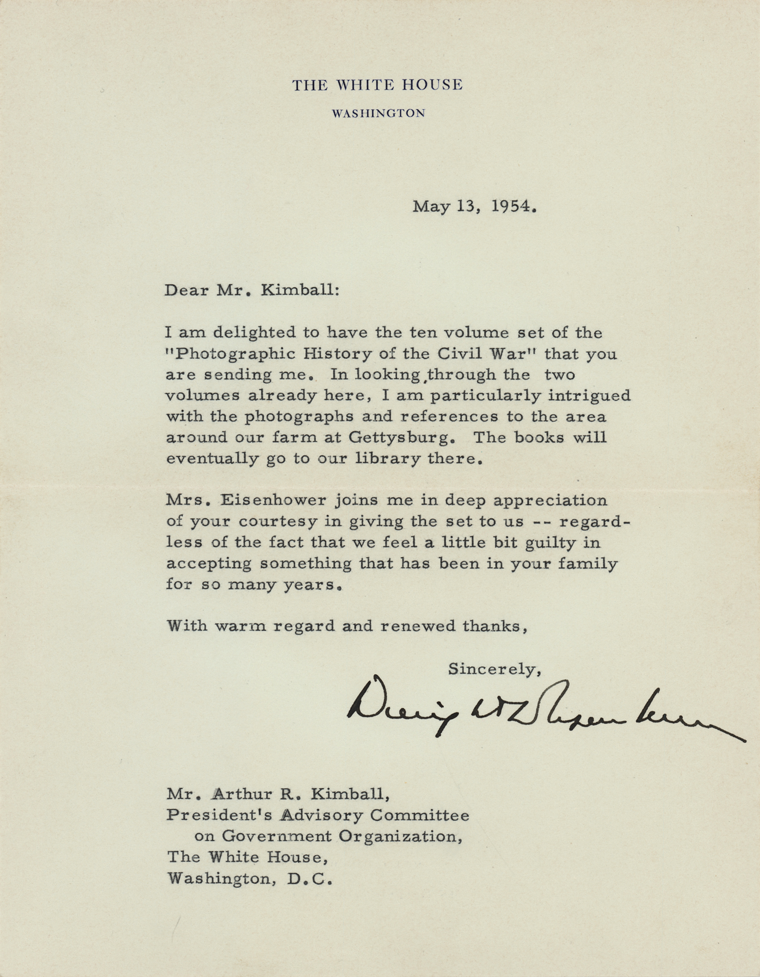 TLS as president, one page, 6.75 x 8.75, White House letterhead, May 13, 1954. Letter to Arthur R. Kimball of the President's Advisory Committee on Government Organization, in part: "I am delighted to have the ten volume set of the 'Photographic History of the Civil War' that you are sending me. In looking through the two volumes already here, I am particularly intrigued with the photographs and references to the area around our farm at Gettysburg. The books will eventually go to our library there. Mrs. Eisenhower joins me in deep appreciation of your courtesy in giving the set to us—regardless of the fact that we feel a little bit guilty in accepting something that has been in your family for so many years." In fine condition. Accompanied by the original White House transmittal envelope.