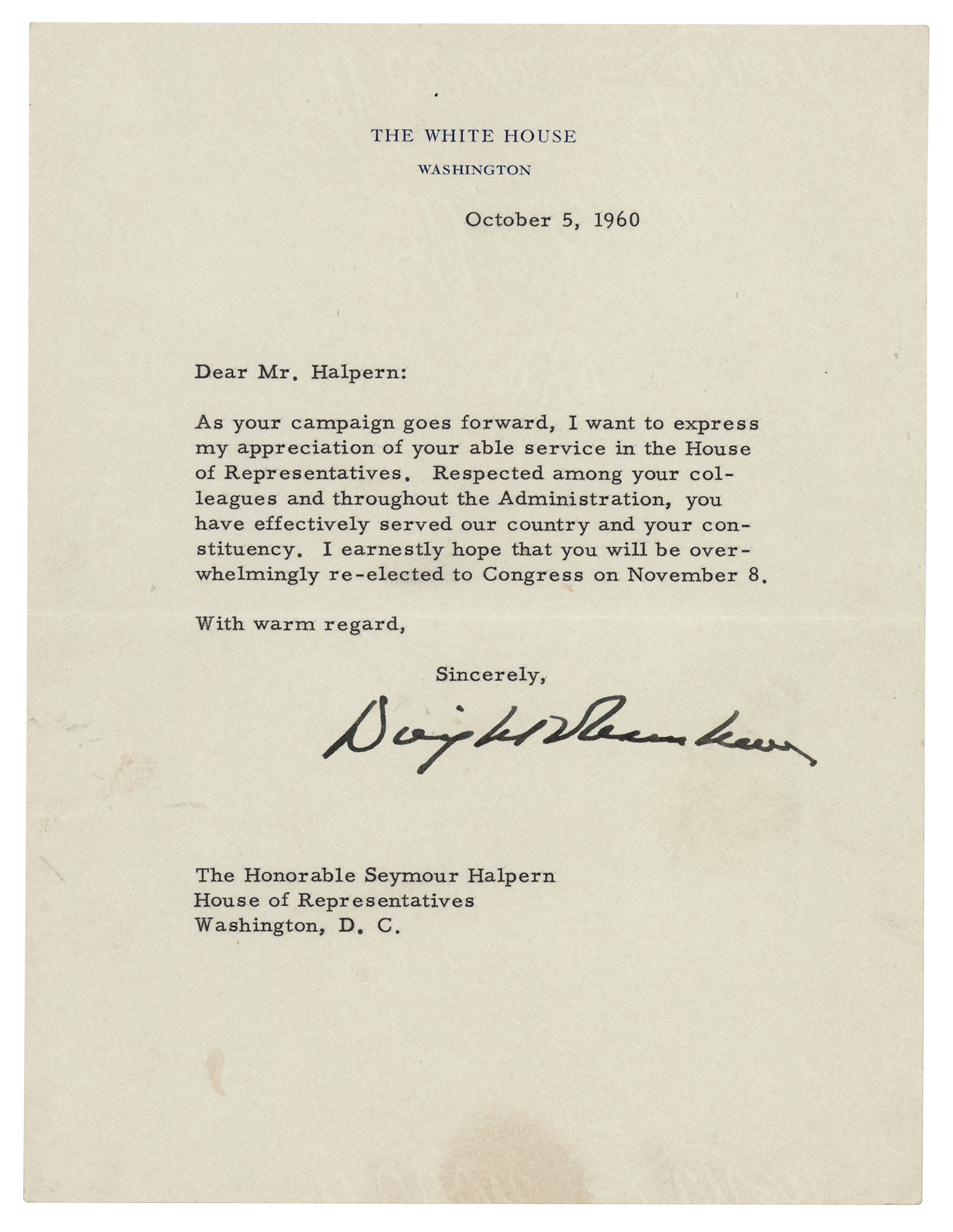 TLS as president, one page, 6.75 x 8.75, White House letterhead, October 5, 1960. Letter to the Hon. Seymour Halpern, a member of the House of Representatives from New York. In full: "As your campaign goes forward, I want to express my appreciation of your able service in the House of Representatives. Respected among your colleagues and throughout the Administration, you have effectively served our country and your constituency. I earnestly hope that you will be overwhelmingly re-elected to Congress on November 8." In fine condition, with faint stains in the lower blank area. Halpern indeed won reelection, serving in Congress until 1973.