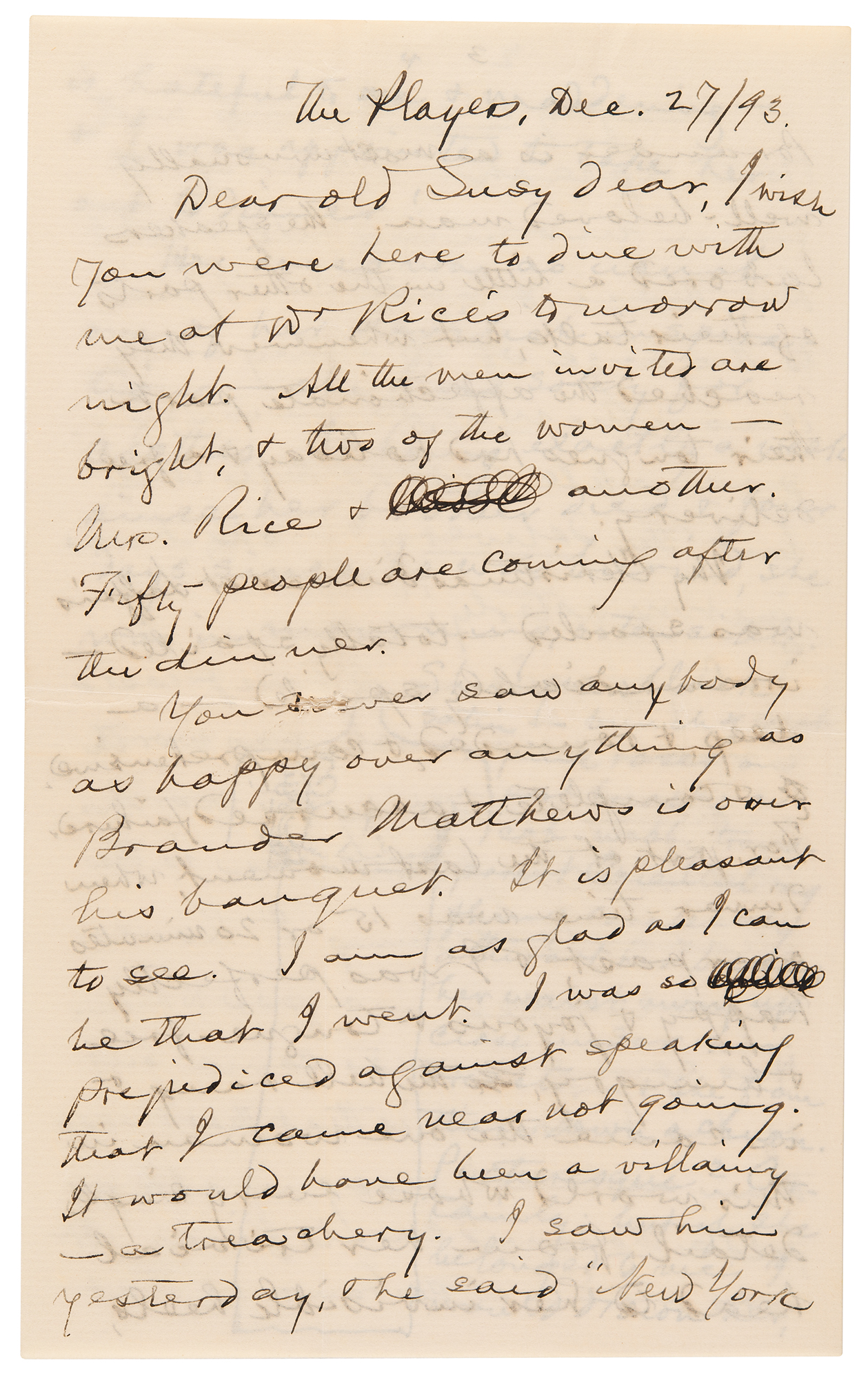 ALS signed “Lovingly, Papa,” eight pages on two sets of adjoining sheets, 4.75 x 7.75, December 27, 1893. Handwritten letter to his "Dear old Susy dear," his daughter Susy Clemens, humorously criticizing the wife of fellow writer Thomas Bailey Aldrich. In part: "I wish you were here to dine with me at Dr. Rice's tomorrow night. All the men invited are bright, & two of the women—Mrs. Rice & another. Fifty people are coming after the dinner…You never saw anybody as happy over anything as Brander Matthews is over his banquet. It is pleasant to see. I am as glad as I can be that I went. I was so prejudiced against speaking that I came near not going. It would have been villainy—a treachery. I saw him yesterday, & he said 'New York is simply resounding with your speech. I hear of it from morning till night. But those people can't rise to the size of it. They only know the words—unsurpassable words, that's true, but the delivery!—oh, it was just masterly!'"