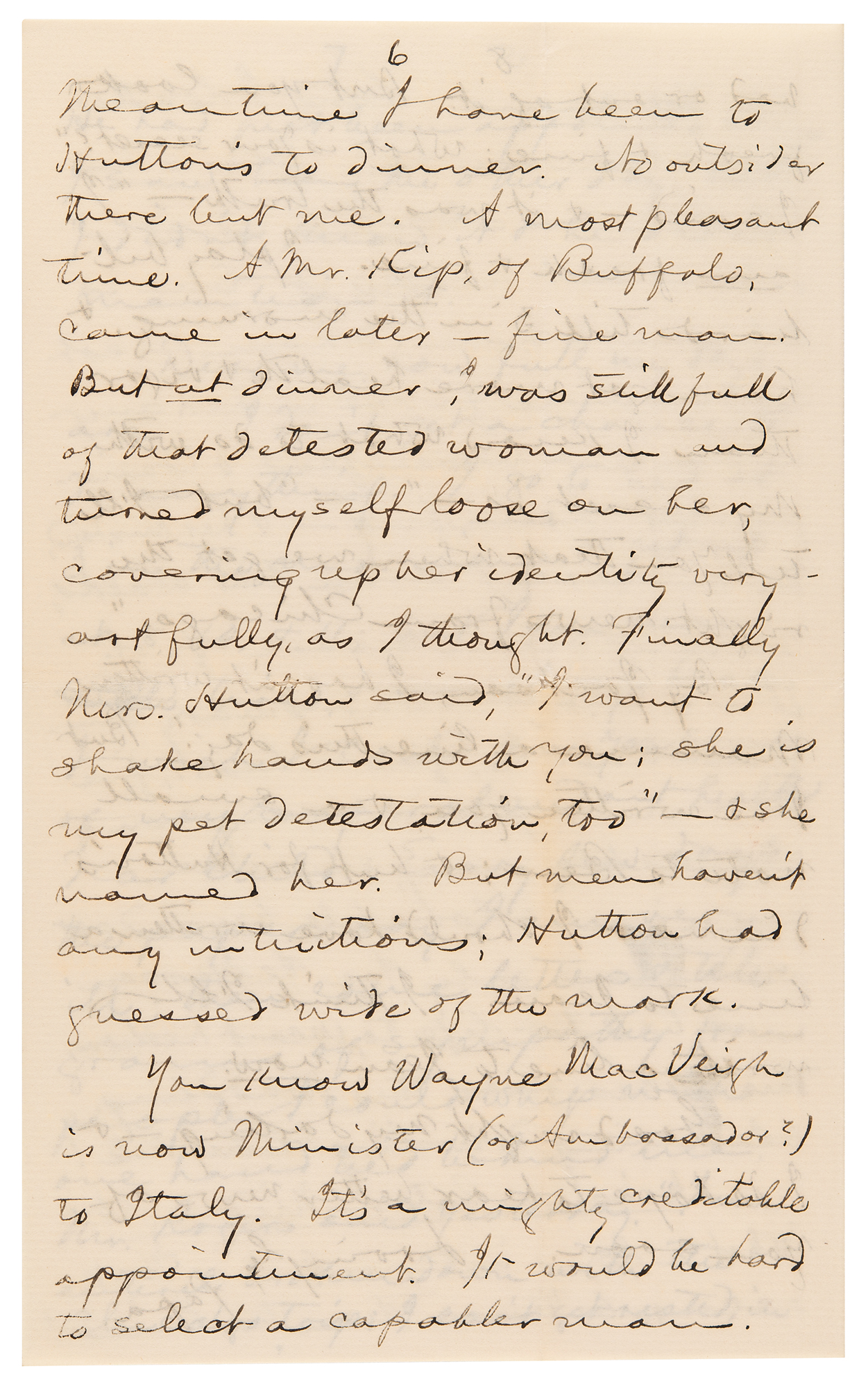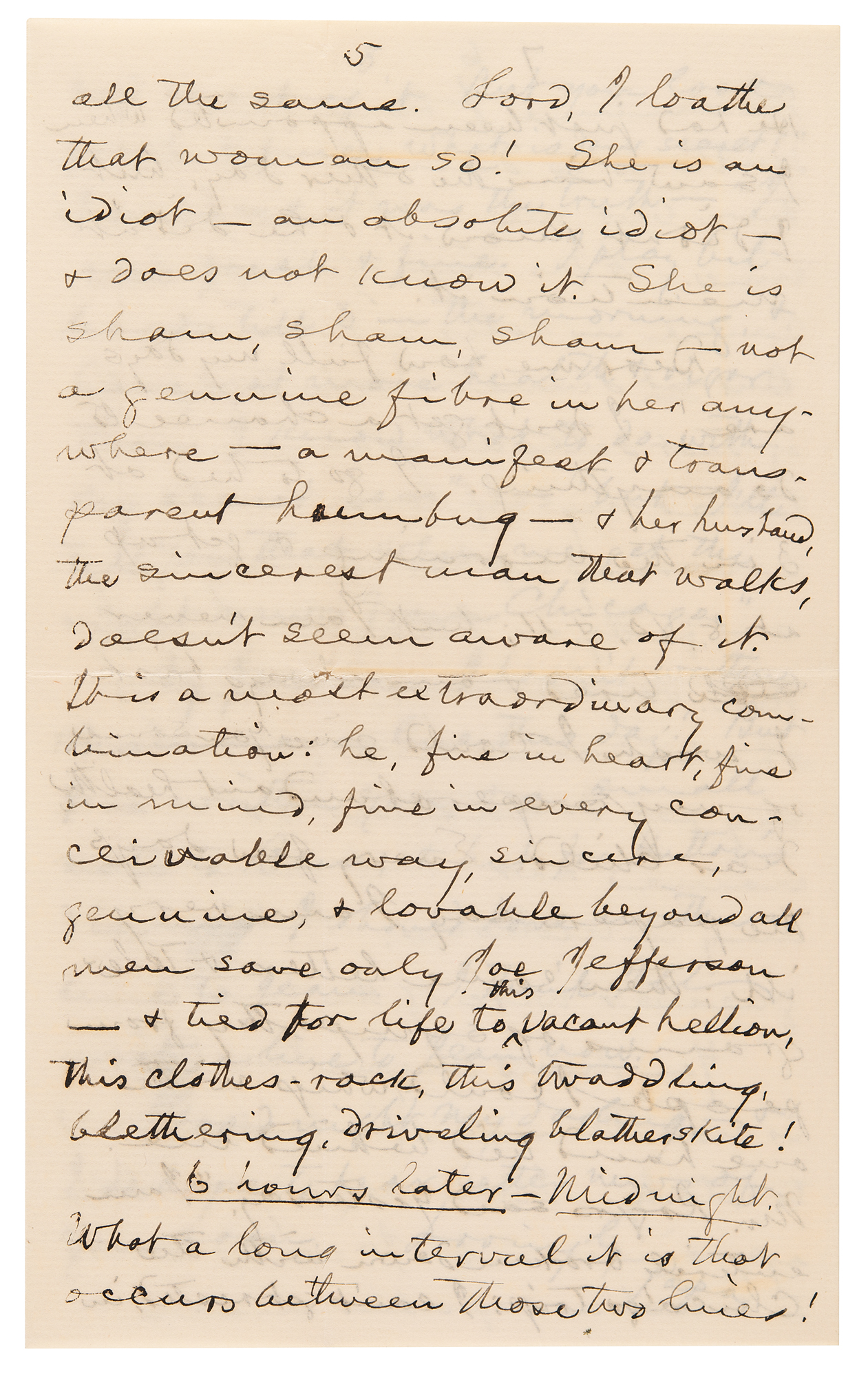 "6 hours later—Midnight. What a long interval it is that occurs between those two lines! Meantime I have been to Hutton's to dinner. No outsider there but me. A most pleasant time. A Mr. Kip, of Buffalo, came in later—fine man. But at dinner, I was still full of that detested woman and turned myself loose on her, covering up her identity very artfully, as I thought. Finally Mrs. Hutton said, 'I want to shake hands with you; she is my pet detestation, too'—& she named her. But men haven't any intuitions; Hutton had guessed wide of the mark." Though he does not reveal the lady's name in his letter, it seems that Clemens is referring to Lillian W. Aldrich, wife of writer and poet Thomas Bailey Aldrich, who served as editor of the Atlantic until 1890. In fine condition.
