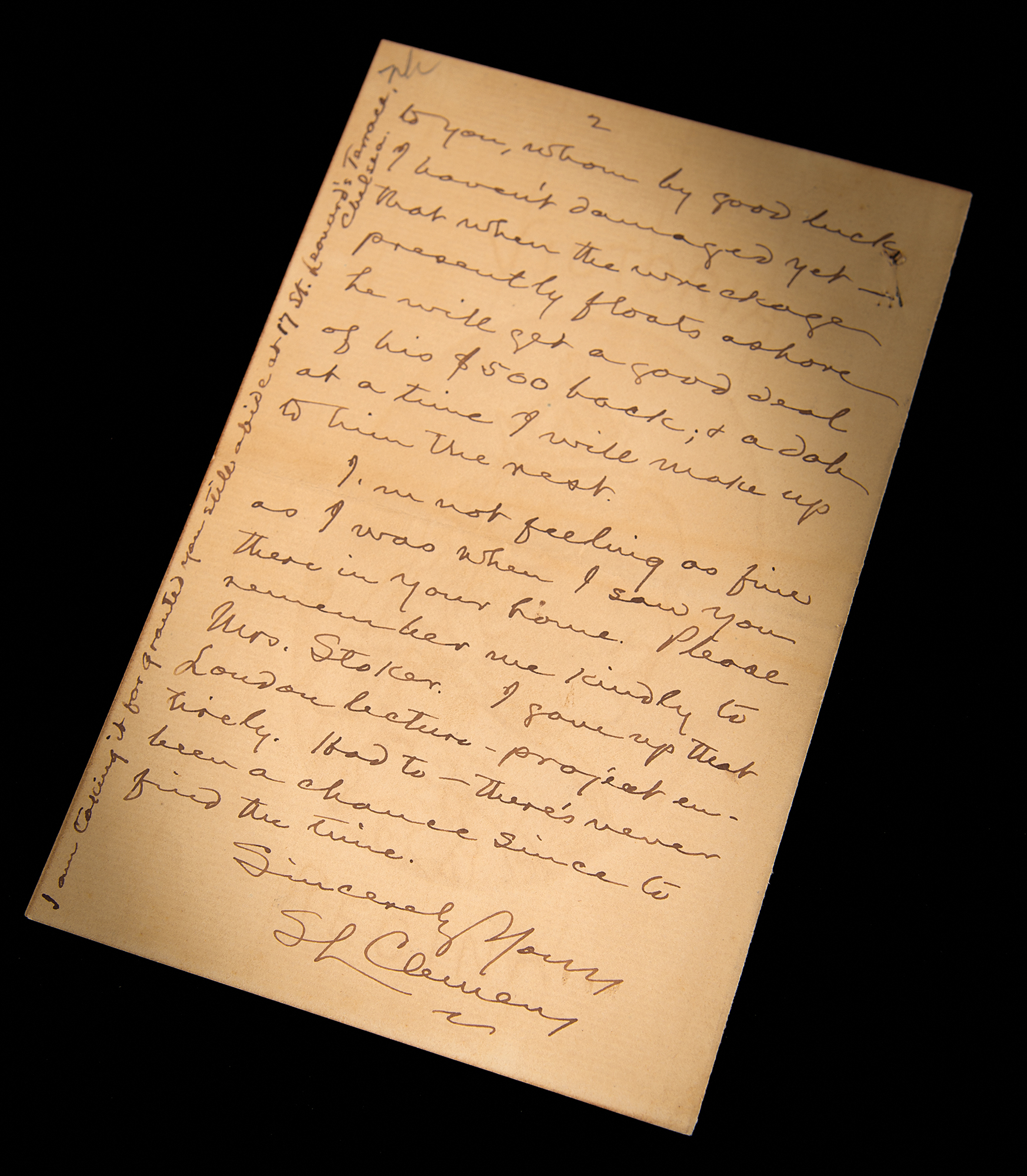 ALS signed “S. L. Clemens,” two pages on two adjoining sheets, 4.5 x 7, no date but circa 1894. Handwritten letter to Dracula author Bram Stoker regarding his ill-fated investment in the Paige typesetting machine. In part: "I am not dating this, because it is not to be mailed at present. When it reaches you it will mean that there is a hitch in my machine enterprise—a hitch so serious as to make it take to itself the aspect of a dissolved dream. This letter, then, will contain cheque for the $100 which you have paid. And will you tell Irving for me—I can't get up courage enough to talk about this misfortune myself, except to you, whom by good luck I haven't damaged yet—that when the wreckage presently floats ashore he will get a good deal of his $500 back; & a dab at a time I will make up to him the rest. I'm not feeling as fine as I was when I saw you there in your home. Please remember me kindly to Mrs. Stoker. I gave up that London lecture-project entirely. Had to—there's never been a chance since to find the time." In fine condition, with a small spot of discoloration to the bottom of the first page.