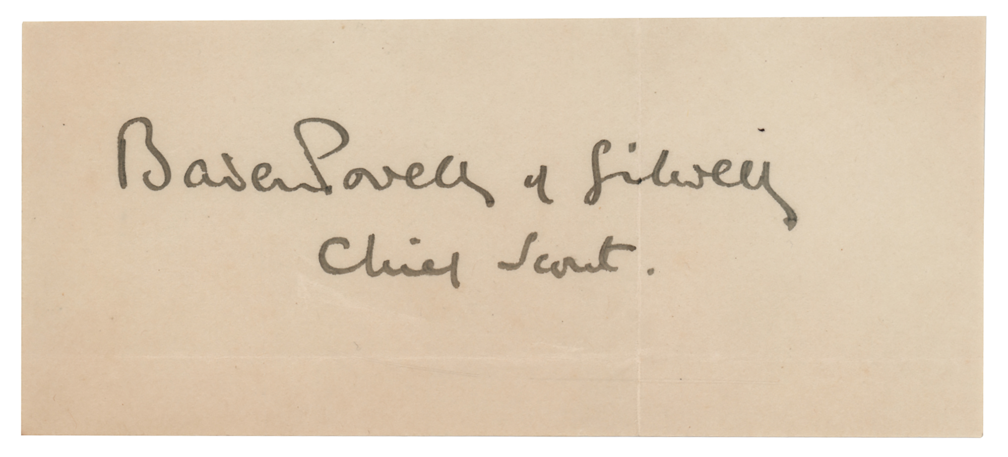 British military officer and founder of the world scouting movement (1857–1941). Ink signature, "Baden-Powell of Gilwell, Chief Scout,” on an off-white 4.5 x 2 slip. In fine condition, with light intersecting folds.