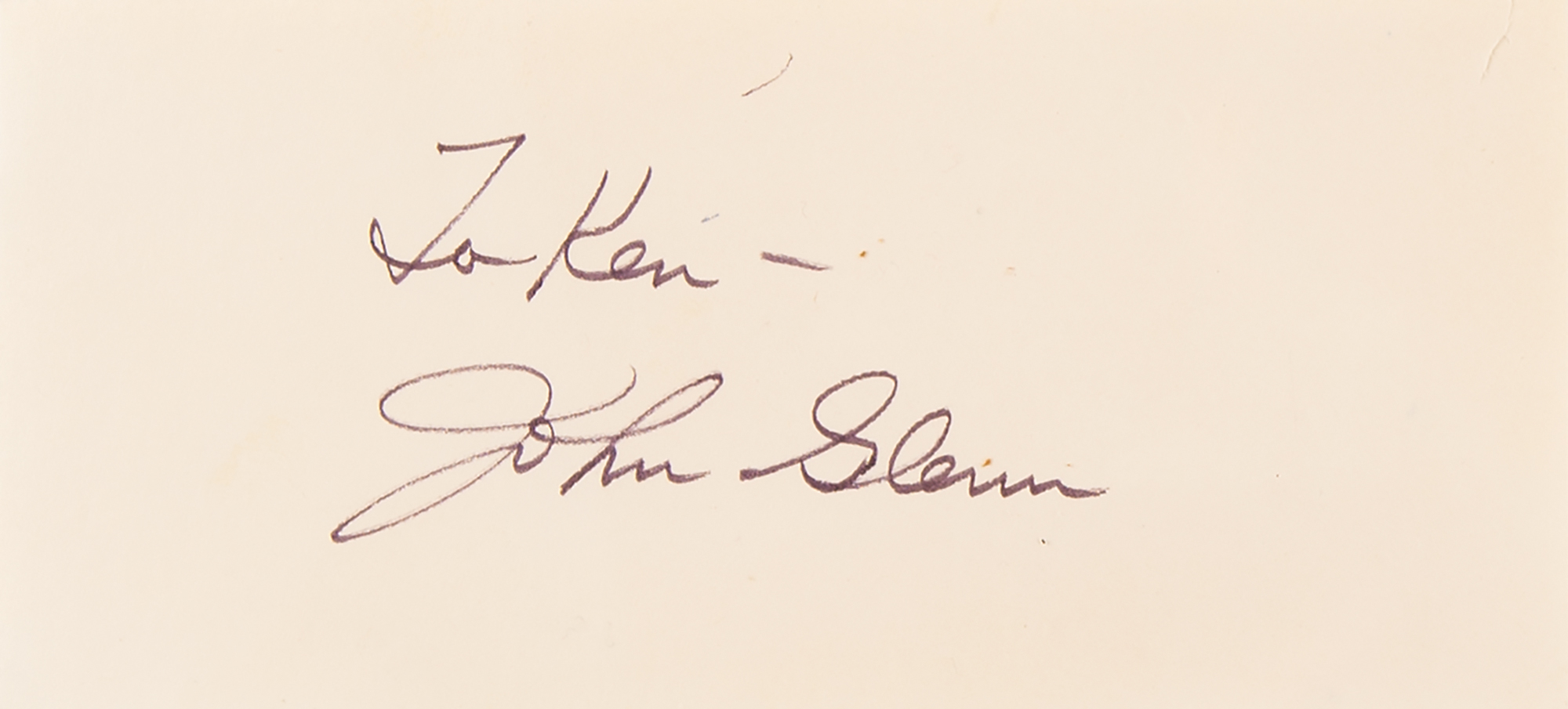 Glossy 6 x 7.75 photo of an artistic portrait of John Glenn in his Mercury space suit, signed below on the original mount in black ink, “Best regards – J. H. Glenn, Jr.” Framed to a slightly larger size and in fine condition. Accompanied by an ink signature and inscription, “To Ken – John Glenn,” on an off-white 6 x 2.75 sheet, and a program from the 69th Annual Banquet for the Ohio Chamber of Commerce, which is signed by Glenn’s parents, “Clara Glenn” and “John H. Glenn, Sr.”