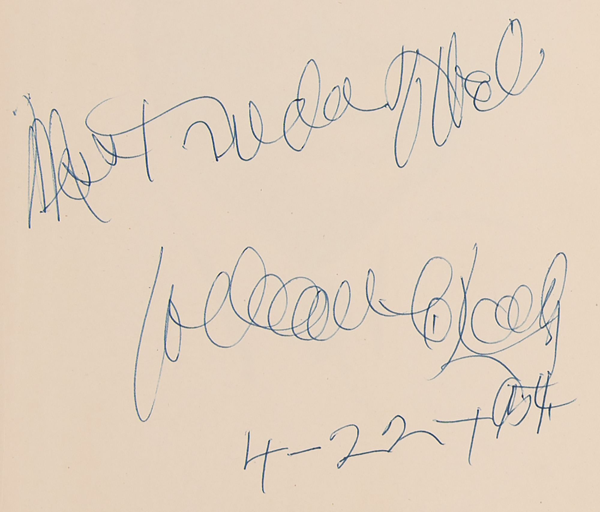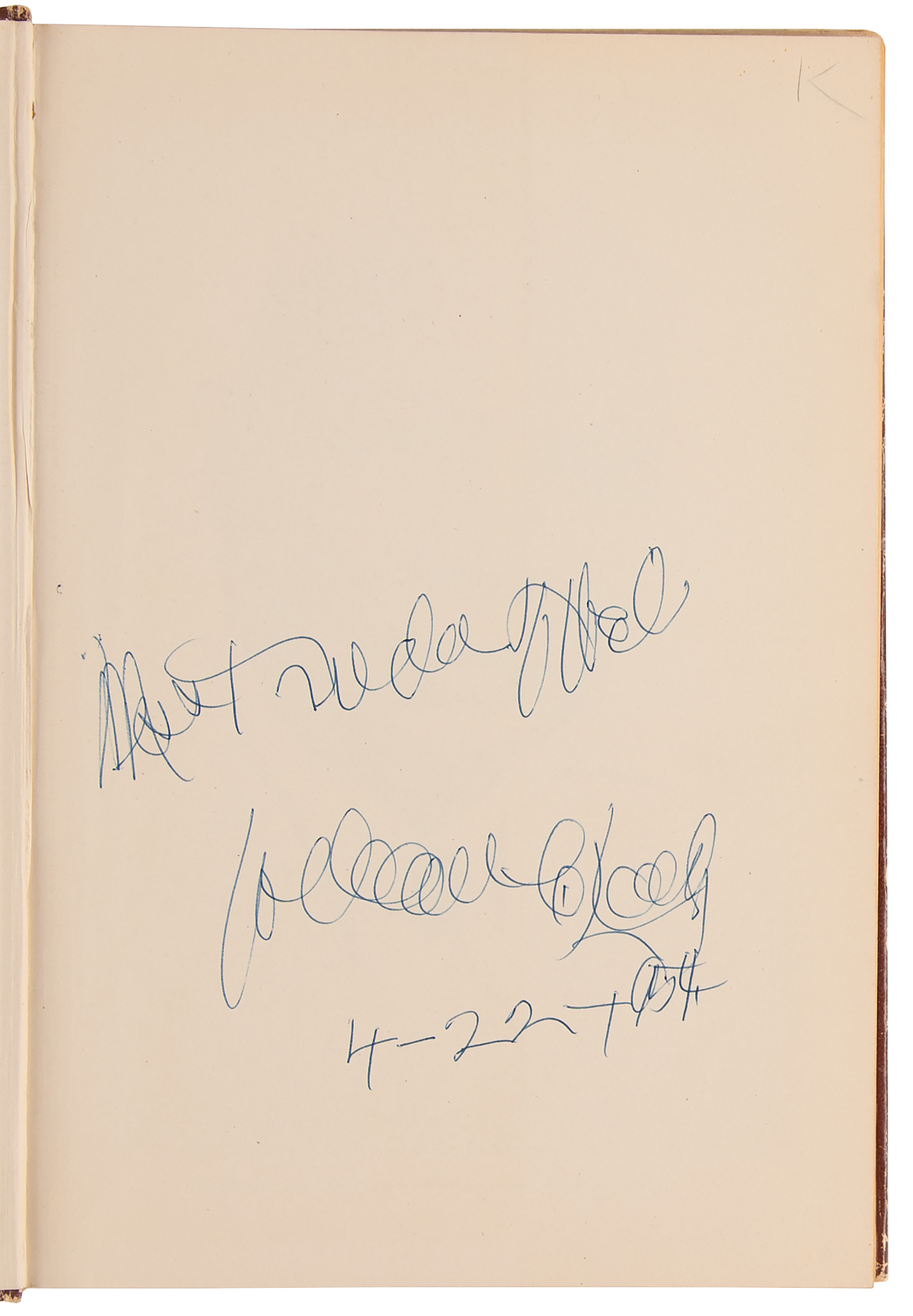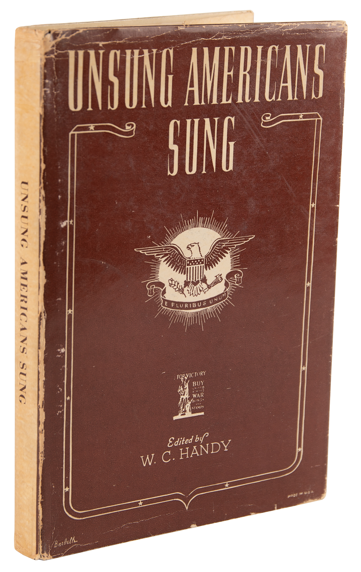 Signed book: Unsung Americans Sung. Later printing. NY: Handy Brothers Music Co., 1946. Hardcover with dust jacket, 7.5 x 11, 236 pages. Signed and inscribed on the first free end page in blue ballpoint by W. C. Handy, adding the date: "4-22-1954." In fine condition, with moderate wear and creasing to the dust jacket.
