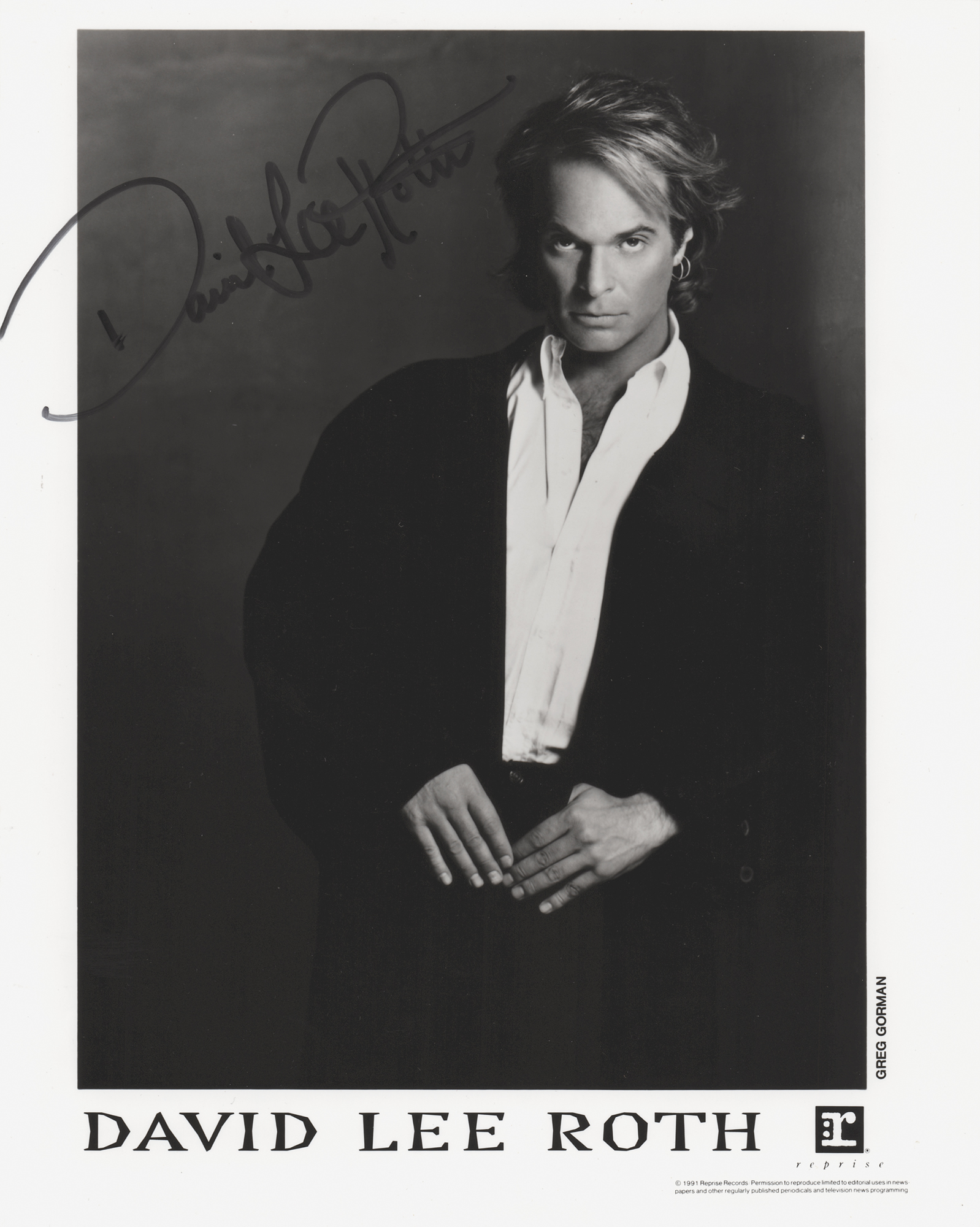 Satin-finish 8 x 10 Reprise Records publicity photo for David Lee Roth from circa 1991, signed in black felt tip. In very good to fine condition, with scattered surface creases. Accompanied by a full letter of authenticity from REAL.
