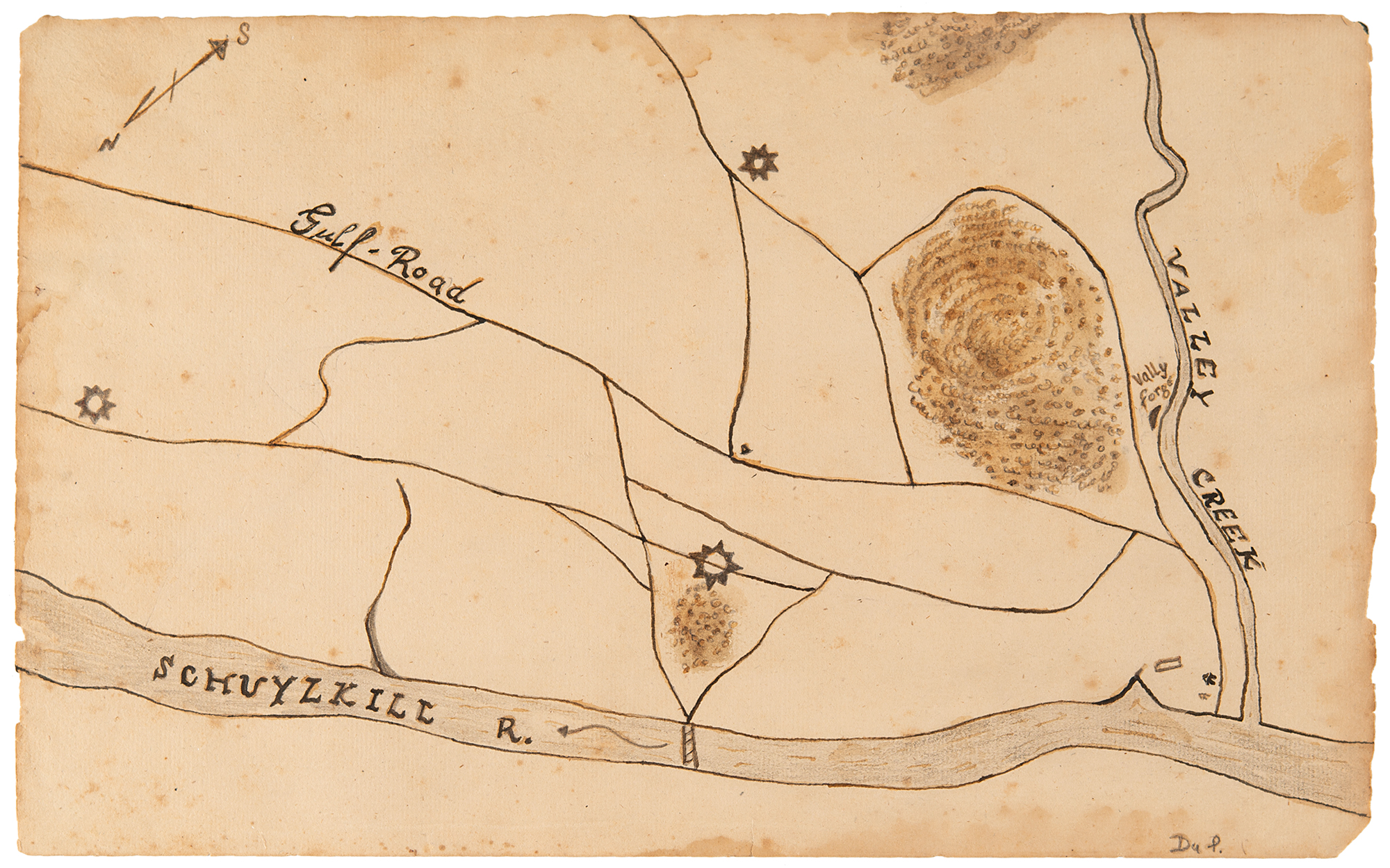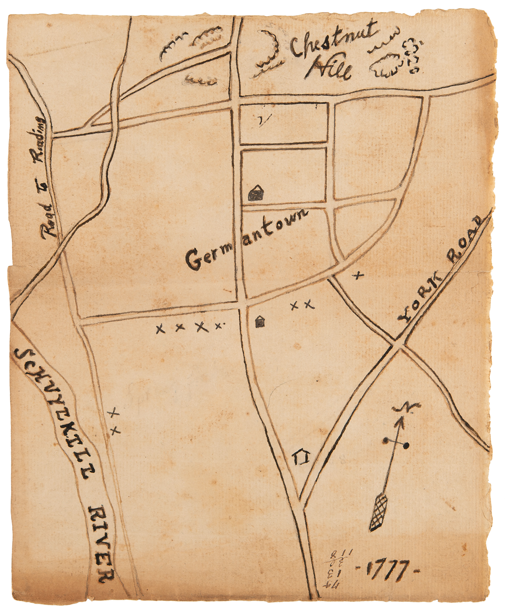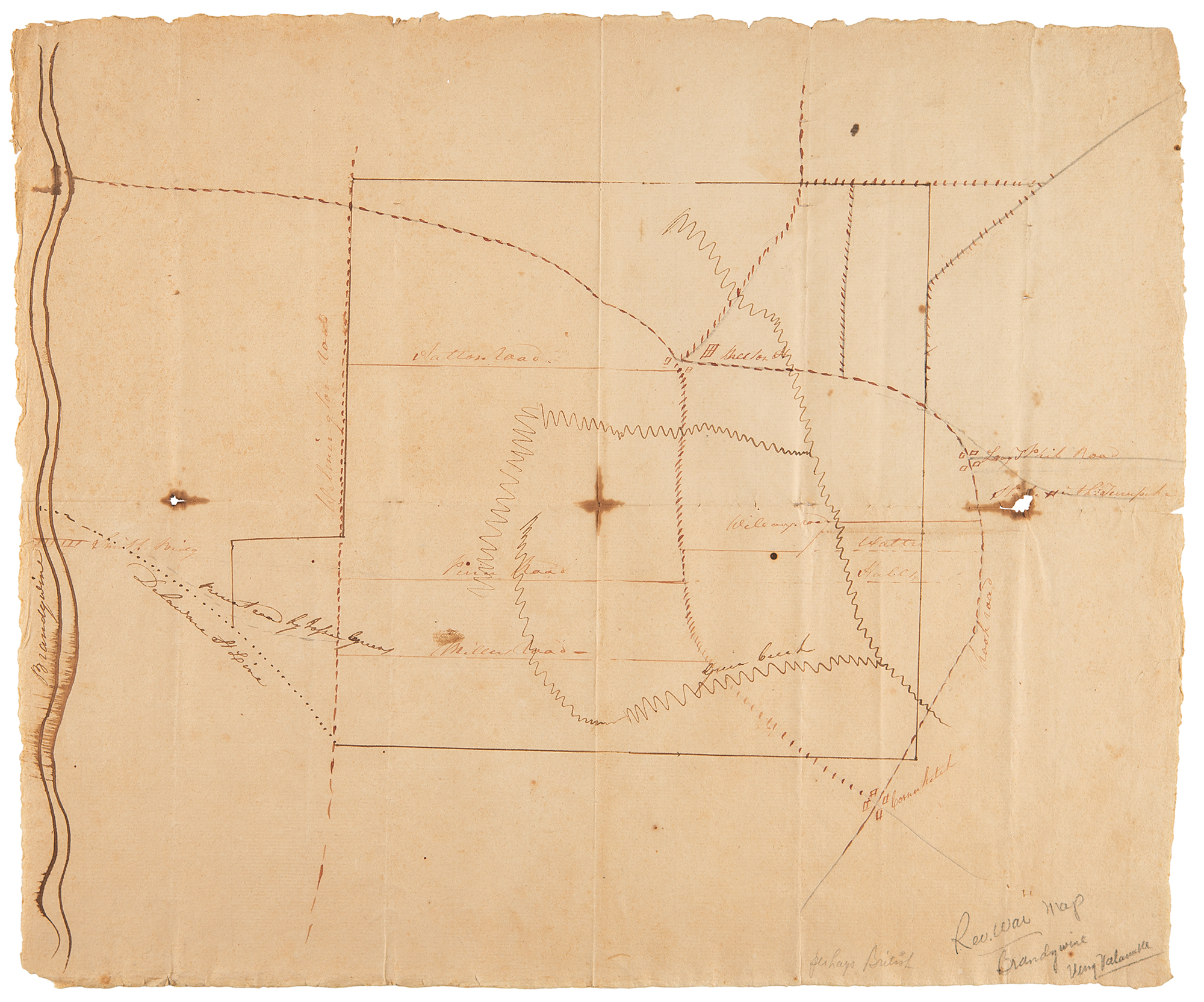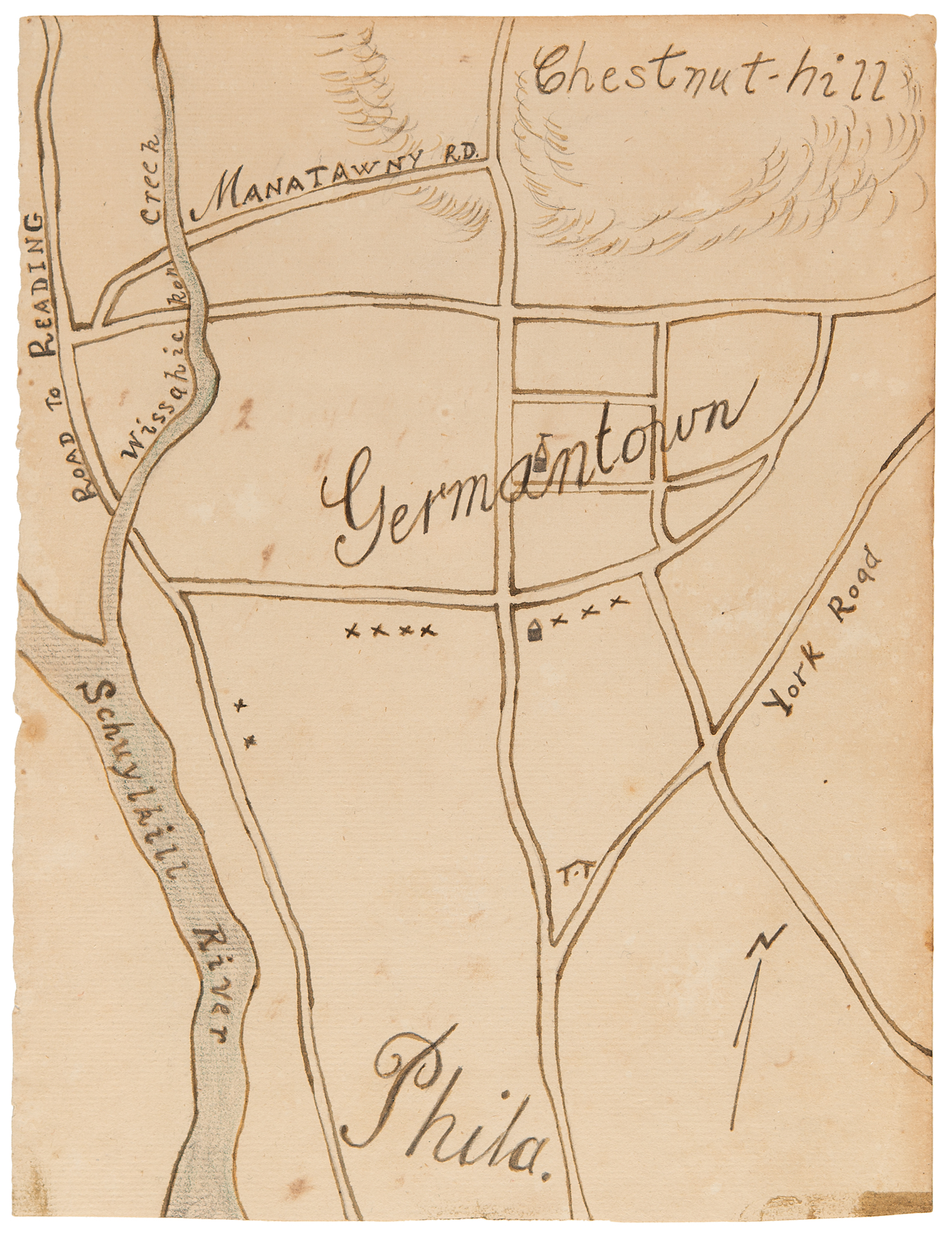 Four contemporary hand-drawn maps of Revolutionary War battlefield sites and encampments, ranging in size from 6.5 x 8 to 16 x 13, including: one of the Brandywine battlefield; two of Germantown and Chestnut-Hill, site of a major engagement during the Philadelphia campaign in 1777; and one of the encampment at Valley Forge in 1777–1778. In overall very good to fine condition.