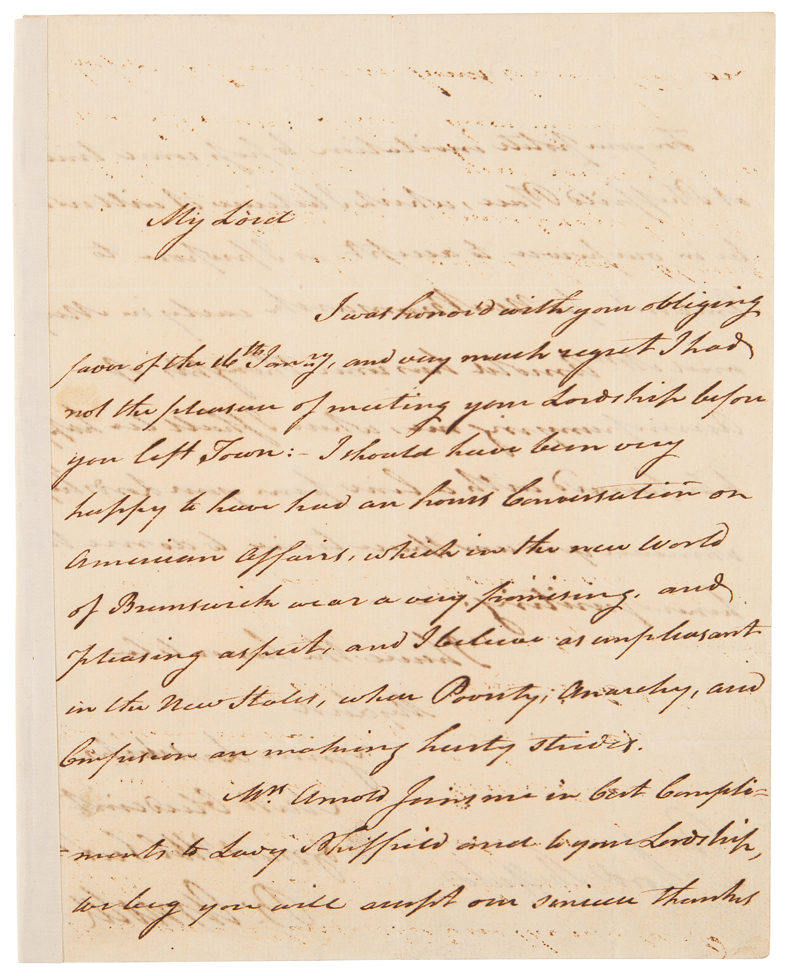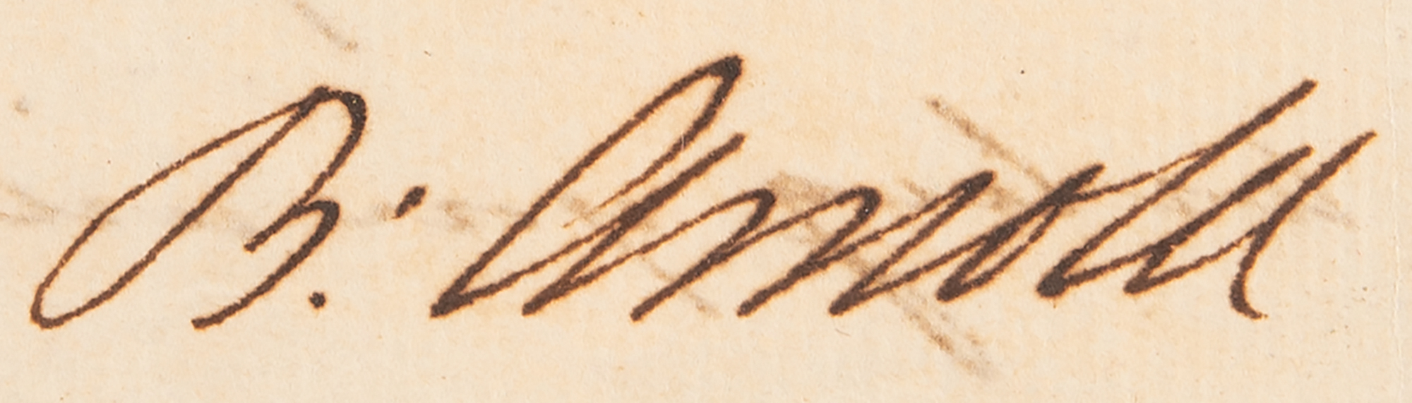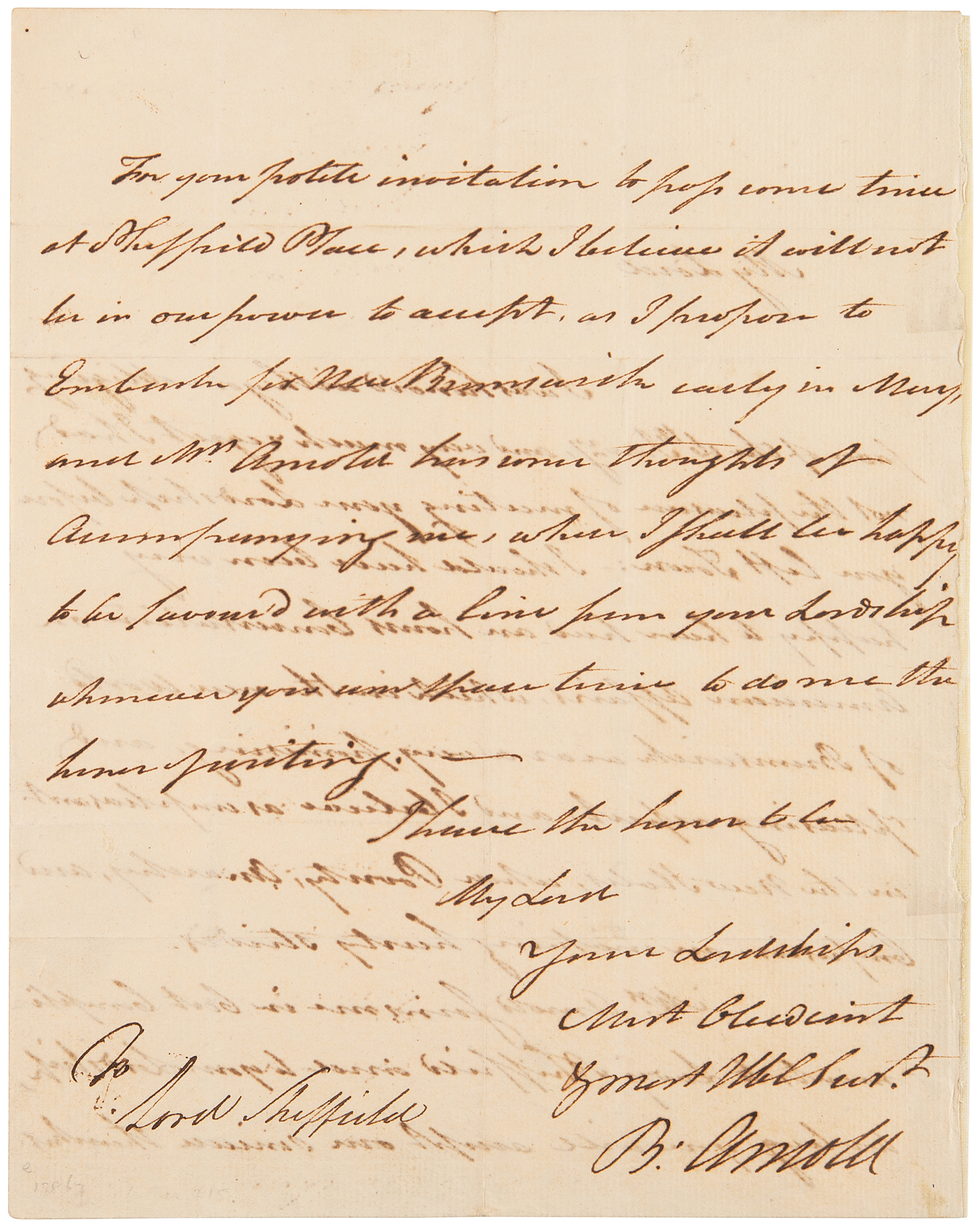 ALS signed “B. Arnold,” one page both sides, 7.25 x 9, no date but circa 1785. Handwritten letter to Lord Sheffield, in part: "I was honor'd with your obliging favor of the 16th Jan'y, and very much regret I had not the pleasure of meeting your Lordship before you left Town:—I should have been very happy to have had an hours conversation on American affairs, which in the new world of Brunswick was a very promising and pleasing aspect, and I believe as unpleasant in the New States, where Poverty, Anarchy, and Confusion are marching hearty strides. Mrs. Arnold joins me in best compliments to Lady Sheffield and to your Lordship…I propose to embark for New Brunswick early in May, and Mrs. Arnold has some thoughts of accompanying me." In fine condition, with a strip of mounting tape along the left edge.