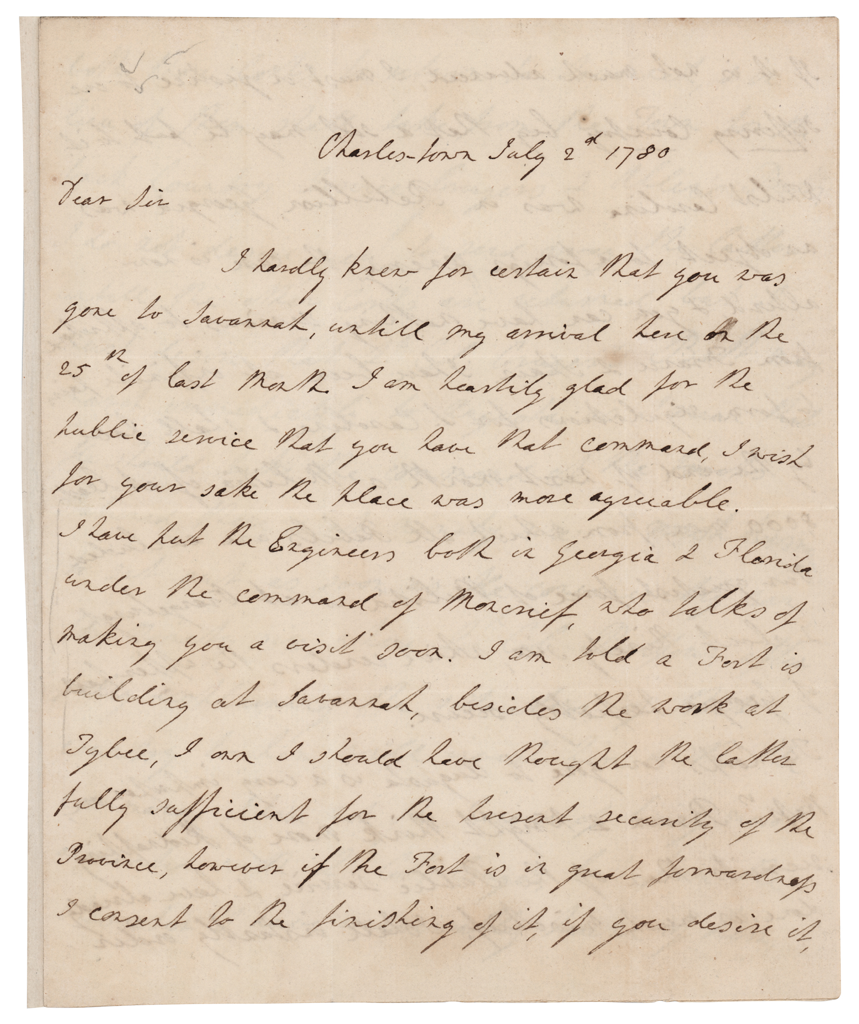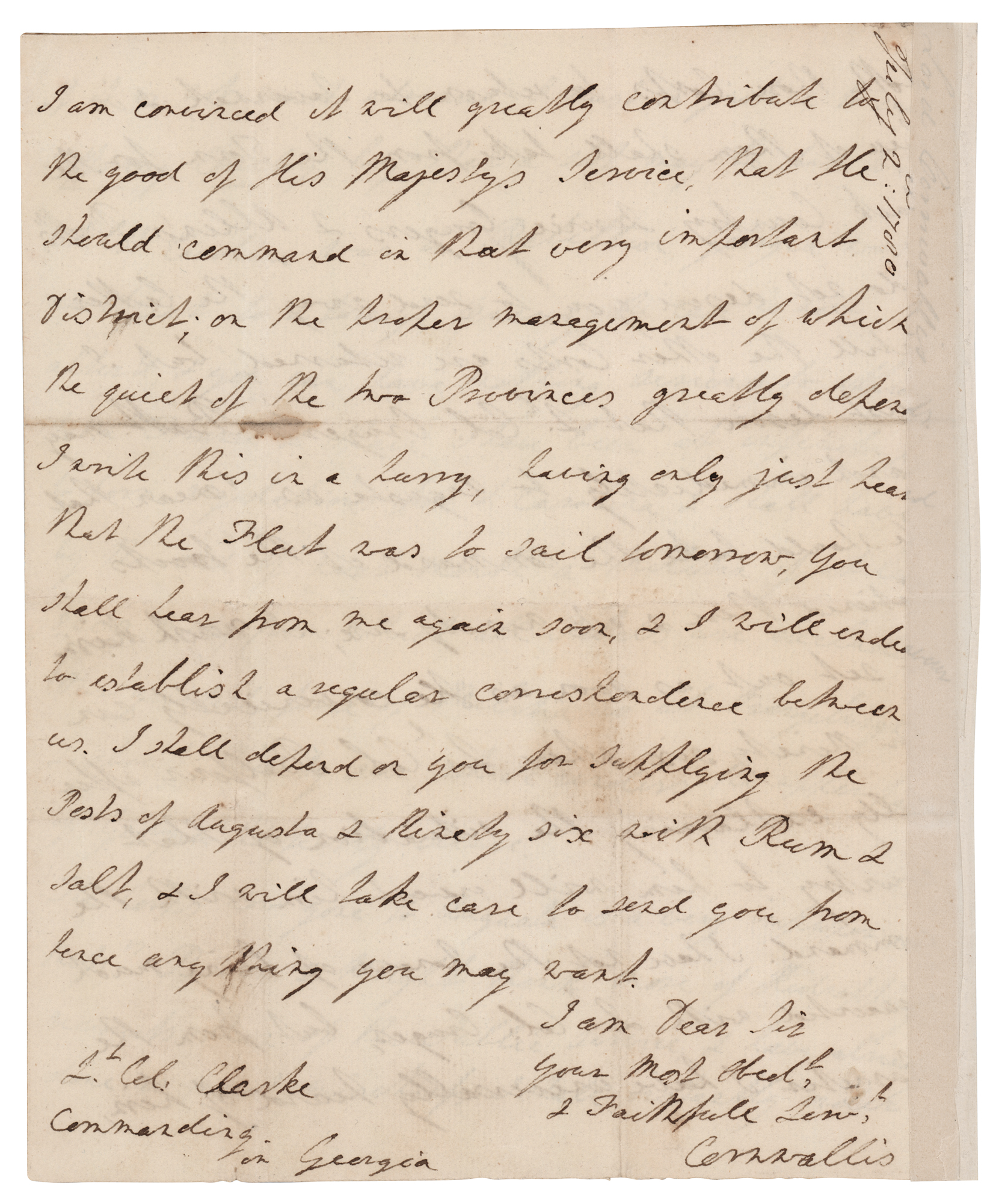 ALS signed “Cornwallis,” four pages on two adjoining sheets, 7.25 x 9, July 2, 1780. Handwritten letter to Lt. Col. Alured Clarke, commander of British troops in Georgia, sent from recently captured Charleston, South Carolina. In part: "I am heartily glad for the public service that you have that command, I wish for your sake the place was more agreeable. I have put the Engineers both in George & Florida under the command of Moncrief, who talks of making you a visit soon. I am told a Fort is building at Savannah, besides the work at Tybee, I own I should have thought the latter fully sufficient for the present security of the Province, however if the Fort is in great forwardness I consent to the finishing of it, if you desire it. If it is not much advanced, I must in justice to our suffering country beg that a stop may be put to it.