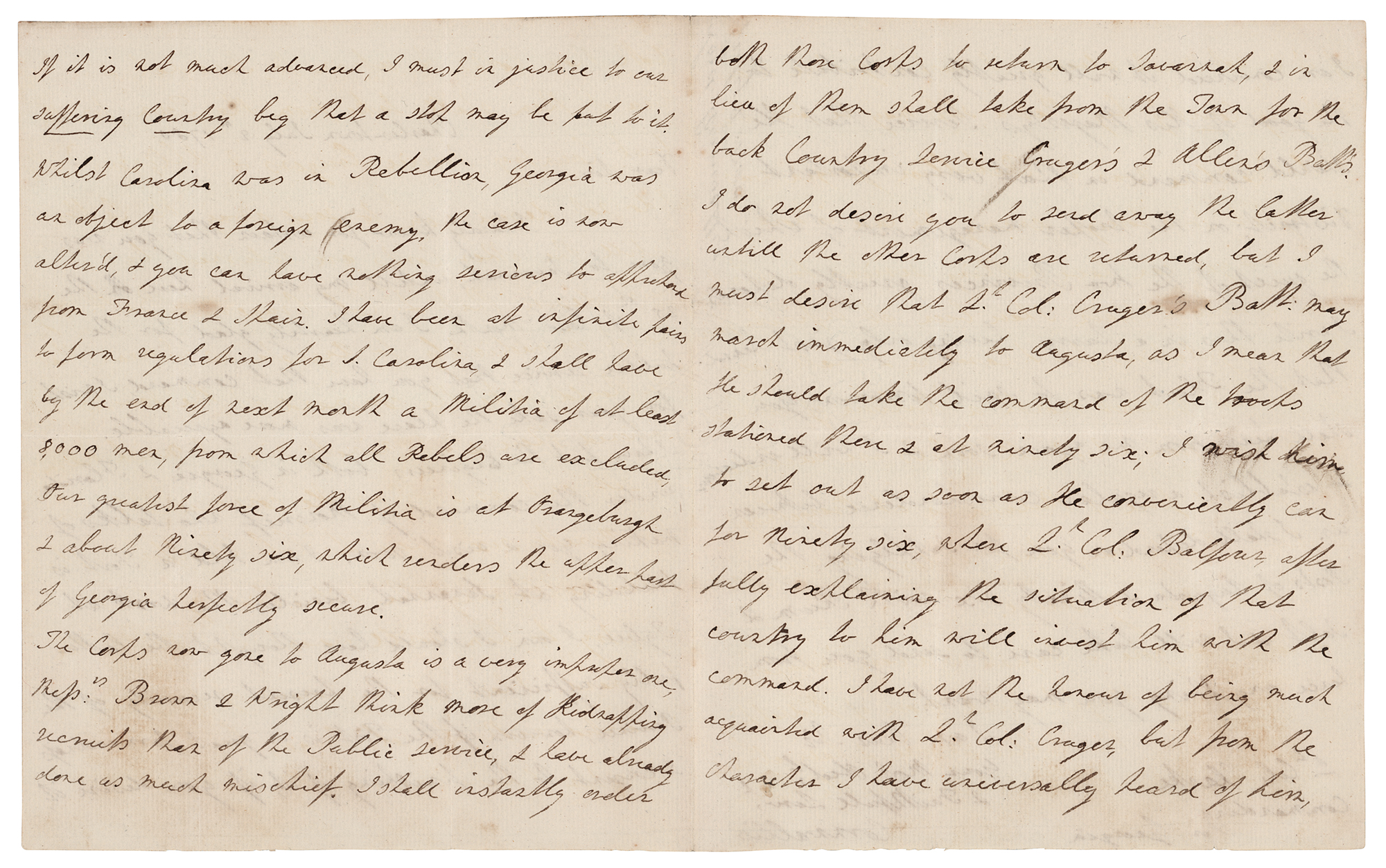 The corps now gone to Augusta is a very improper one, Messrs. Brown & Wright think more of kidnapping recruits than of the Public service, & have already done as much mischief. I shall instantly order both those corps to return to Savannah…I must desire that Lt. Col. Crager's Batt: may march immediately to Augusta, as I mean that he should take the command of the troops stationed there & at Ninety Six…Lt. Col. Balfour after fully explaining the situation of that country to him will invest him with the command. I have not had the honour of being much acquainted with Lt. Col. Crager, but from the character I have universally heard of him, I am convinced it will greatly contribute to the good of His Majesty's service, that he should command in that very important district." In fine condition, with a strip of mounting tape along the left edge.
