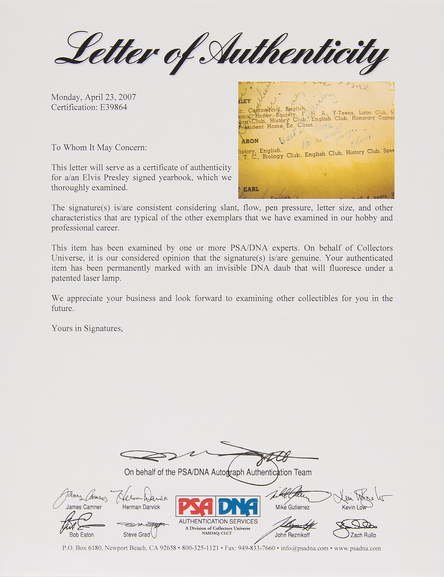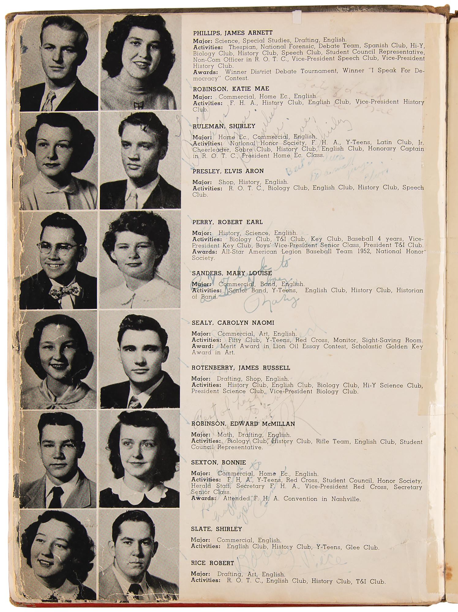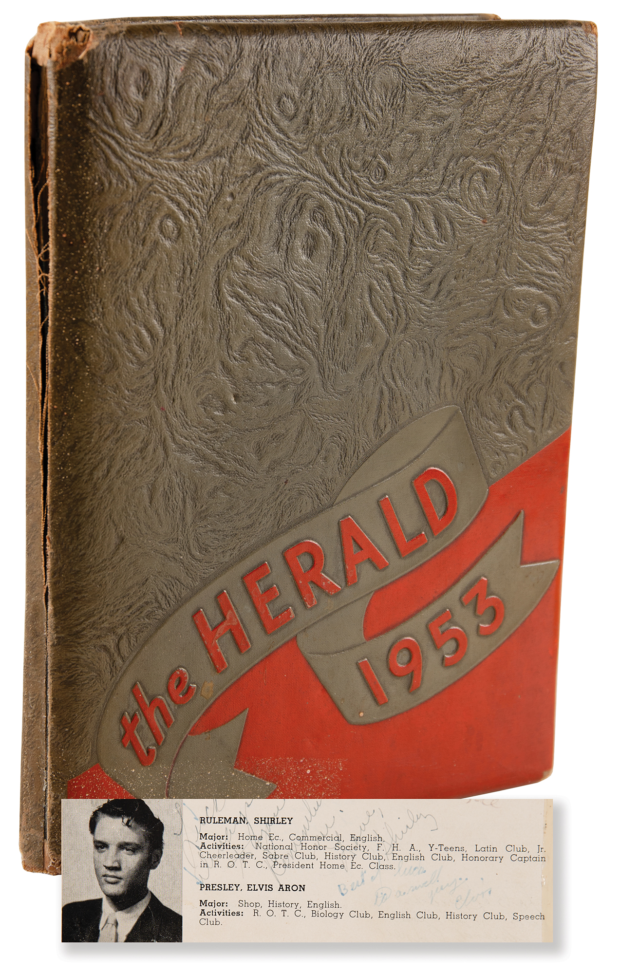 Hardcover 1953 The Herald yearbook from Humes High School in Memphis, Tennessee, 112 pages, 8 x 11, signed next to his senior portrait in ink, "Best of luck to a swell guy, Elvis." The caption below his portrait indicates that Presley majored in “Shop, History, English,” and that he was a member of the ROTC, Biology Club, English Club, History Club, and Speech Club. Another section of the yearbook includes the "Last Will and Testament" of each student, with Section 83 reading: “Donald Williams, Raymond McCraig and Elvis Presley leave hoping there will be someone to take their places as 'teacher's pets.' ???????" The remainder of the interior, including the page signed by Presley, bears numerous other students' signatures. In very good condition, with a torn spine, broken hinges, and many pages partially detached pages held in place with old clear tape; Elvis' signature is somewhat faded, but remains fully legible. Accompanied by a full letter of authenticity from PSA/DNA. Signed material from this early, pre-fame period of Elvis' life is considerably scarce and sought-after.
