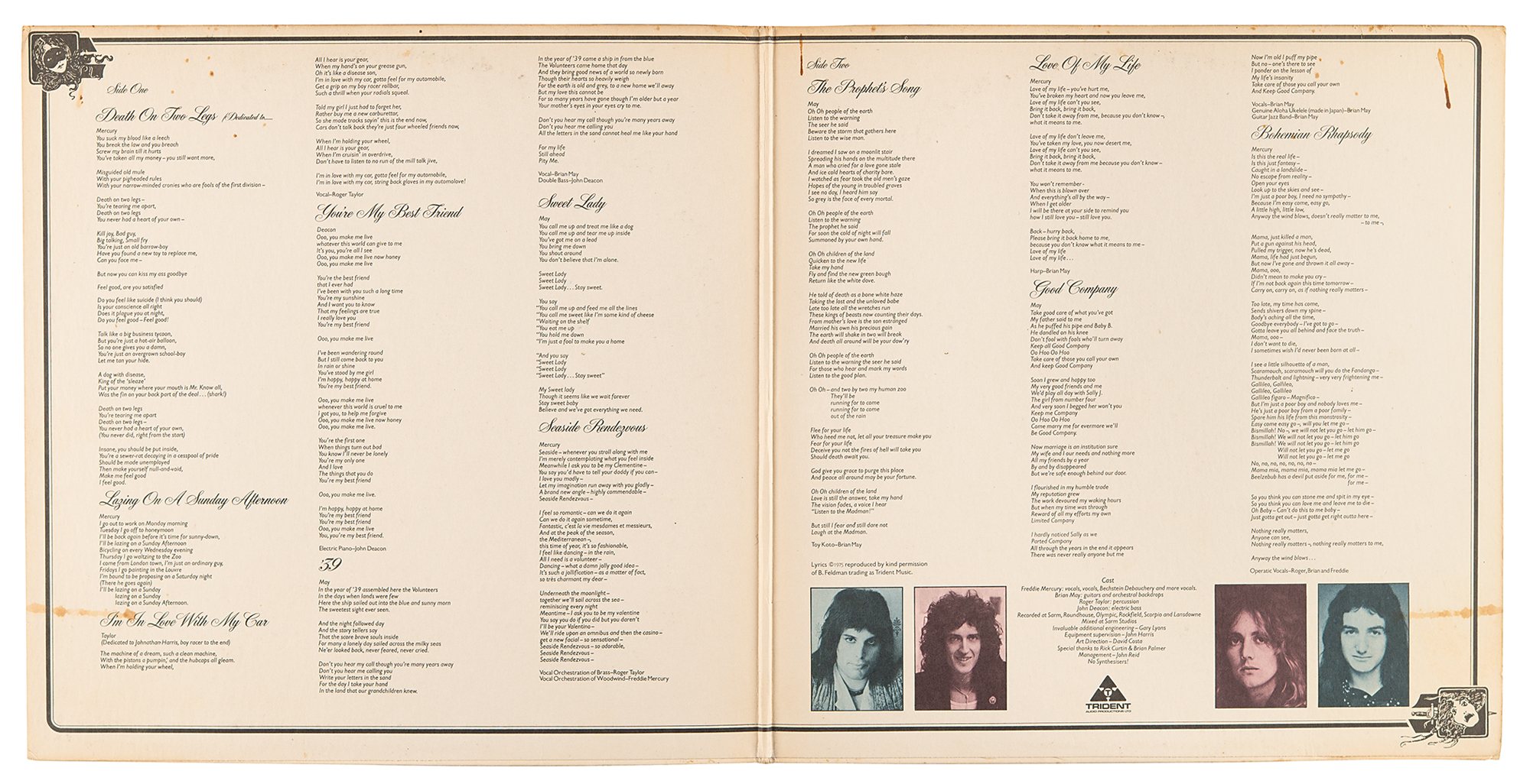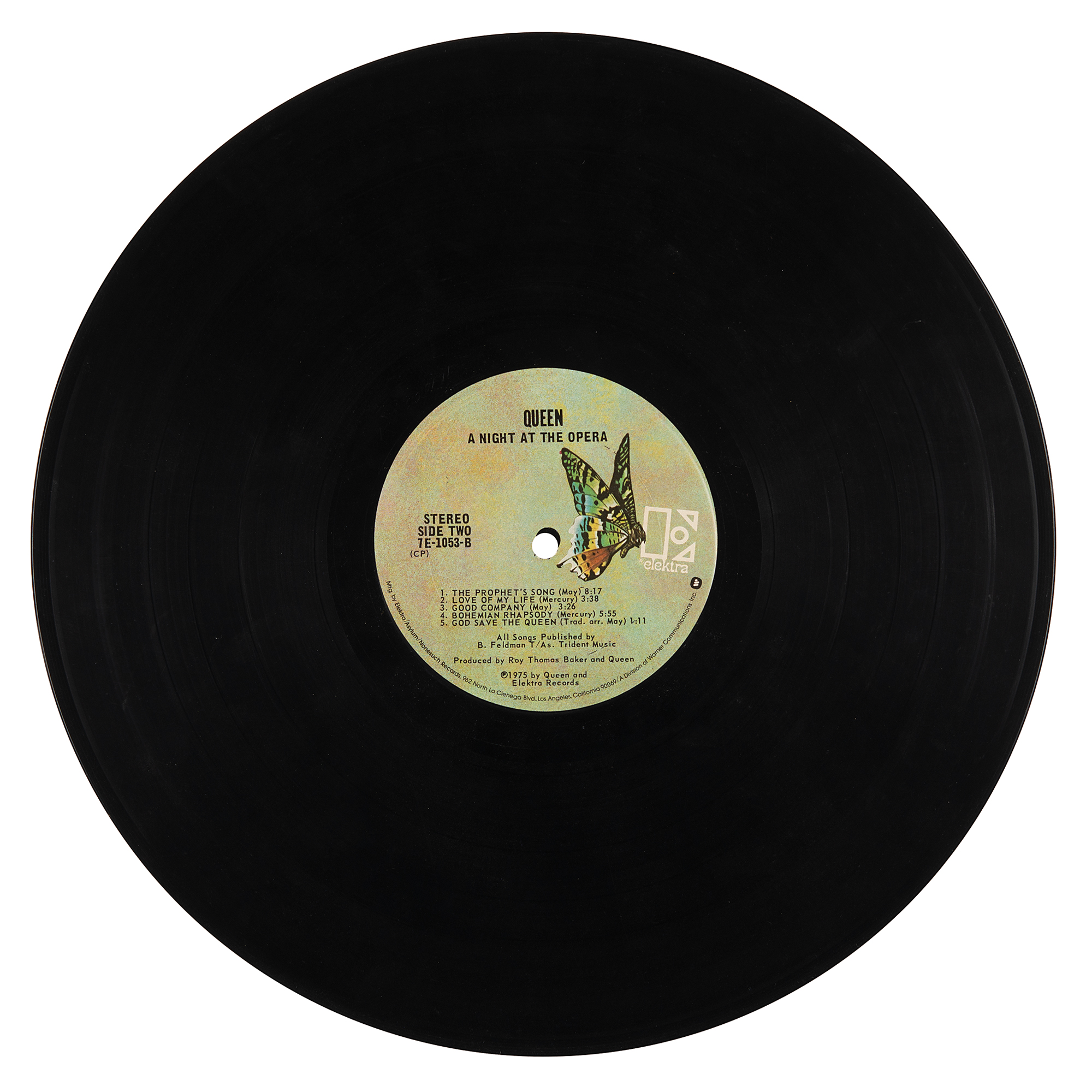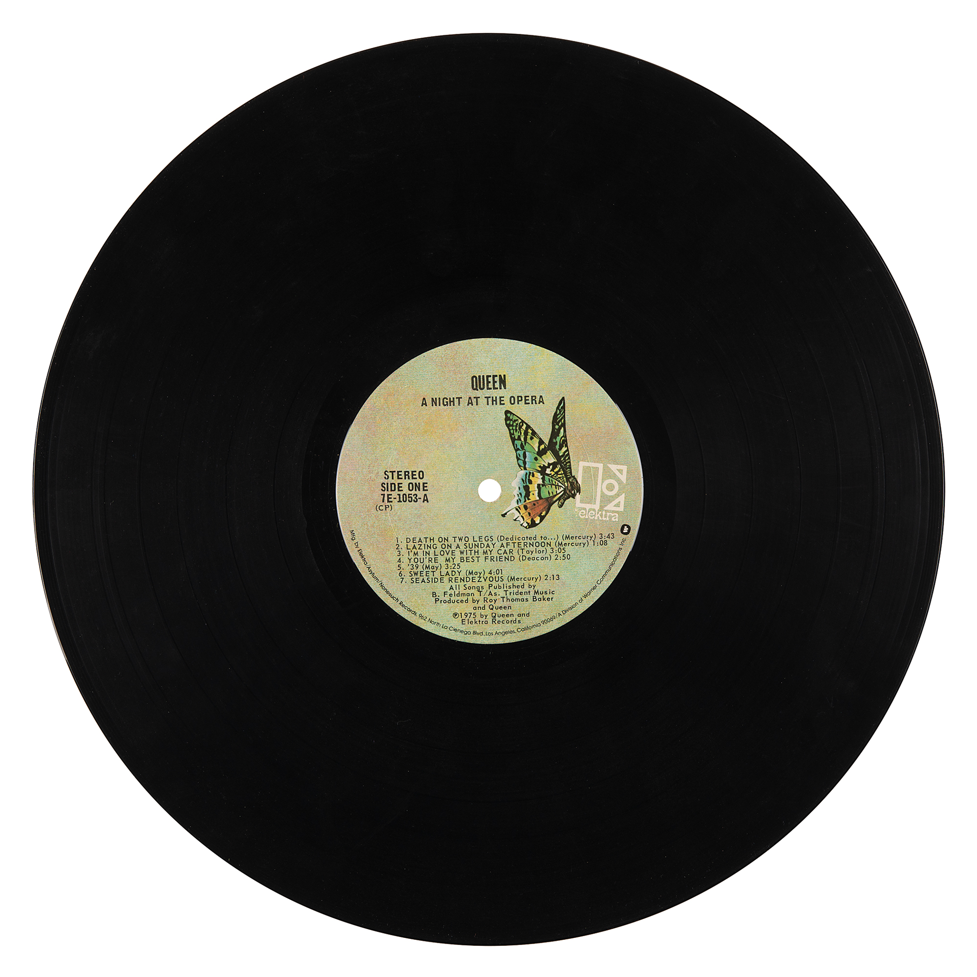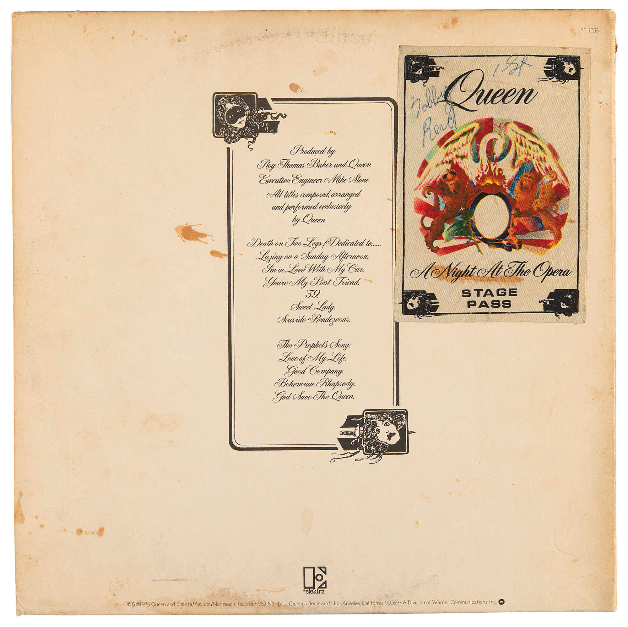 A Night at the Opera album by Queen, signed and inscribed on the front cover in black ballpoint, “All the best Bill, Brian May,” “Freddie Mercury,” “John Deacon,” and “Keep Yourself Alive! Roger Taylor.” The back cover bears an affixed backstage pass from Queen’s 1975-1976 ‘A Night at the Opera' tour. In very good to fine condition, with scattered staining, a yellow sticker in the upper right corner, and toning from prior display. The record is included. Signatures were acquired on February 2, 1976, when the band played the Tower Theatre in Philadelphia. An exceedingly desirable fully signed copy of Queen’s influential A Night at the Opera, made all the more rare and impressive by its crisp, well-placed signatures.