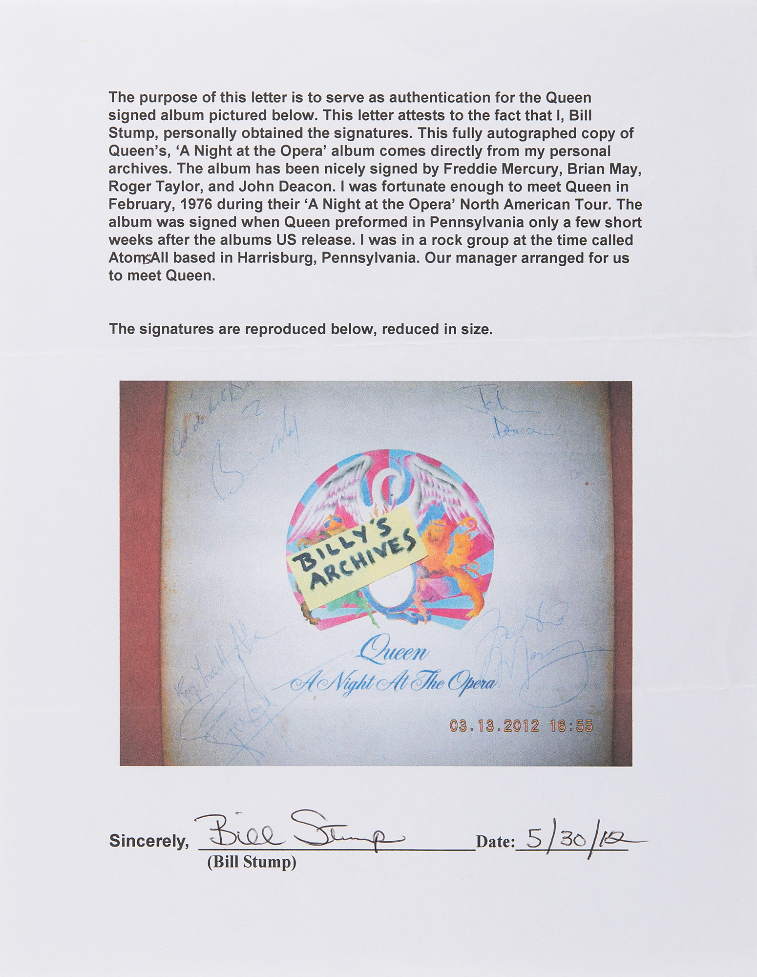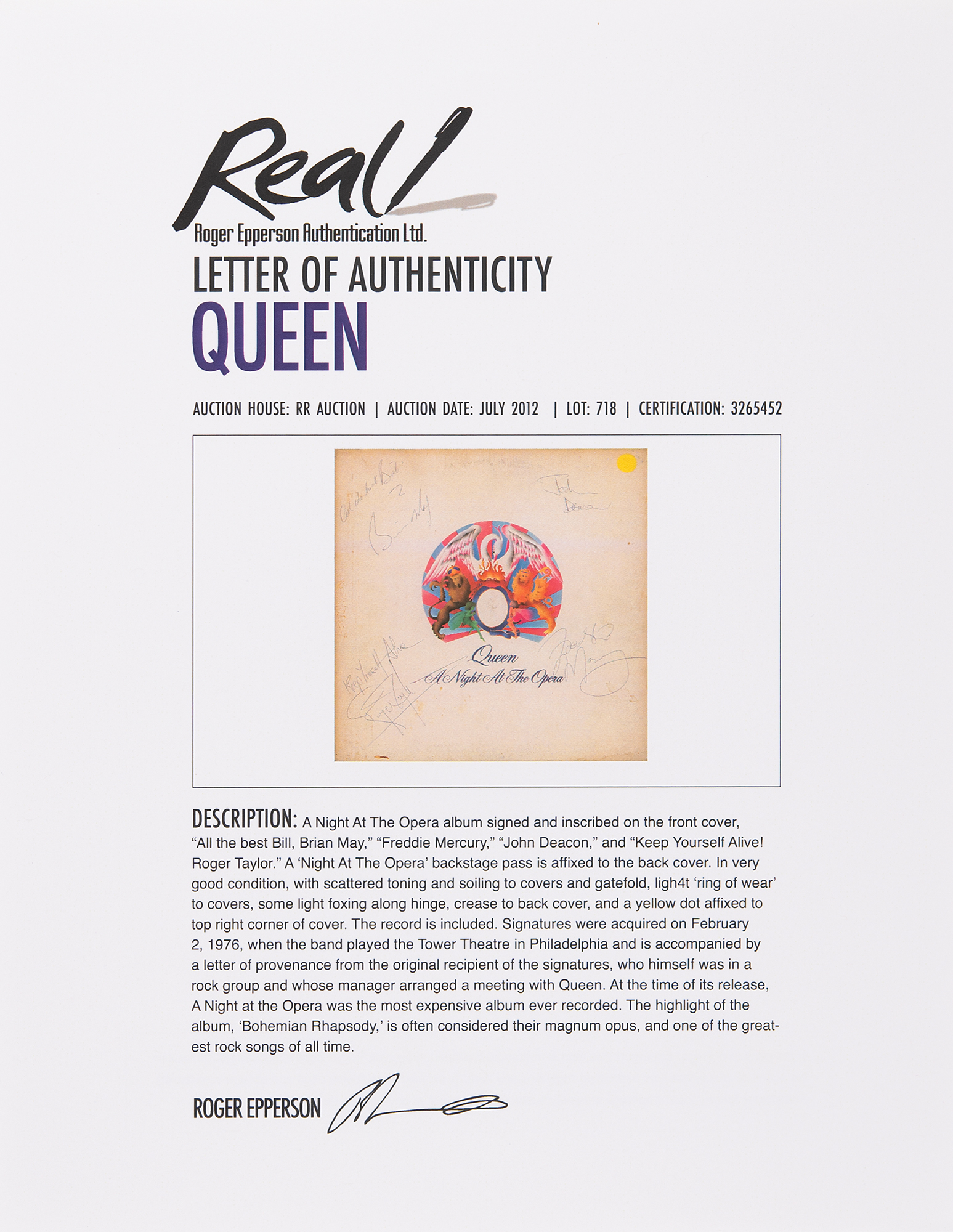 Accompanied by full letters of authenticity from REAL and PSA/DNA, and a letter of provenance from the original recipient: “I was fortunate enough to meet Queen in February, 1976 during their 'A Night at the Opera' North American Tour. The album was signed when Queen performed in Pennsylvania, only a few short weeks after the album's US release. I was in a rock group at the time called Atoms All, based in Harrisburg, Pennsylvania. Our manager arranged for us to meet Queen.”