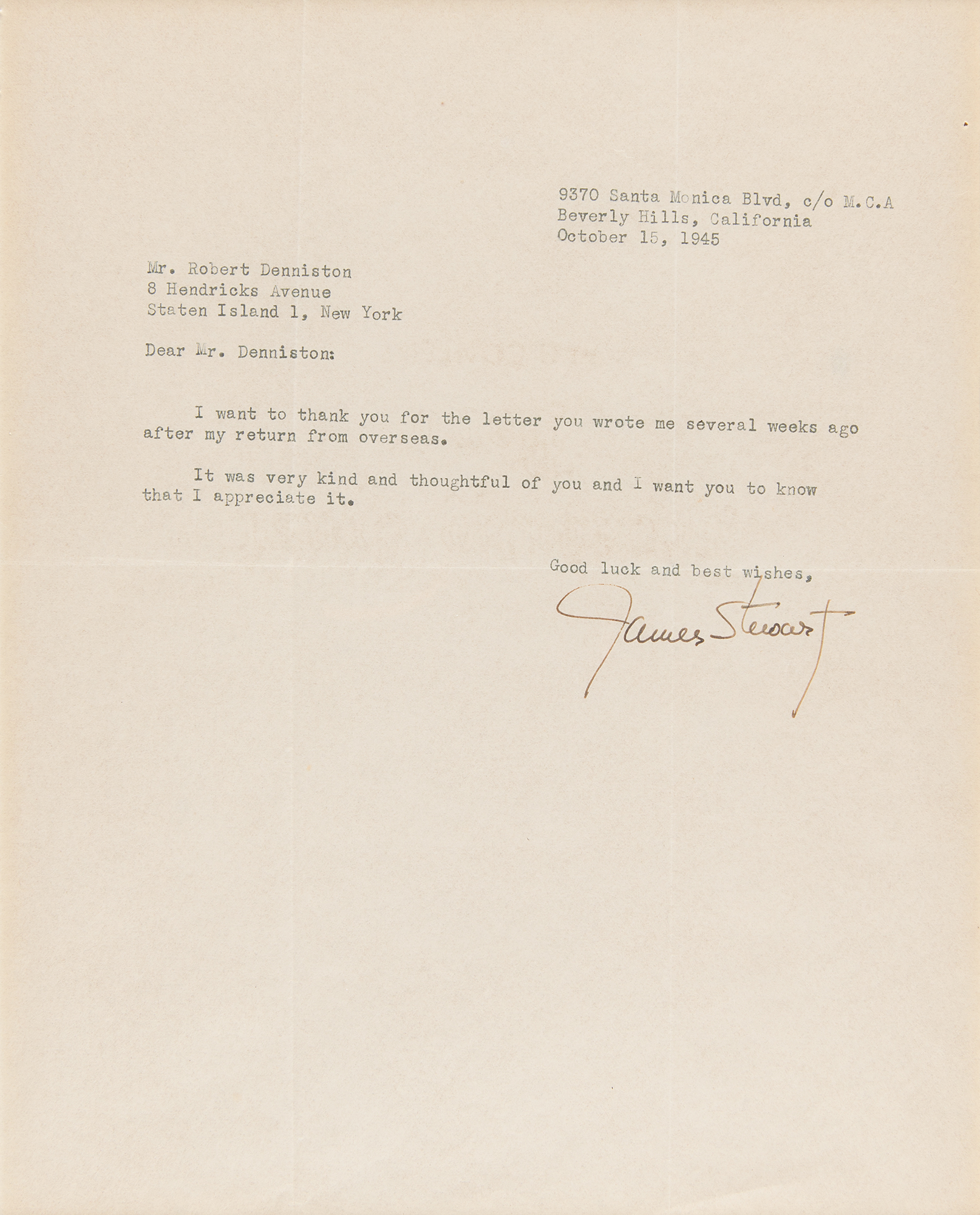 TLS, one page, 8 x 10, October 15, 1945. Letter to Robert Denniston, in full: "I want to thank you for the letter you wrote me several weeks ago after my return from overseas. It was very kind and thoughtful of you and I want you to know that I appreciate it." Double-matted and framed with a portrait to an overall size of 21.5 x 17.25. In fine condition.