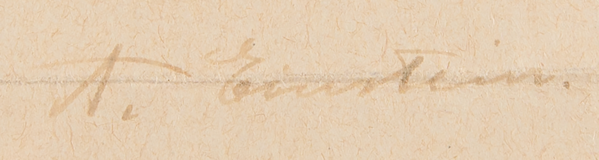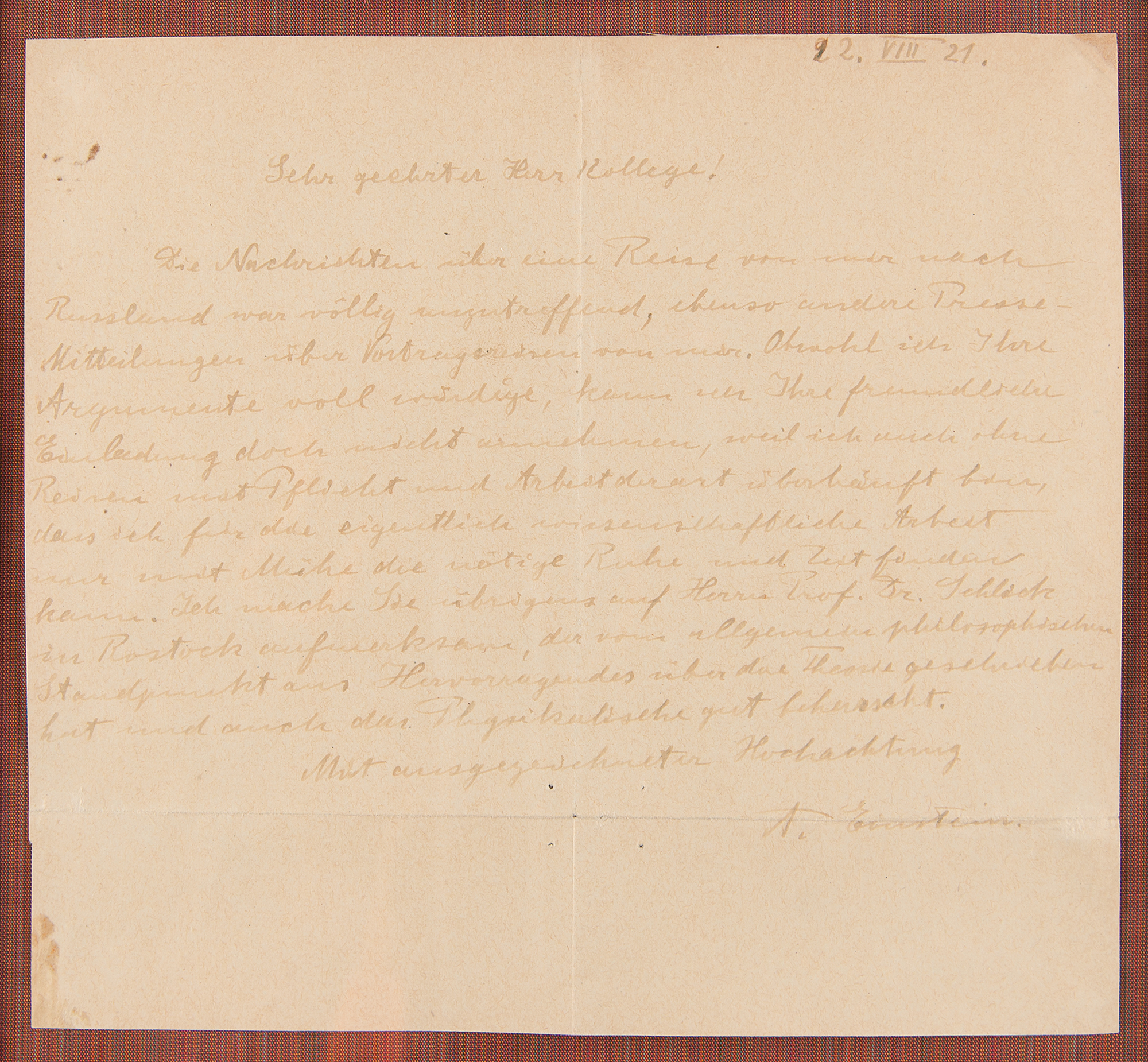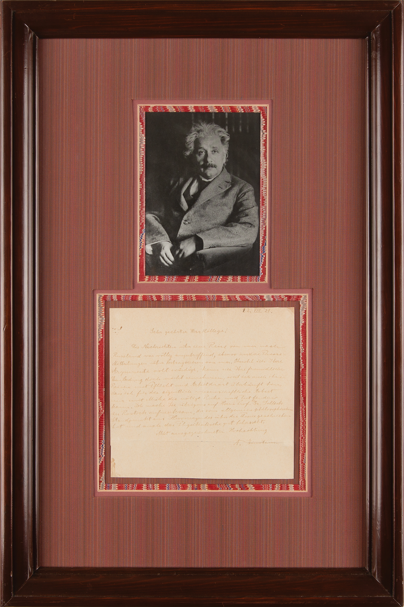 ALS in German, signed “A. Einstein,” one page, 7.25 x 6.75, August 22, 1921. Handwritten letter to a colleague, in part (translated): "The news about my trip to Russia was entirely incorrect…I cannot accept your…invitation as…I can hardly manage to find the necessary rest and incentive for the proper scientific work. May I call your attention to Prof. Dr. Schlick of Rostock, who has made valuable contributions to the Theory from a…philosophical standpoint and has also mastered its physical difficulties." Attractively mounted, cloth-matted, and framed with a portrait to an overall size of 16.25 x 24. In very good to fine condition, with small stains, trimmed edges, and a horizontal mailing fold passing through the signature.