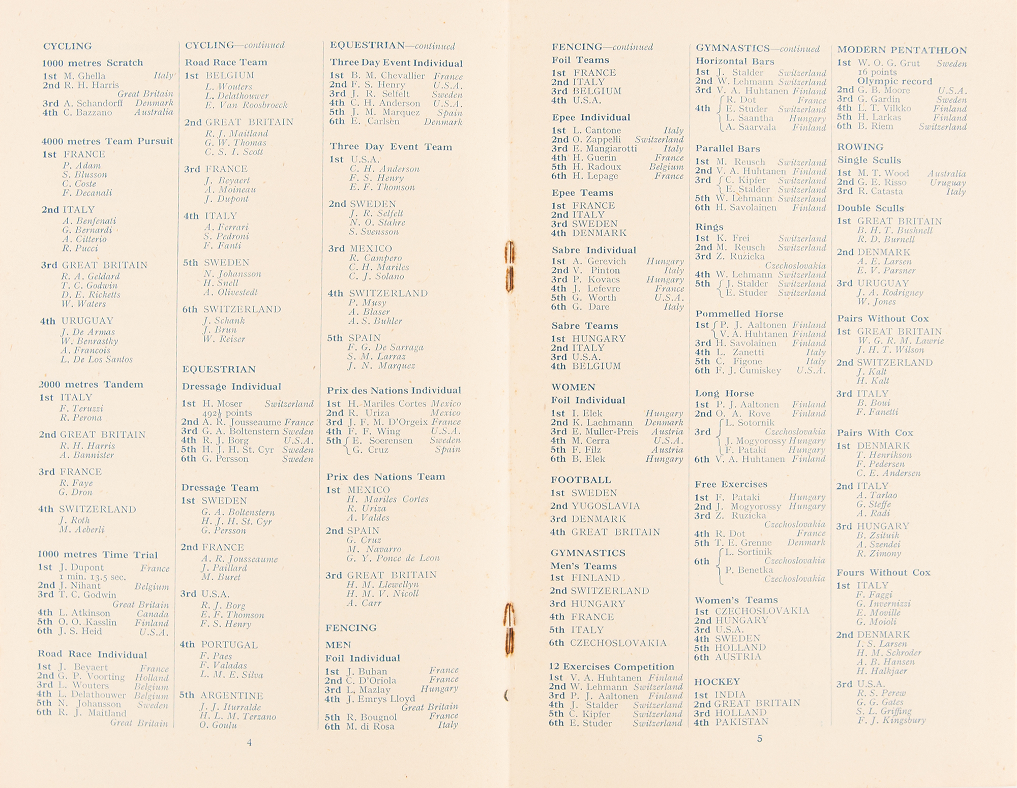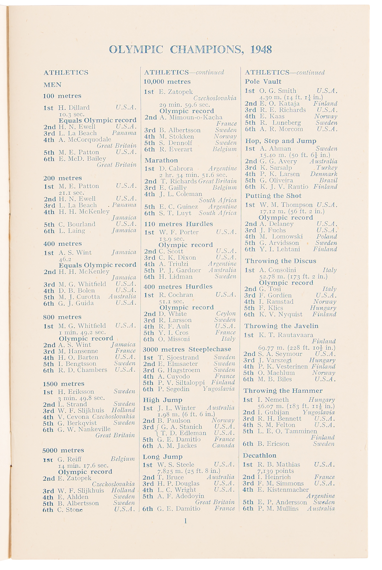 Two commemorative items from the historic London 1948 Olympics: a dual-sided off-white cloth pennant, 7.5 x 3.75, both sides featuring colorful Olympic rings below a design of the bridge and palace of Westminster and text, "XIV Olympiad, London 1948”; and a nine-page booklet entitled “XIV Olymapid London 1948: Complete List of Olympic Champions with Winners’ performances and records,” 5.5 x 8.5, containing a full list of all medalists from the 1948 Summer Games, published by the Organising Committe for the XIVth Olympiad London. In overall fine condition, with light toning and stains.
