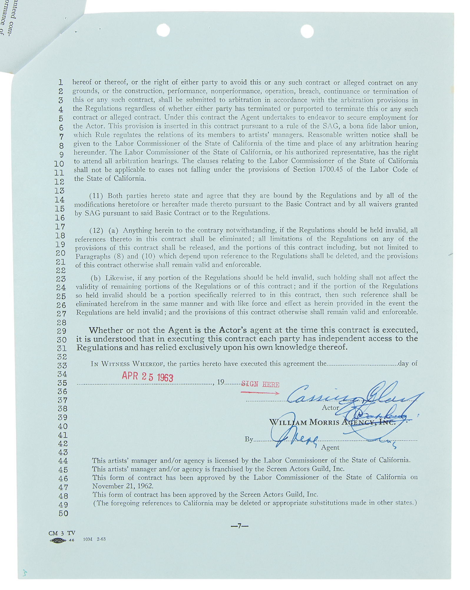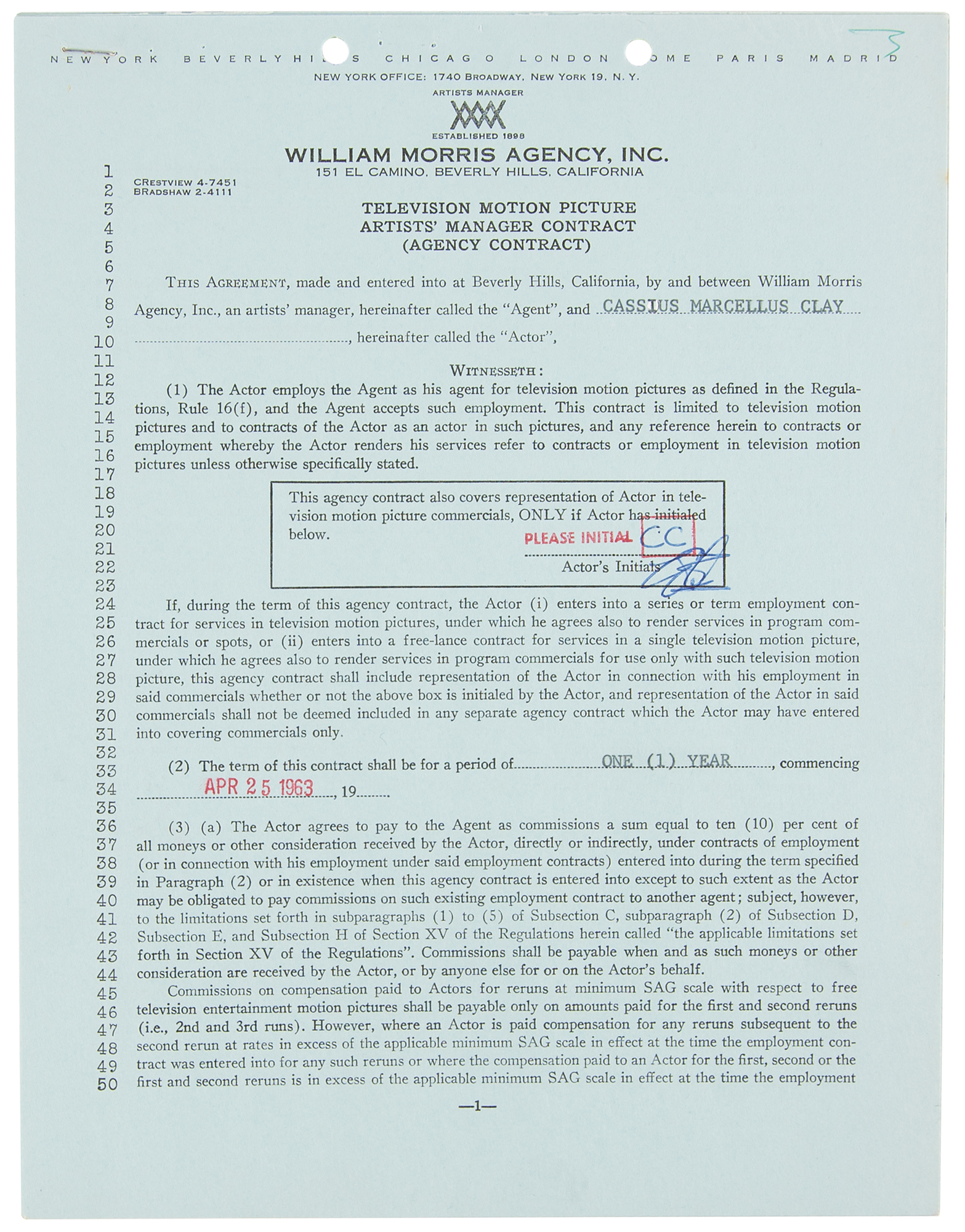 Early DS, signed “Cassius Clay,” seven pages, 8.5 x 11, April 25, 1963. Television Motion Picture Artists’ Manager Contract between “Cassius Marcellus Clay” and the William Morris Agency, with the former agreeing to hire the latter as “his agent for television motion pictures” for a period of one year. Signed at the conclusion in bold blue ballpoint by Muhammad Ali with his given name. In fine condition.
