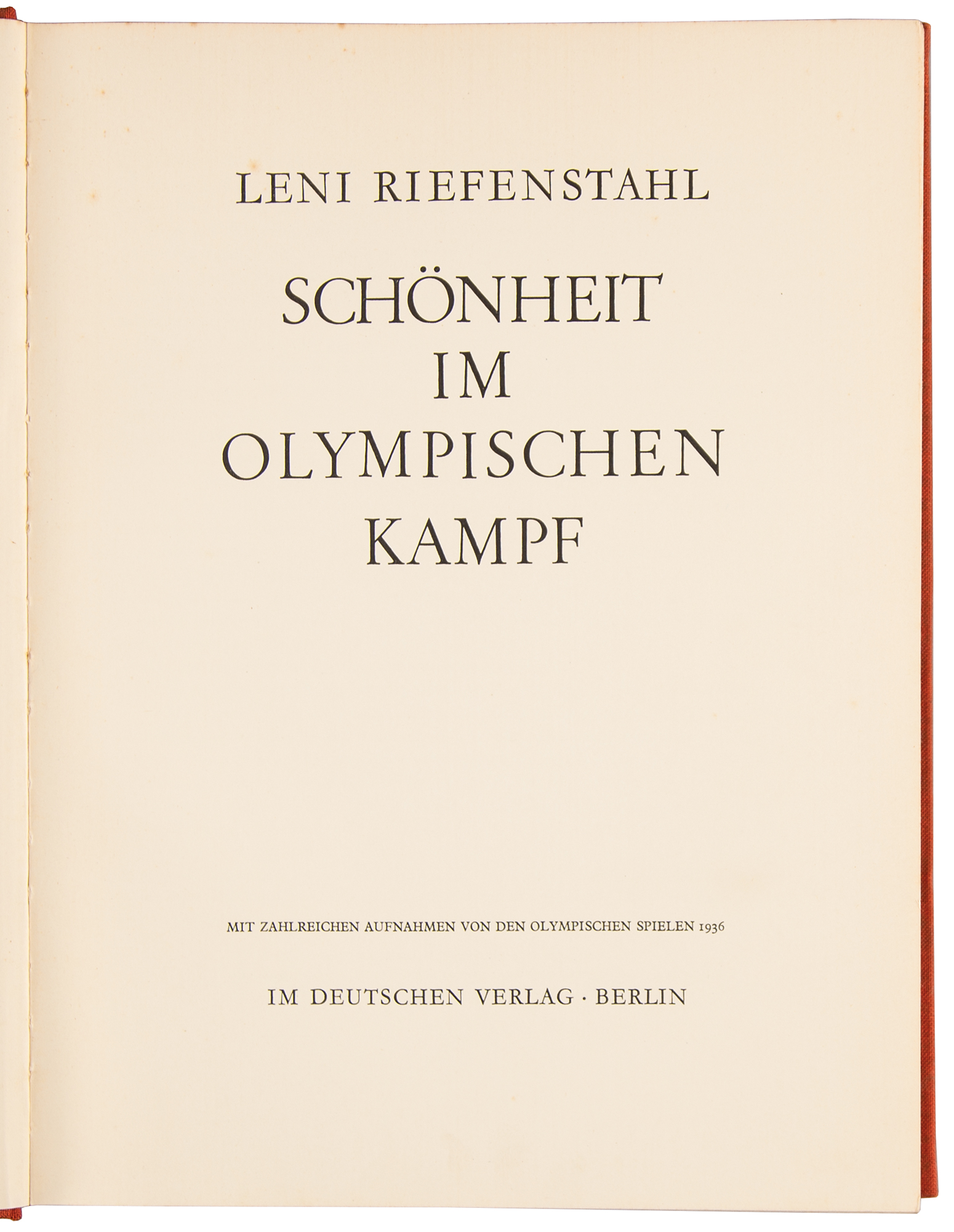 Unsigned German-language book: Schönheit im Olympischen Kampf [Beauty in the Olympic Games] by Leni Riefenstahl. First edition. Berlin, Germany: Deutschen Verlag, 1937. Cloth-bound hardcover, 9.5 x 12.5, 281 pages with 273 black-and-white photographs. The art book is heavily illustrated with full-page gravures of Riefenstahl's photographs of the Berlin 1936 Summer Olympics, beautifully portraying the athletes, ceremonies, and venues. In very good condition, with light soiling to boards and foxing to textblock edges; an image of a discus thrower has been cut from the absent dust jacket and loosely laid in.