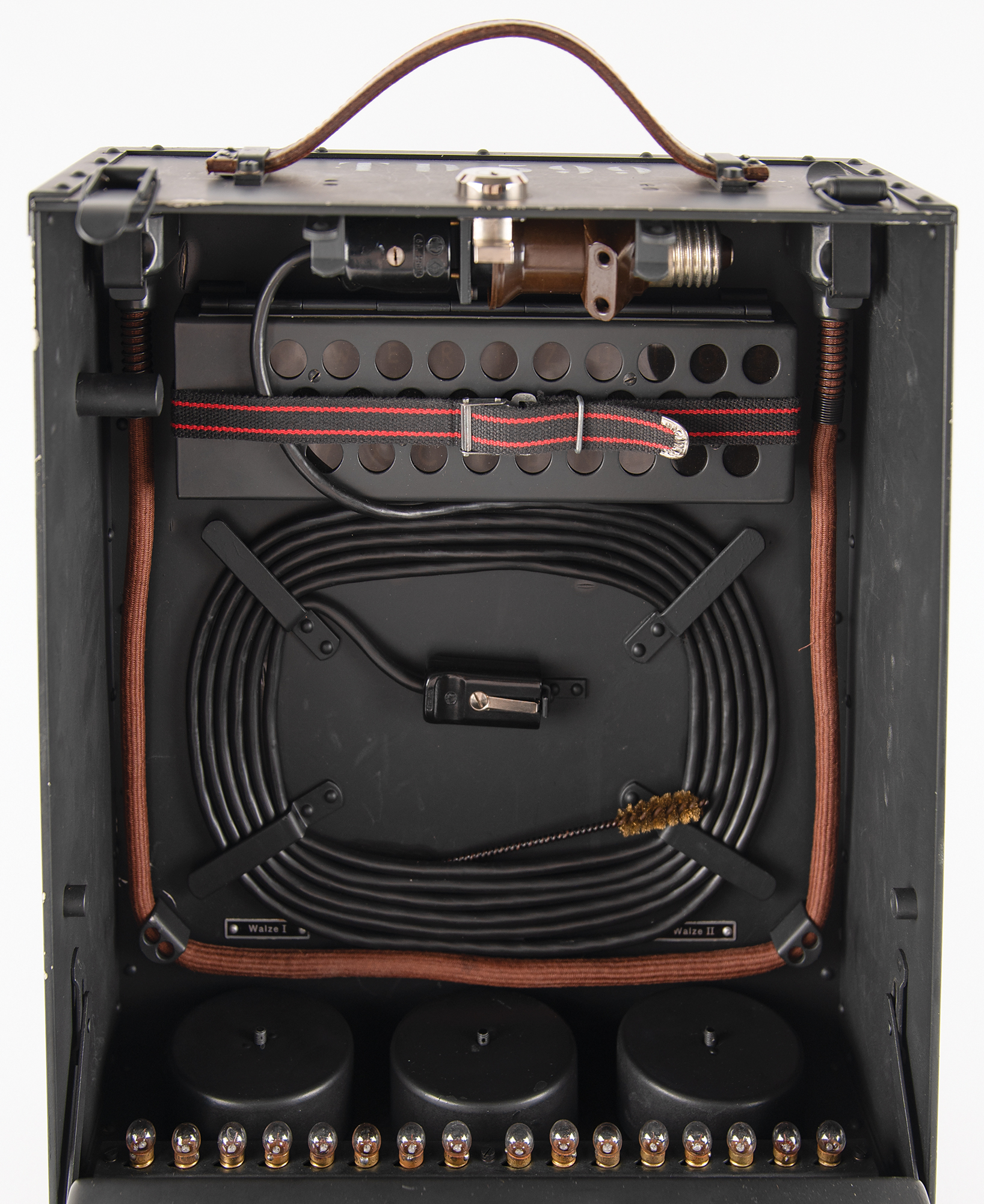 This wartime NEMA machine was stored away to be used in the event of a war—the three-language label on the lid reads (translated), "Only issue in case of war mobilization!"—and it shows only minor signs of wear. It is in very good working condition and accompanied by an operator's manual as well as two original keys to the metal NEMA carrying case. Two spare rotors are stored in the lid, and the original external power cord and external lamp panel are also included.
