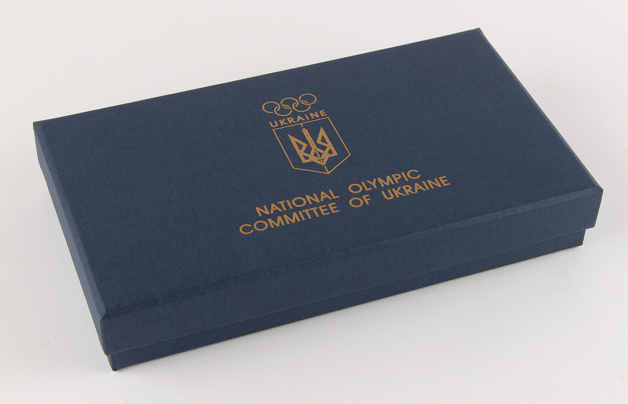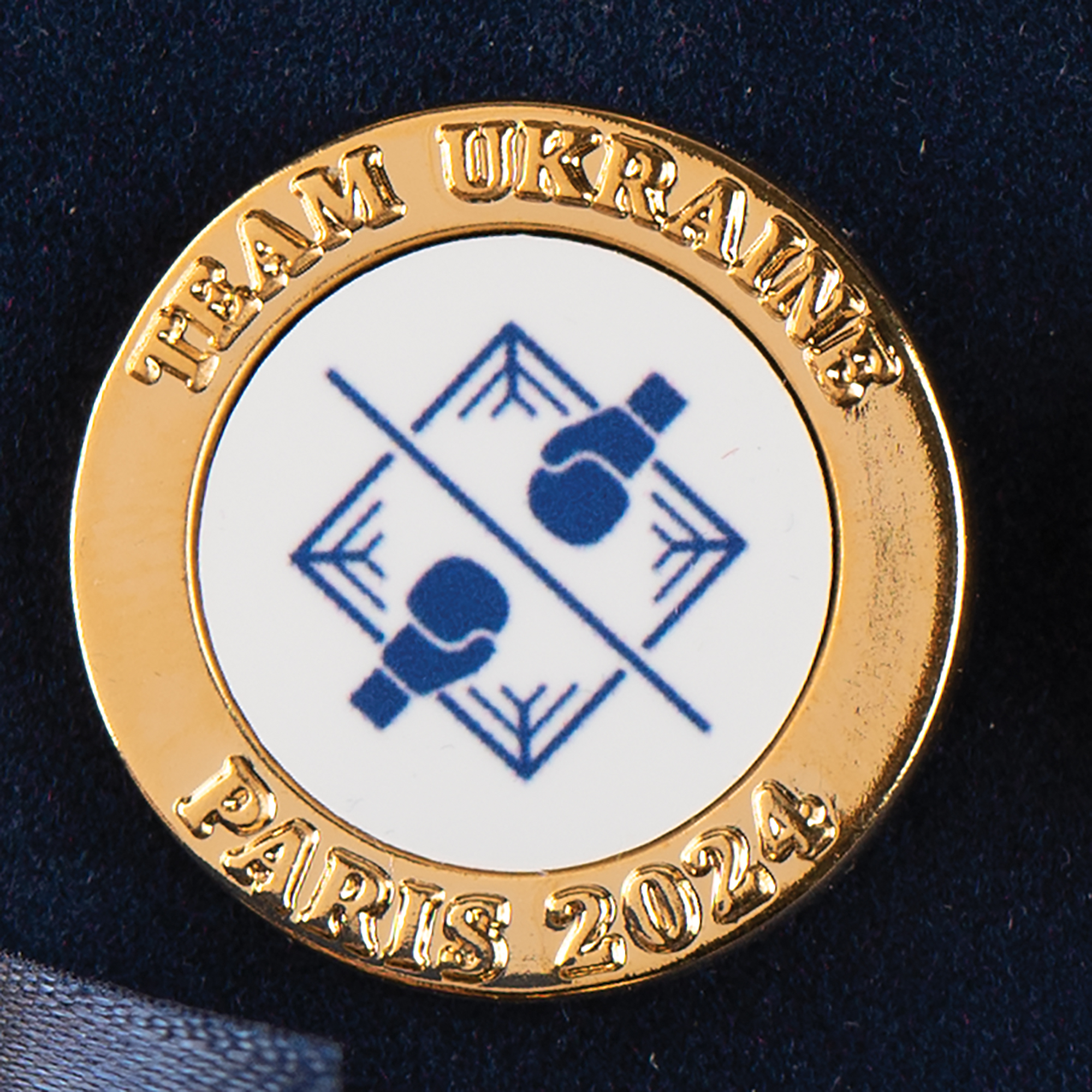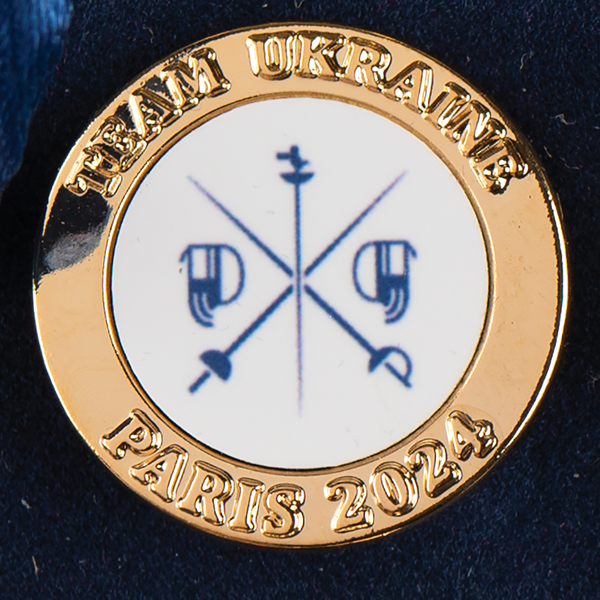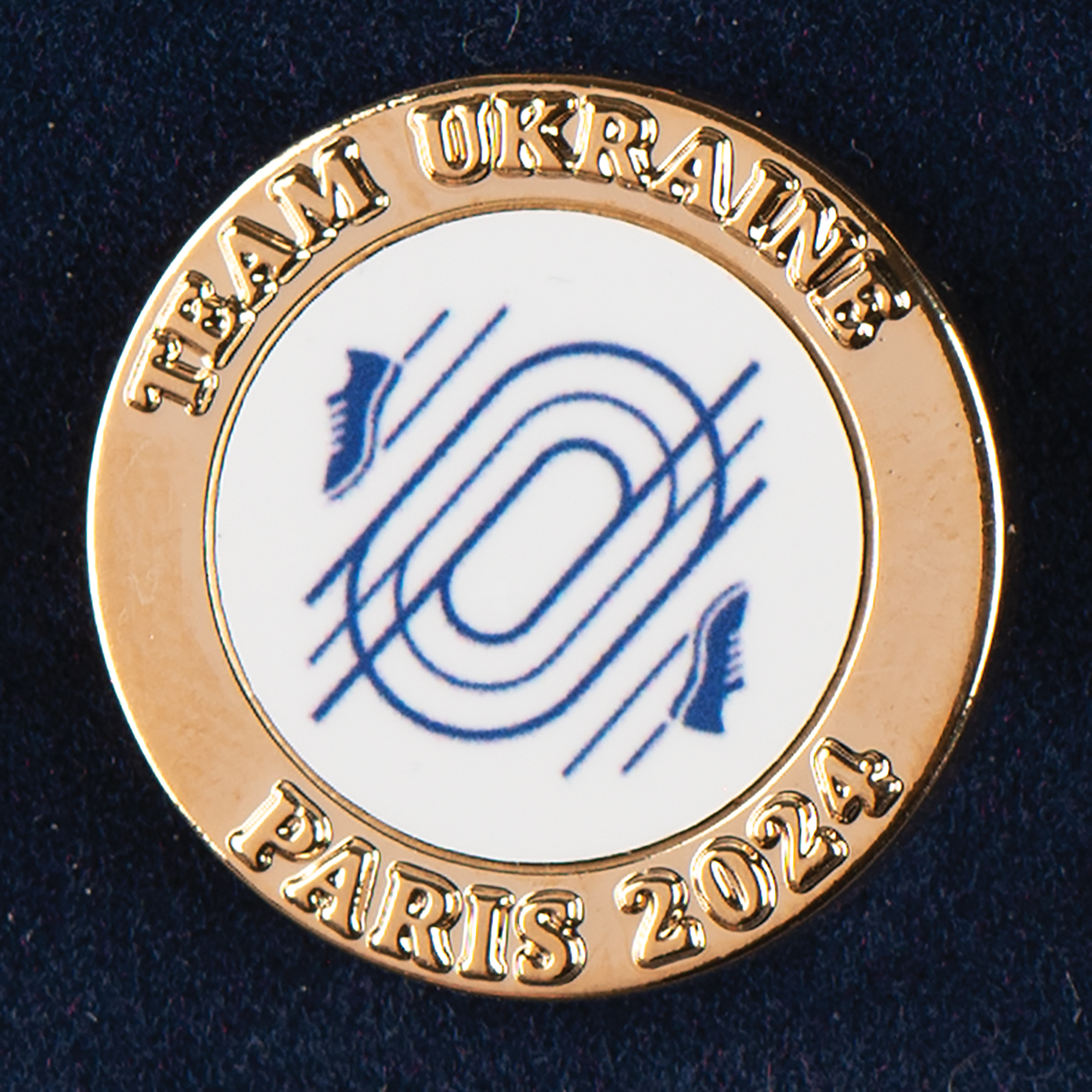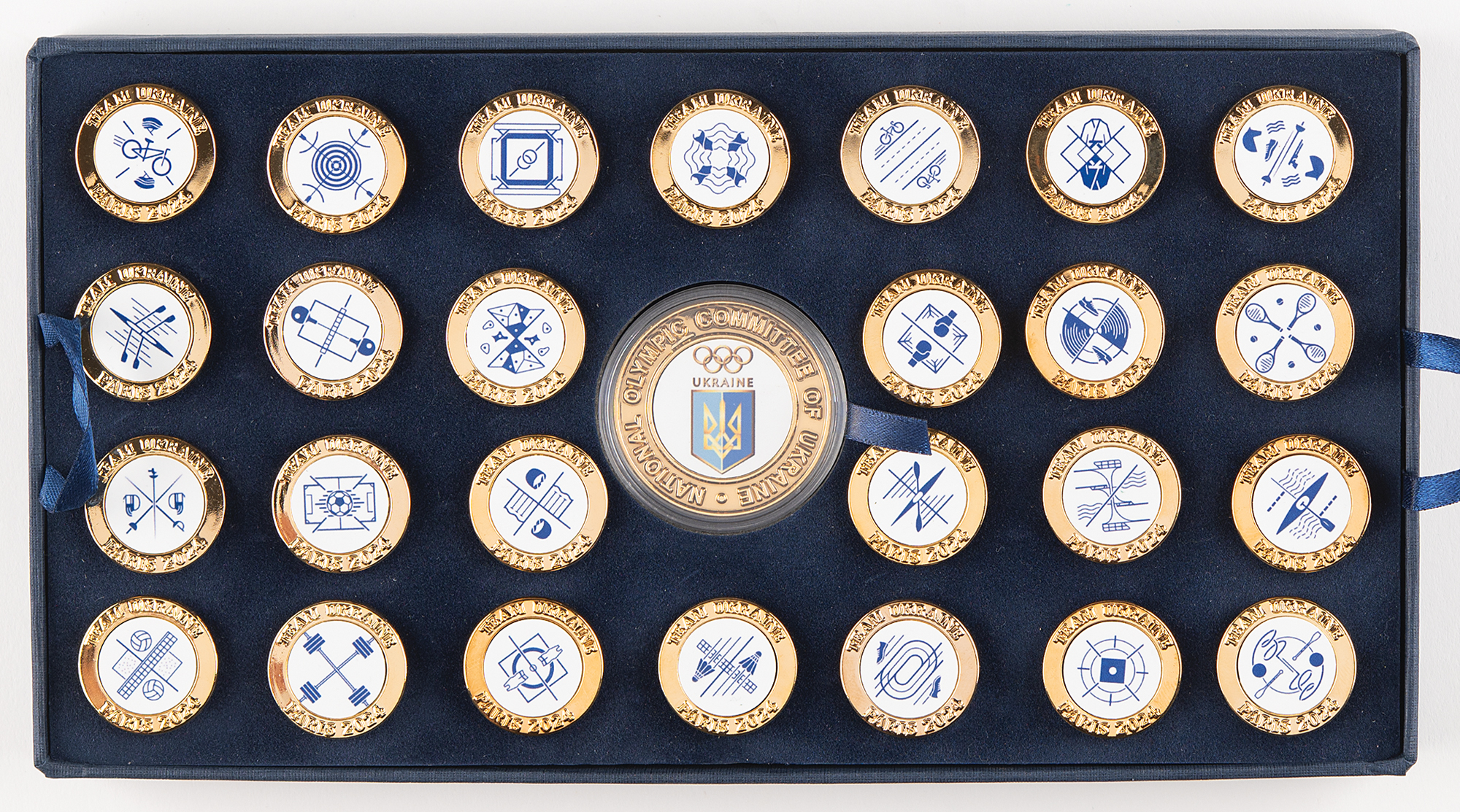 Team Ukraine pin set issued by the National Olympic Committee of Ukraine for the Paris 2024 Summer Olympics, containing 26 pins, each 25 mm in diameter, with raised text to golden border, “Team Ukraine, Paris 2024,” and the center of each featuring a different pictogram for an Olympic sport, including: archery, artistic swimming, badminton, boxing, breaking, canoeing, fencing, rowing, shooting, sport climbing, weightlifting, and more. Includes its original presentation box, which also contains a gold-tone 38 mm National Olympic Committee of Ukraine medallion.