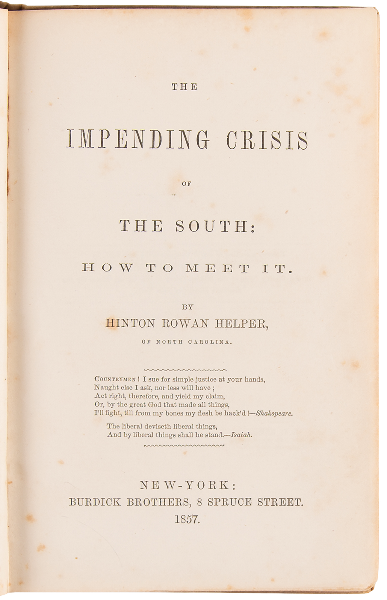 Influential first edition book: The Impending Crisis of the South: How to Meet It by Hinton Rowan Helper. First edition. NY: Burdick Brothers, 1857. Hardcover, 5.25 x 7.75, 420 pages. In very good condition, with sunning and rubbing to spine and boards, wear to corners, some foxing to textblock, contemporary presentation inscriptions to endpapers, and evidence of a removed bookplate to front pastedown.