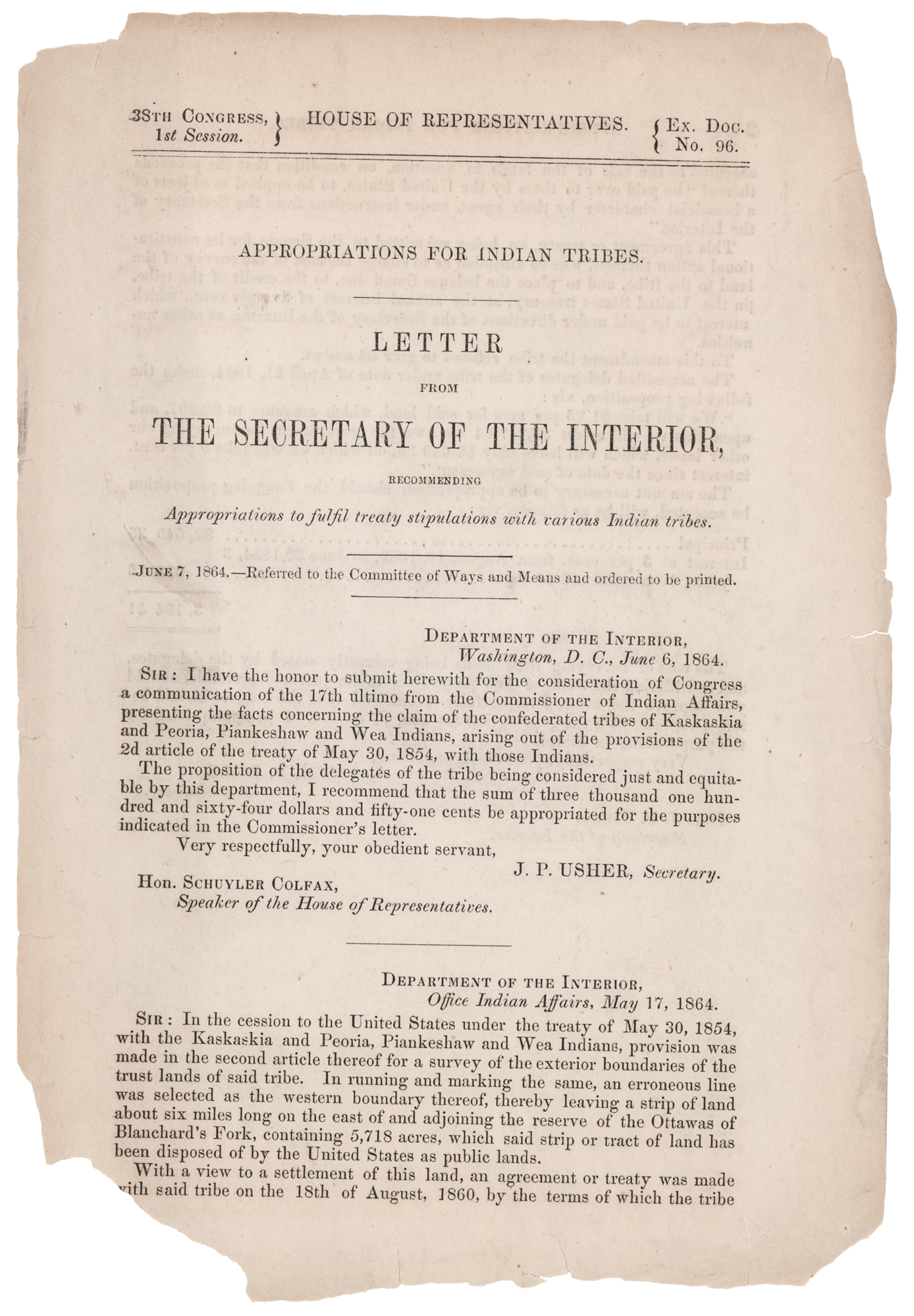 Official printing of "Ex. Doc. No. 96" from the 38th Congress, 1st Session, one page both sides, 6 x 9.5, containing a "Letter from the Secretary of the Interior recommending Appropriations to fulfil treaty stipulations with various Indian tribes," June 6, 1864. Includes the text of Secretary of the Interior J. P. Usher's letter to Speaker of the House Schuyler Colfax, enclosing a communication from Commissioner of Indian Affairs William P. Dole, recommending appropriations to satisfy "the claim of the confederated tribes of Kaskaskia and Peoria, Piankeshaw and Wea Indians." In very good condition, with edge tears and paper loss.