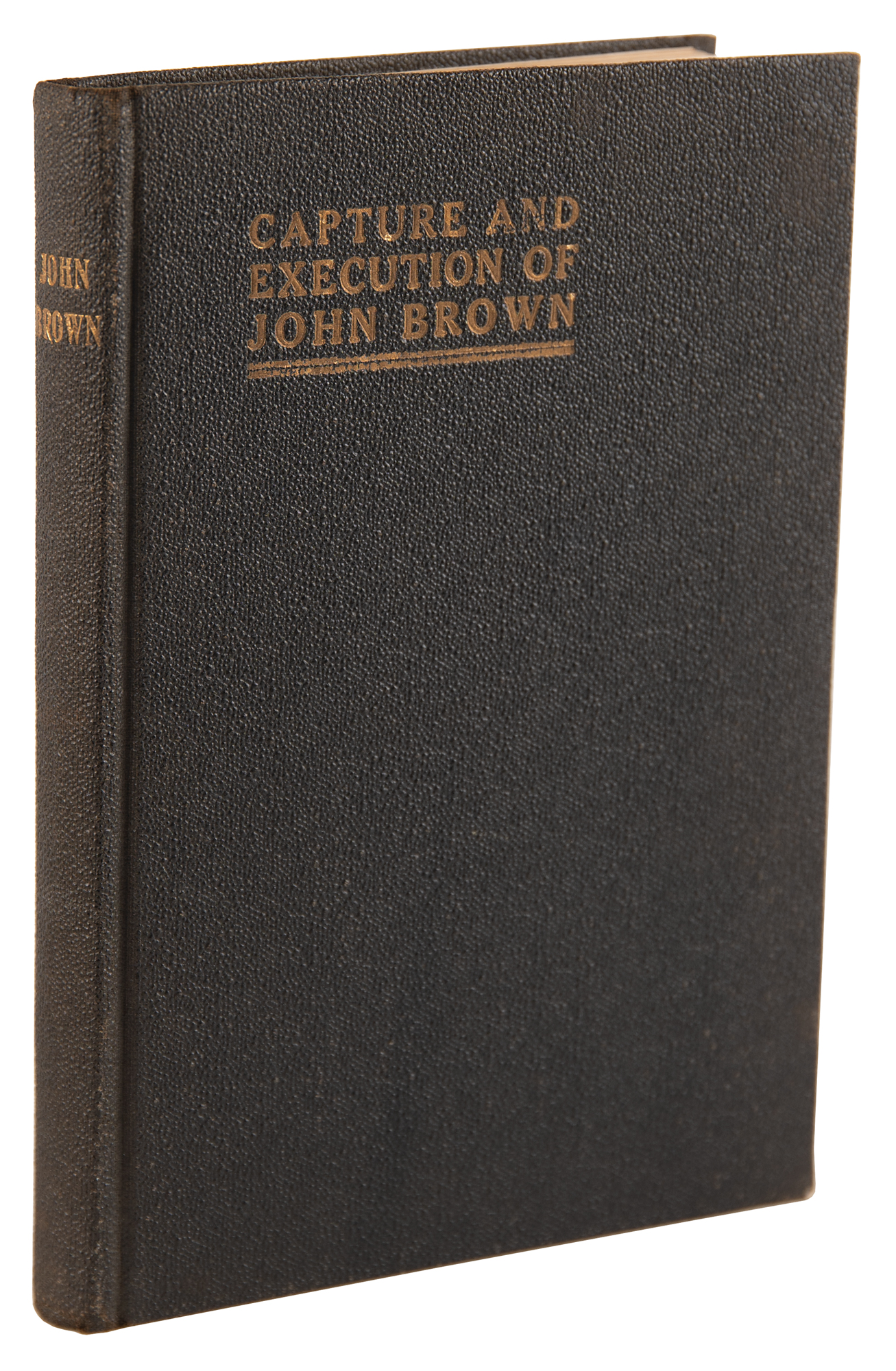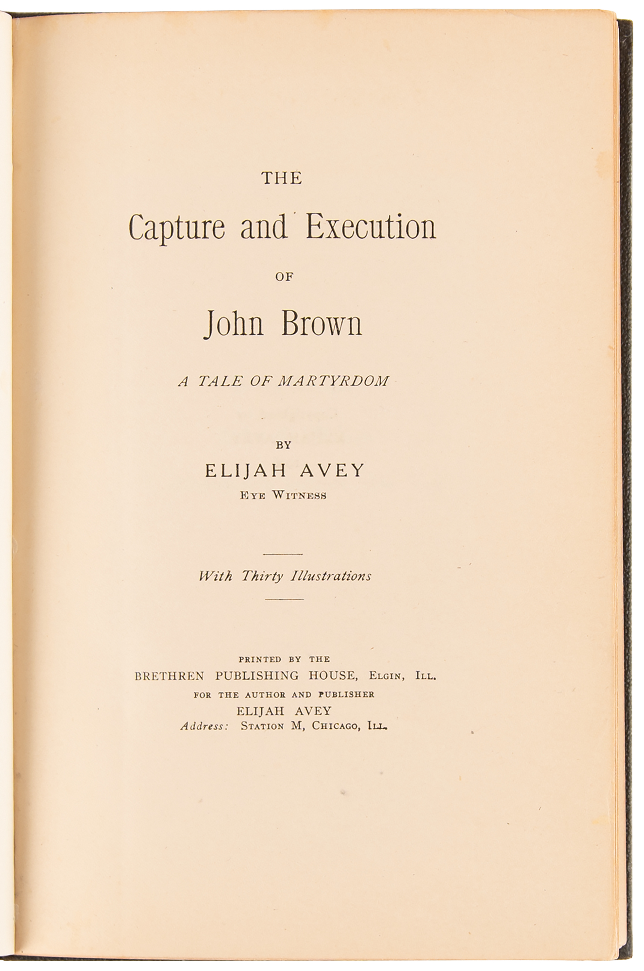 Uncommon book: The Capture and Execution of John Brown: A Tale of Martyrdom by Elijah Avey. Elgin, IL: Brethren Publishing House, 1906. Hardcover, 5.5 x 7.75, 152 pages. Avey offers a firsthand, eyewitness account of the events surrounding John Brown’s failed raid on Harpers Ferry in 1859. The book presents Brown as a martyr for the abolitionist cause, emphasizing his courage, convictions, and ultimate sacrifice. In very good to fine condition, with a presentation inscription by "S. H. Avey" and related notations to first free end page, tape stains to dedication page, and a few stains to interior pages.
