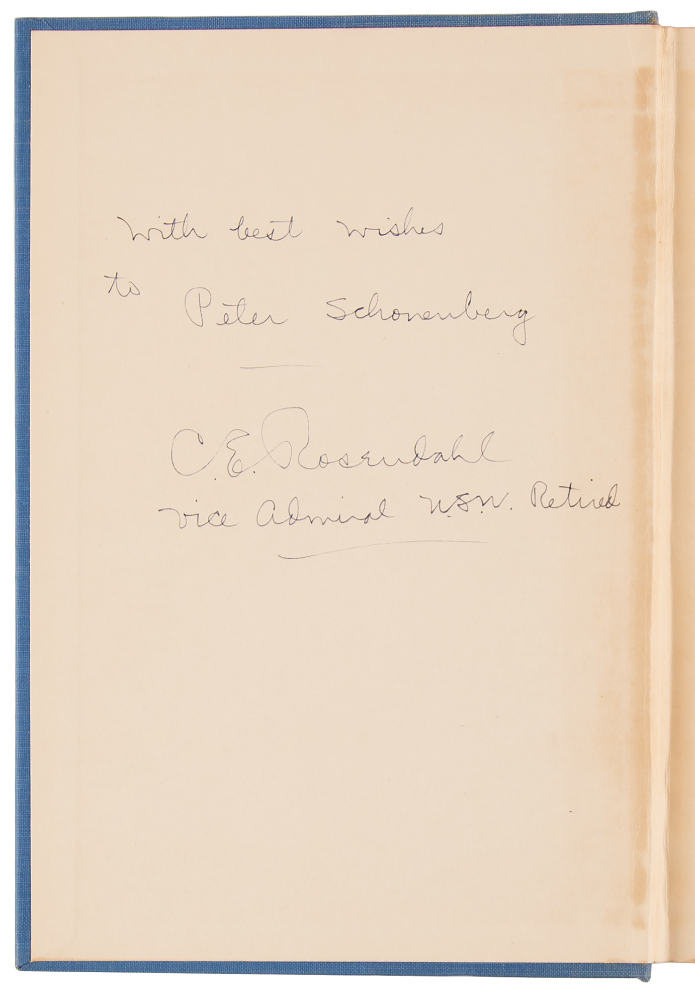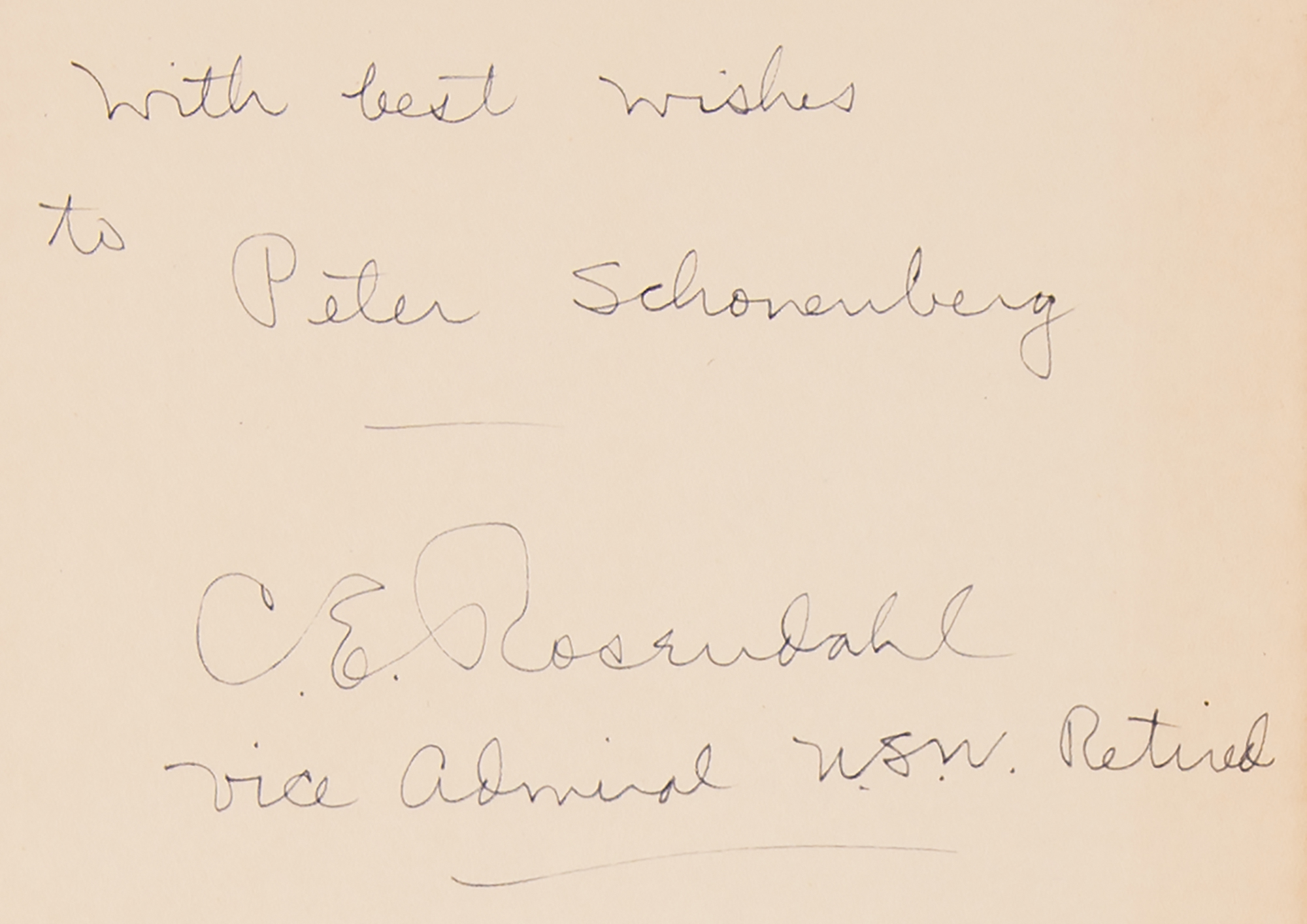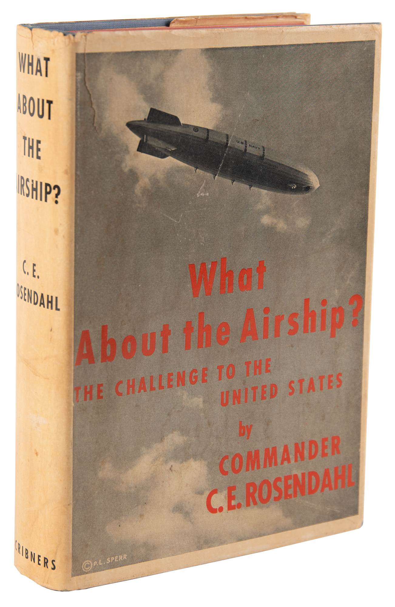 Vice admiral in the United States Navy (1892–1977) remembered as an advocate of lighter-than-air flight; he was in command of NAS Lakehurst at the time of the destruction of the Hindenburg and witnessed the disaster. Signed book: What About the Airship?: The Challenge to the United States. First edition. NY: Charles Scribner's Sons, 1938. Hardcover with dust jacket, 6 x 8.5, 437 pages. Signed and inscribed on the front pastedown in fountain pen, "With best wishes to Peter Schonenberg, C. E. Rosendahl, Vice Admiral U.S.N. Retired." In fine condition, with light staining and toning to the dust jacket.