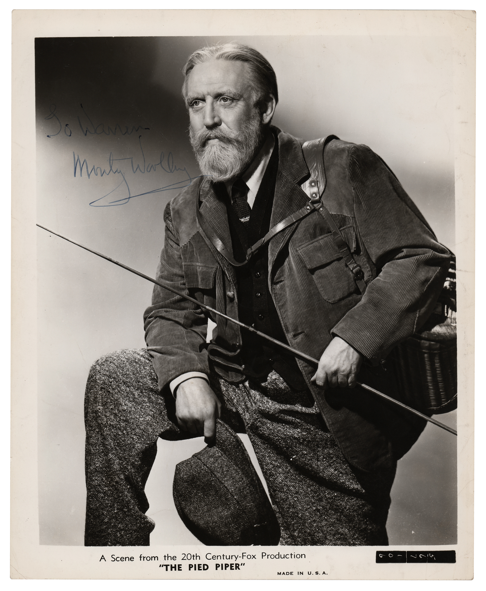 American stage, film, radio, and television actor (1888–1963) who is best remembered for his role in The Man Who Came to Dinner. His distinctive white beard was his trademark and he was affectionately known as 'The Beard.' Vintage glossy 8.25 x 10 Twentieth Century Fox publicity photo of Woolley for the 1942 film The Pied Piper, signed and inscribed in fountain pen, "To Warren, Monty Woolley.” In very good to fine condition, with scattered creasing and surface impressions.