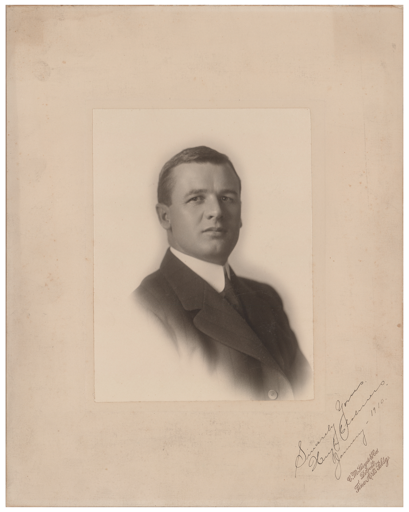 Founder (1873–1932) of the Chalmers Motor Company headquartered in Detroit, Michigan, which started in 1908 and continued production of high-end vehicles until 1923 when it merged with Chrysler. Vintage matte-finish 6 x 8 photo of Hugh Chalmers in a distinguished bust-length pose, affixed to the original 10.75 x 13.75 C. M. Hayes & Co. studio mount, signed on the mount in black ink, "Sincerely yours, Hugh Chalmers, January–1910." In very good to fine condition, with light soiling and toning to the mount.