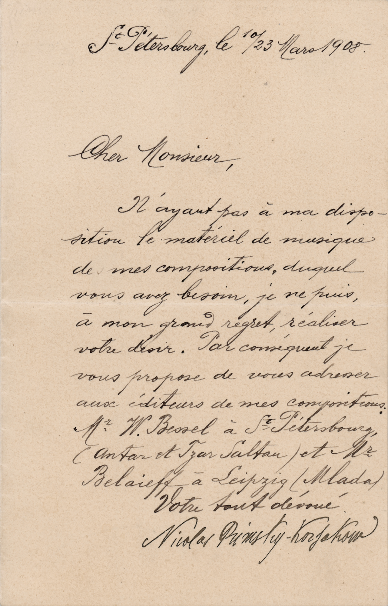 Eminent Russian composer (1844-1908) best known for such brilliantly orchestrated works as Scheherazade and for operatic staples like Sadko, The Tale of Tsar Saltan, and The Golden Cockerel. LS in French, one page, 4.25 x 6.75, March 23, 1908. Addressed from St. Petersburg, a handwritten letter from Nikolai Rimsky-Korsakov, penned three months before his death on June 21, 1908. In full (translated): “As I do not have at my disposal the musical material of my compositions which you need, I regret greatly that I cannot comply with your request. Consequently, I suggest you should apply to the publishers of my compositions: Mr. W. Bessel at St. Petersburg, (Antar and Tsar Sultan) and Mr. Belaieff at Leipzig (Mlada).” In fine condition.