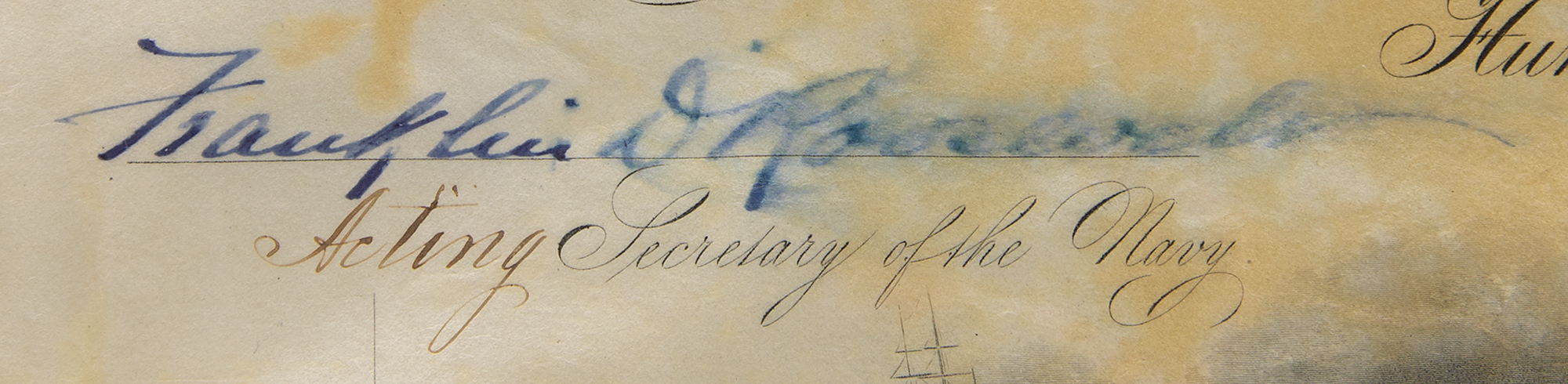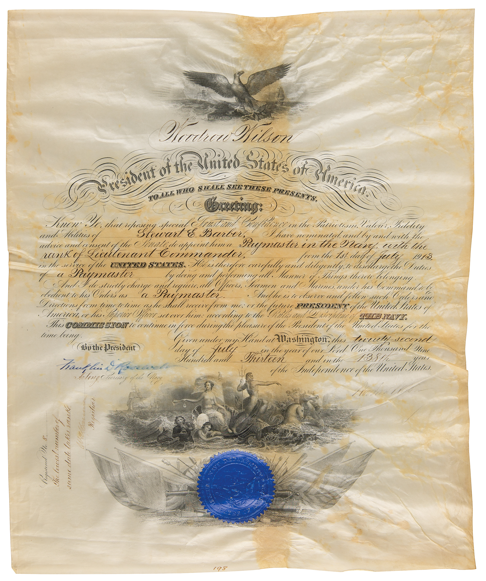 Partly-printed vellum DS, signed “Woodrow Wilson” as president and "Franklin D. Roosevelt" as acting secretary of the Navy, one page, 15.25 x 18.5, July 22, 1913. President Wilson appoints Stewart E. Barber as a "Paymaster in the Navy, with the rank of Lieutenant Commander." Signed at the conclusion by Woodrow Wilson and countersigned by Acting Secretary of the Navy Franklin D. Roosevelt. The bottom vignette retains the original blue embossed Navy Department seal. Rolled and in good to very good condition, with heavy wrinkling, and dampstaining blurring the end of Roosevelt's signature and rendering Wilson's signature extremely light.