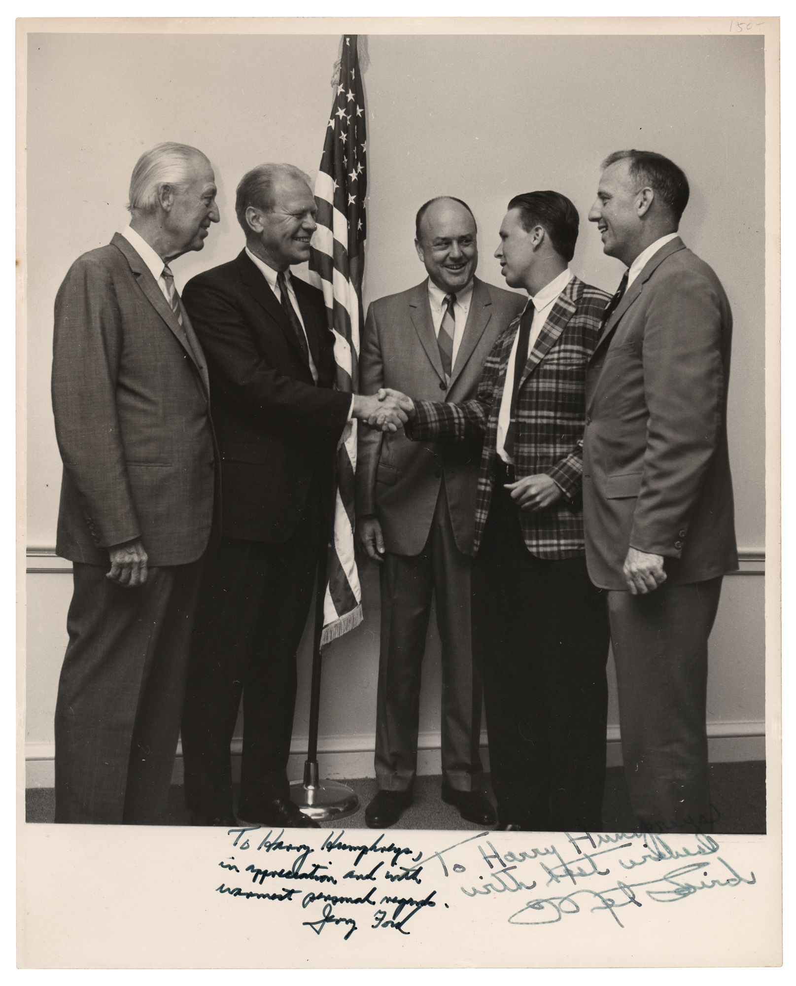 Glossy 8 x 10 group photo of Gerald Ford standing with three other men, including Illinois Congressman Leslie Arends and Wisconsin Congressman Mel Laird, as they congratulate a young man, signed and inscribed in the lower border in black felt tip, “To Harry Humphreys, in appreciation and with warmest personal regards, Jerry Ford.” The photo is also signed by Laird. In fine condition, with a few light creases.