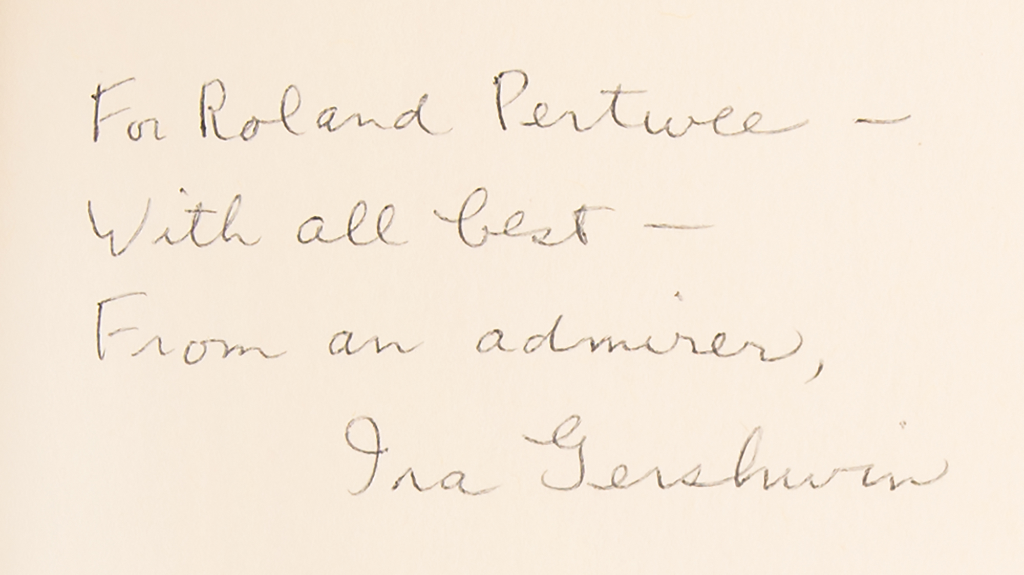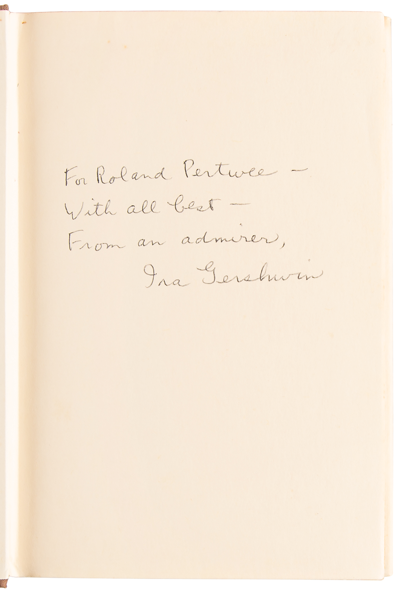 Signed book: Lyrics on Several Occasions. First edition. NY: Alfred A. Knopf, 1959. Hardcover with dust jacket, 6 x 8.75, 362 pages. Signed and inscribed on the first free end page in black ballpoint, "For Roland Pertwee—With all best—From an admirer, Ira Gershwin.". In fine condition, with light sunning to the dust jacket spine.