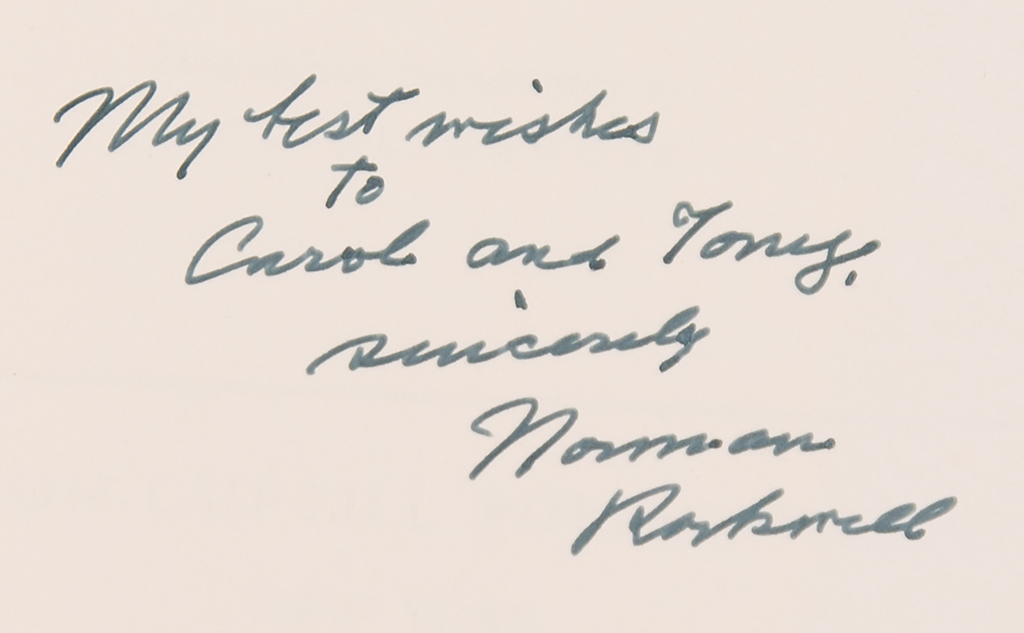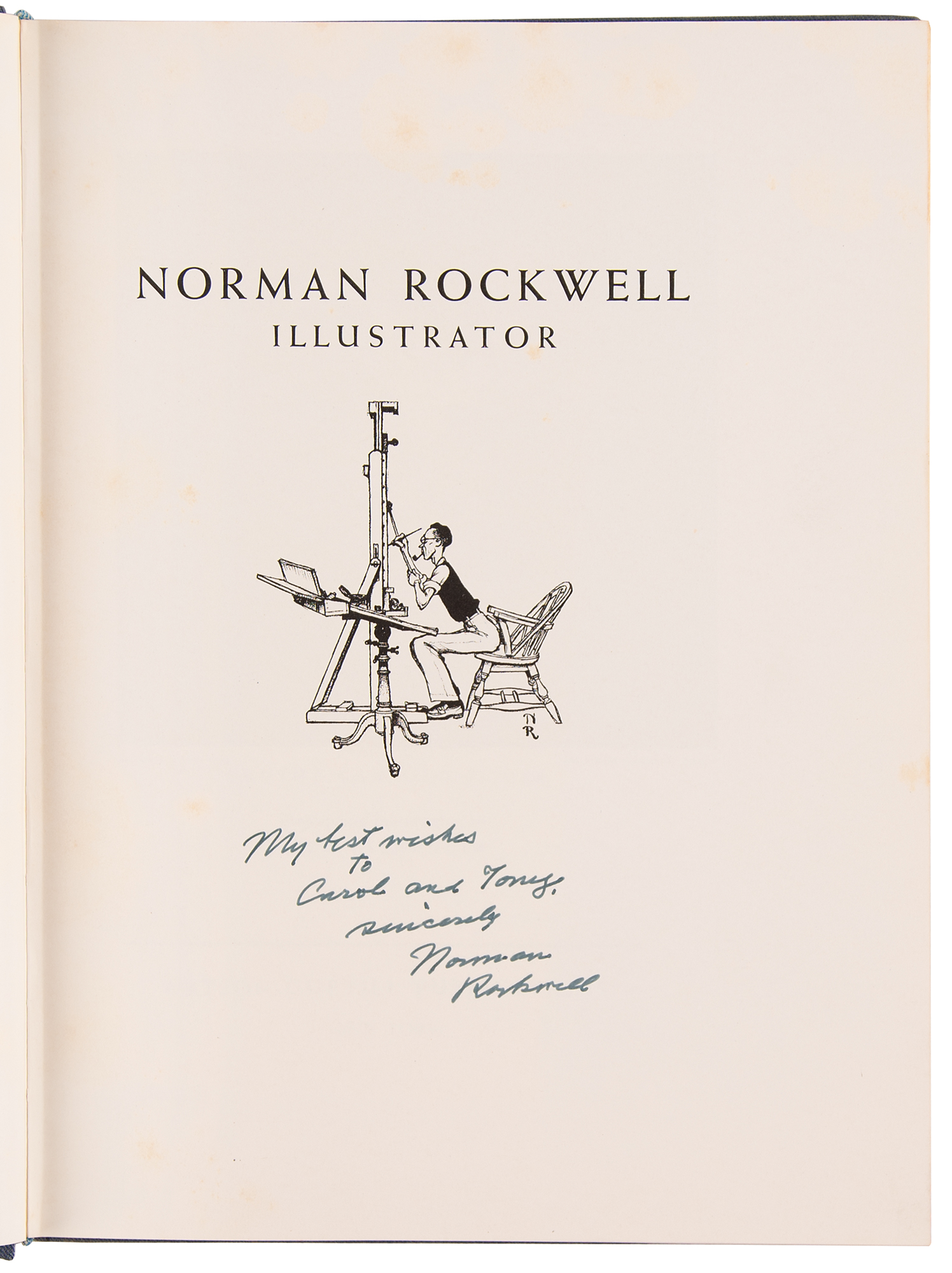 Signed book: Norman Rockwell: Illustrator. Later printing. NY: Watson-Guptill Publications, 1972. Hardcover with slipcase, 9 x 12, 208 pages. Signed and inscribed on the half-title page in ink, "My best wishes to Carol and Tony, sincerely, Norman Rockwell." In very good to fine condition, with heavy sunning to the spine, faint staining to the signed page, and light foxing to textblock.